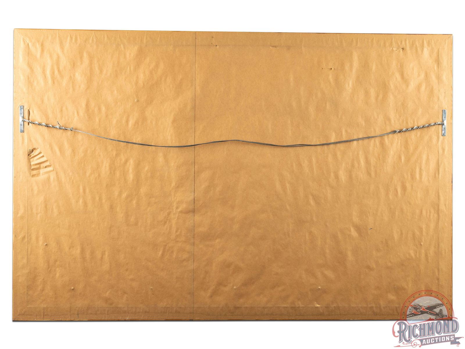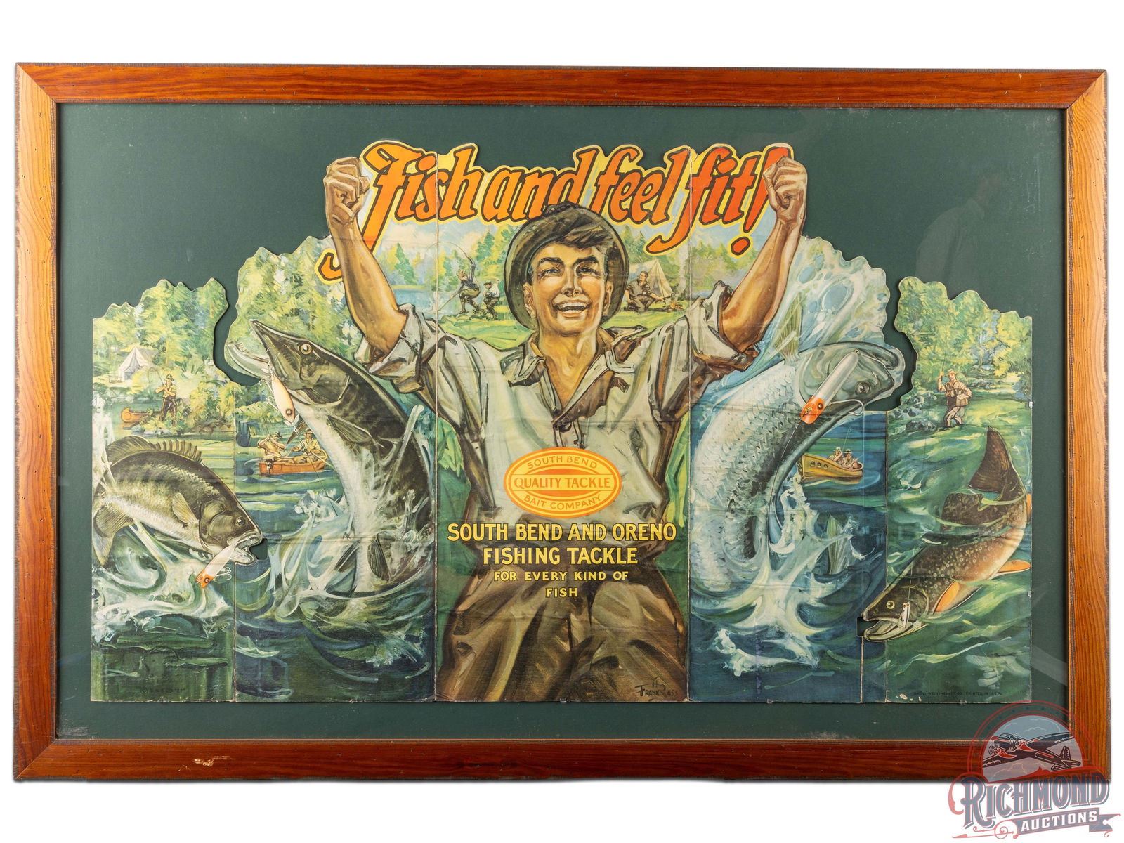 Very rare five panel South Bend & Oreno Fishing Tackle folding die cut cardboard sign with excellent color and graphics, featuring scenes by renowned artist Frank Ross. Presents very well with typical age wear including some horizontal wrinkling/creasing in each panel and general edge wear. Top die cut lettering has some repair, creasing and loss in "Feel Fit!" Lower right corner has very small areas of surface loss. Overall, this is a very good example of a seldom sign piece of advertising from South Bend Bait Co. Professionally framed under glass, each panel is secured to the frame. Sign measures 29.5" H x 49.5" W. Marked SBB Co "27", Magill-Weinsheimer Co. Printed in USA. 38" H x 58" W.