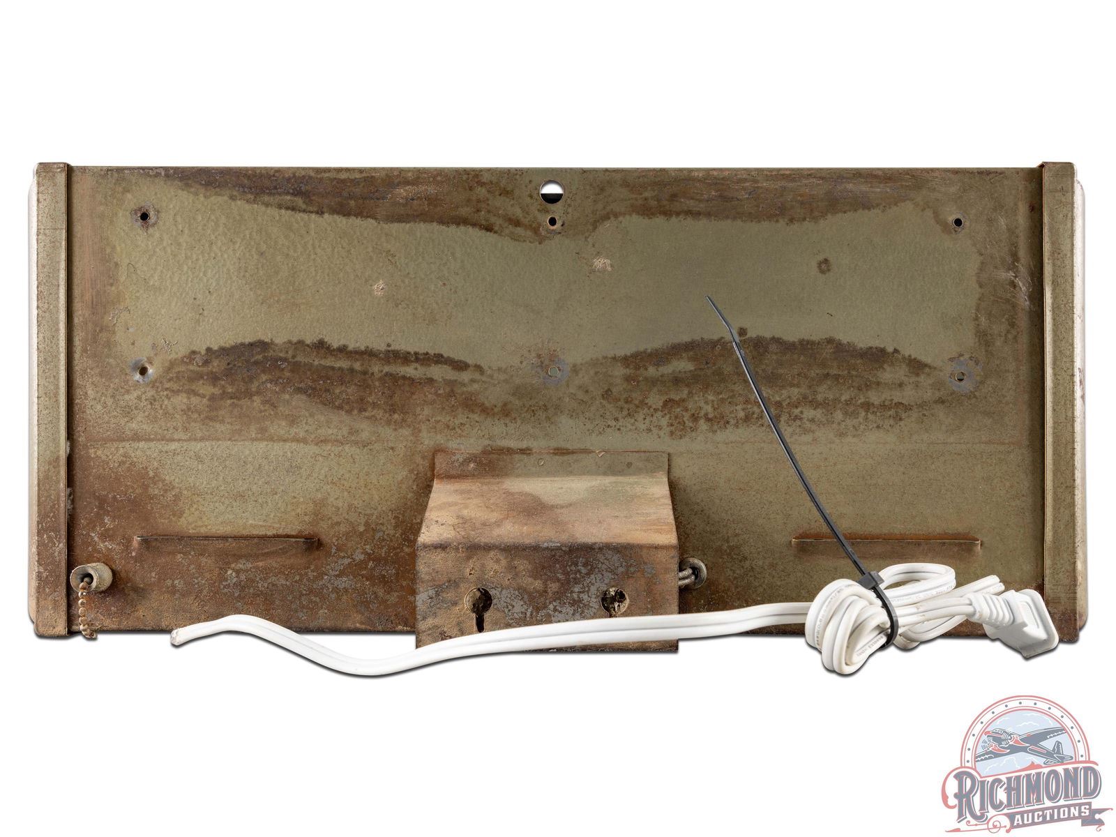 Single sided lighted countertop sign with a great Native American and arrow graphic. Sign lights and works as it should with pull chain and modern plug. Metal can exhibits general wear, age toning and oxidation. The face panel is plexiglass and an older reproduction. Overall, the sign has great colors and clear graphics. 8.5" H x 19" W x 2.5" D.