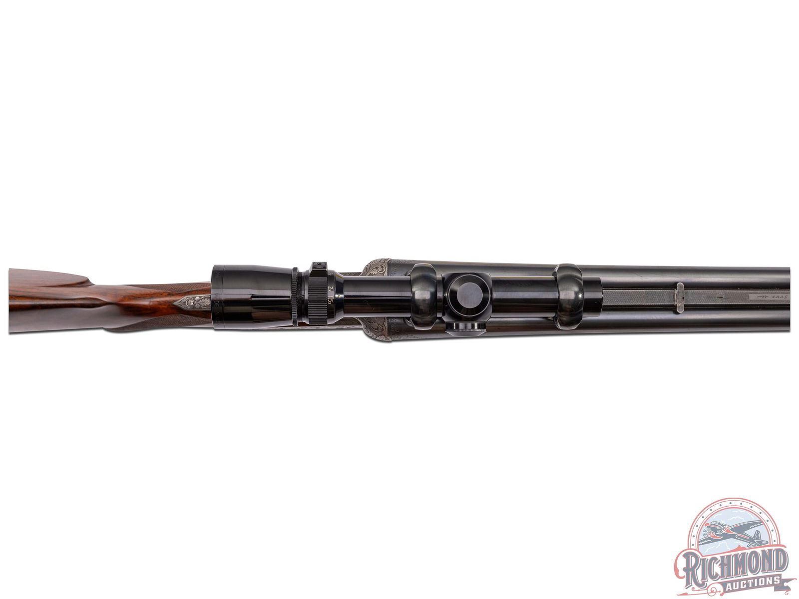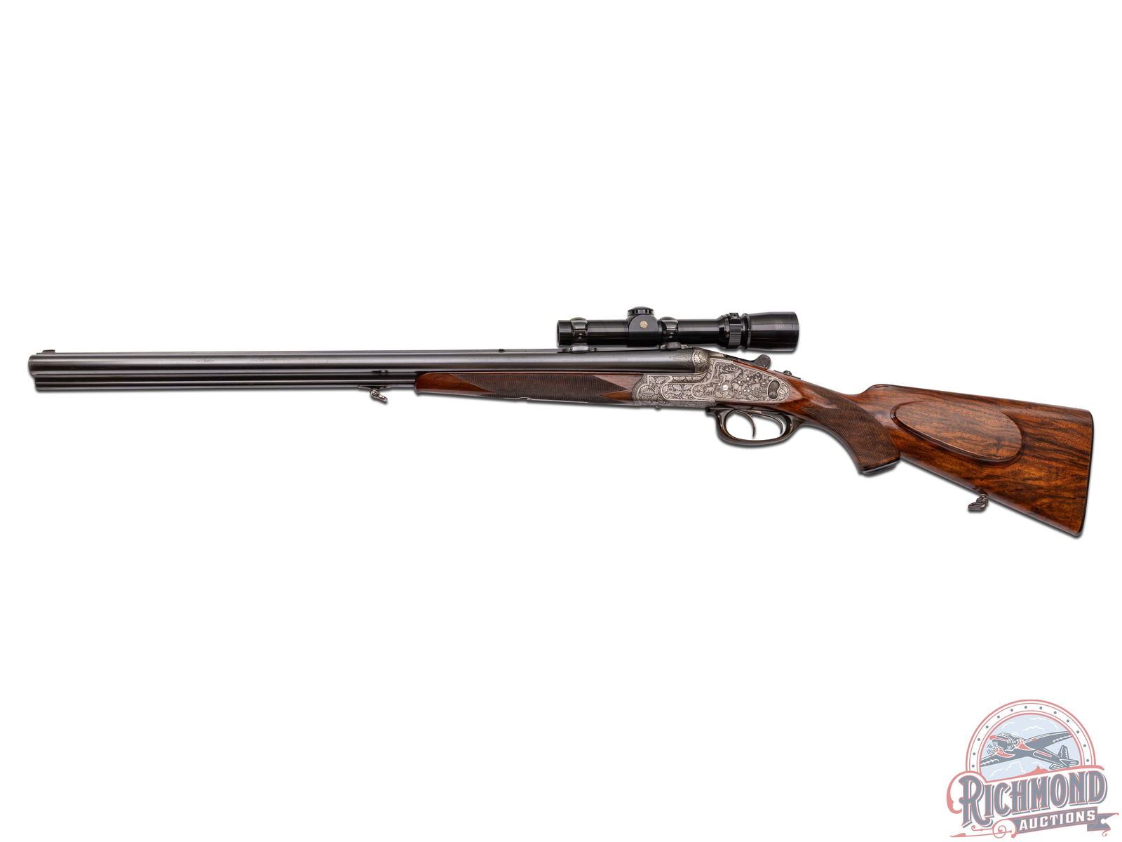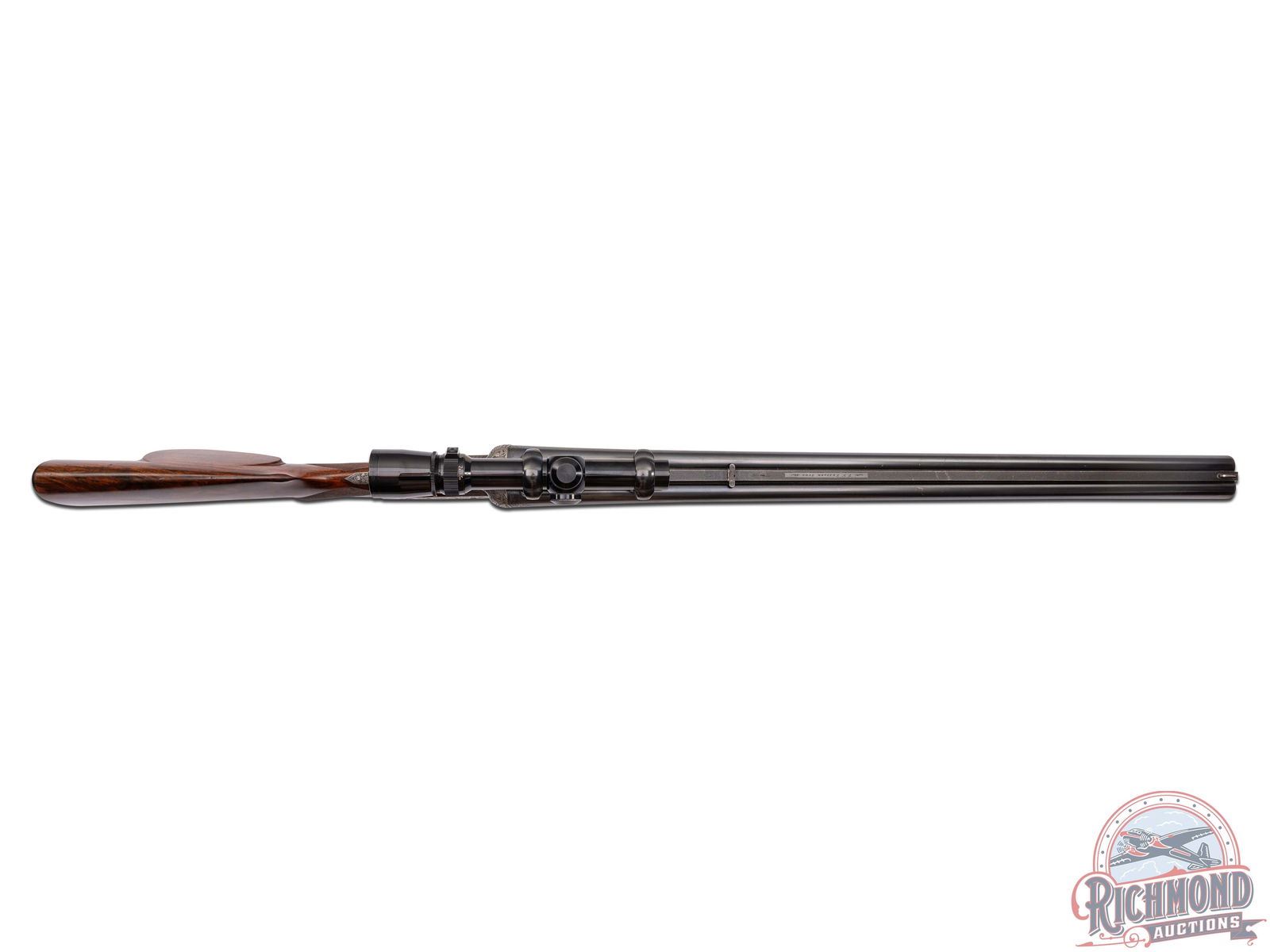 Manufactured in Suhl, Germany in 1942 by Friedrich Wil Helm Kessler. Features 24-3/8" blued Krupp steel barrels with Nazi-Era proof marks, raised matted rib, rifle sights and extractors. 16 gauge side by side barrels over 8x57 JR caliber rifle. Barrels have 2-9/16" chambers with Full and Modified chokes. Splinter forearm with latch release. Full game scene engraved coin finished sidelock action with sideclips. Greener style safety and crossbolt, cocking indicators and top tang rifle selector. Action is controlled by double triggers (front being a set) with a horn trigger guard. Action is engraved with a buck and fox scene on right and Hirsch scene on left with "F.W. Kessler / Suhl" on bottom surrounded by oak leaf pattern. Fine checkered pistol grip walnut stock with right hand cheekpiece, horn butt plate, and grip cap and bow type sling swivel. Equipped with a claw mounted Leupold 1.5-5x Scope. LOP: 13-3/4". DAC: 1-1/4". DAH: 1-1/2". CALIBER: 16x16 / 8x57 JR. S/N: 35791. FFL STATUS: Curio & Relic.