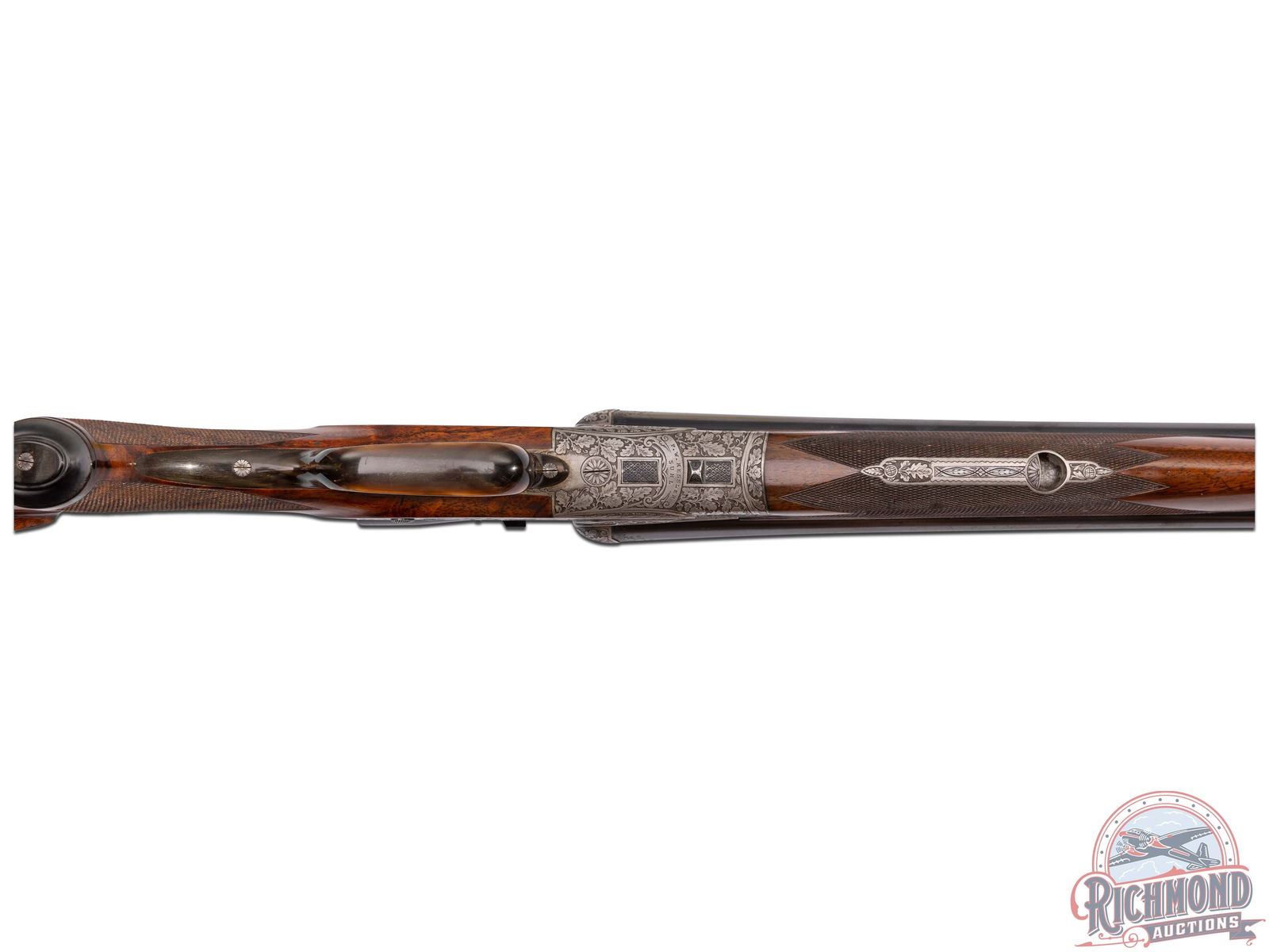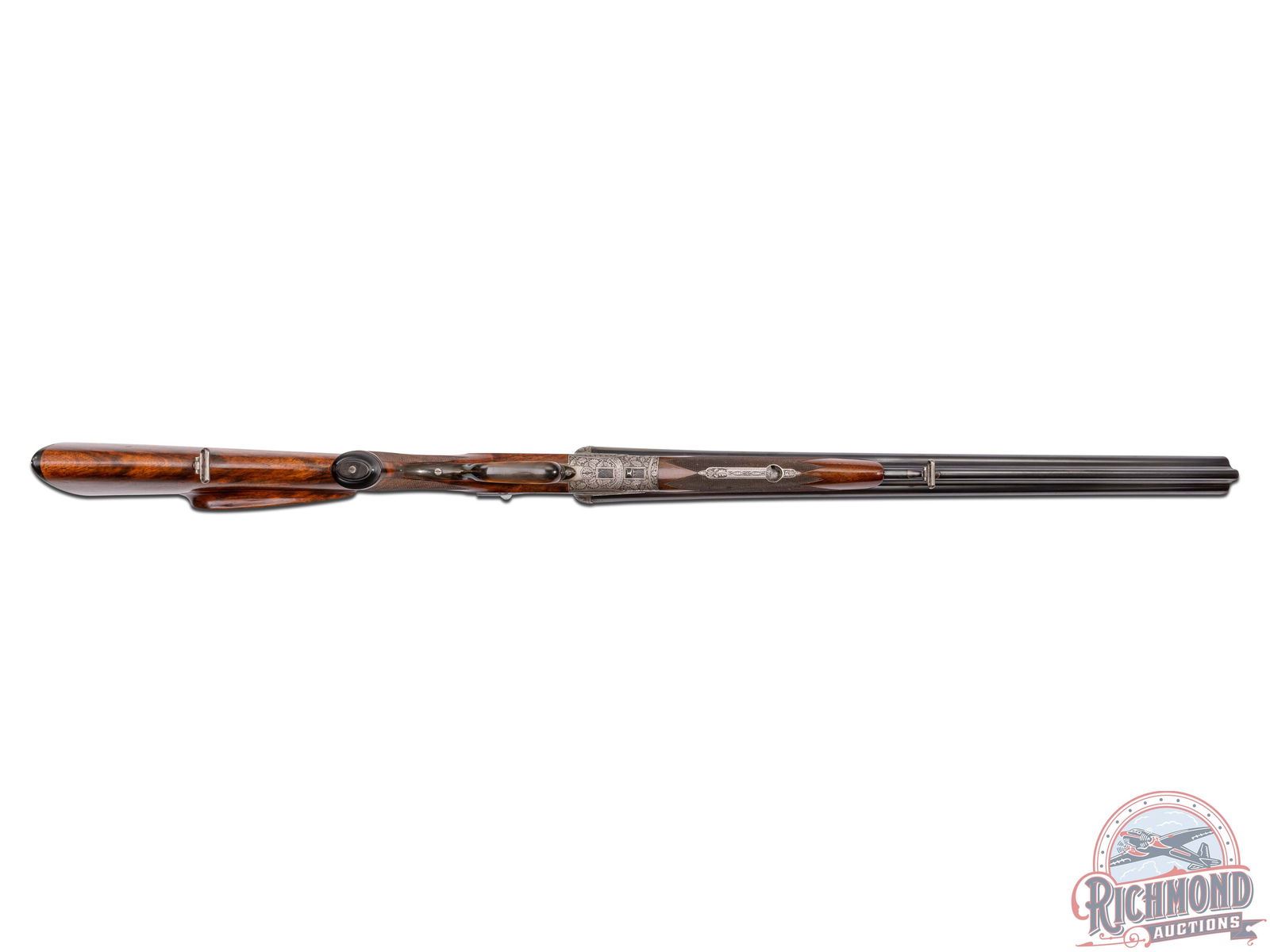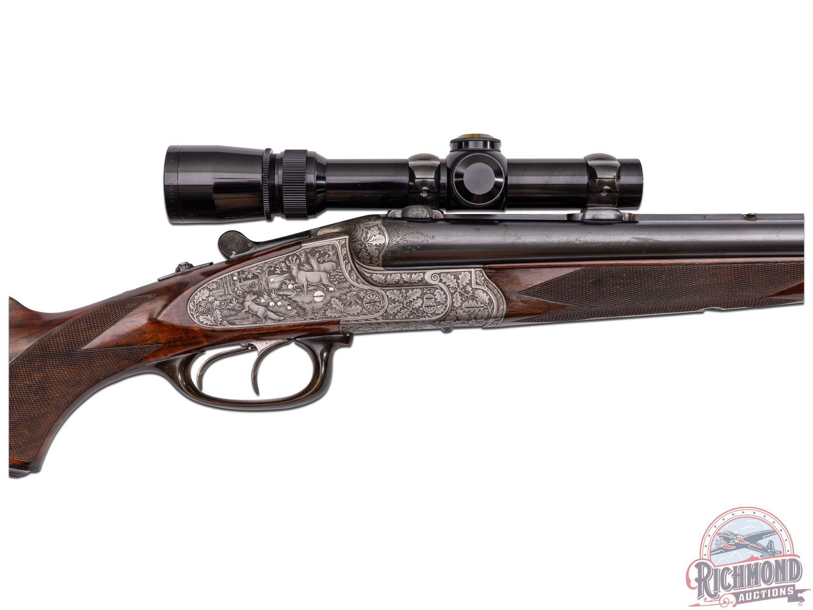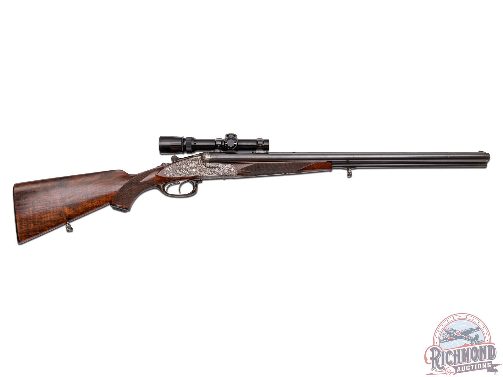 Manufactured in Suhl, Germany in 1942 by Friedrich Wil Helm Kessler. Features 24-3/8" blued Krupp steel barrels with Nazi-Era proof marks, raised matted rib, rifle sights and extractors. 16 gauge side by side barrels over 8x57 JR caliber rifle. Barrels have 2-9/16" chambers with Full and Modified chokes. Splinter forearm with latch release. Full game scene engraved coin finished sidelock action with sideclips. Greener style safety and crossbolt, cocking indicators and top tang rifle selector. Action is controlled by double triggers (front being a set) with a horn trigger guard. Action is engraved with a buck and fox scene on right and Hirsch scene on left with "F.W. Kessler / Suhl" on bottom surrounded by oak leaf pattern. Fine checkered pistol grip walnut stock with right hand cheekpiece, horn butt plate, and grip cap and bow type sling swivel. Equipped with a claw mounted Leupold 1.5-5x Scope. LOP: 13-3/4". DAC: 1-1/4". DAH: 1-1/2". CALIBER: 16x16 / 8x57 JR. S/N: 35791. FFL STATUS: Curio & Relic.