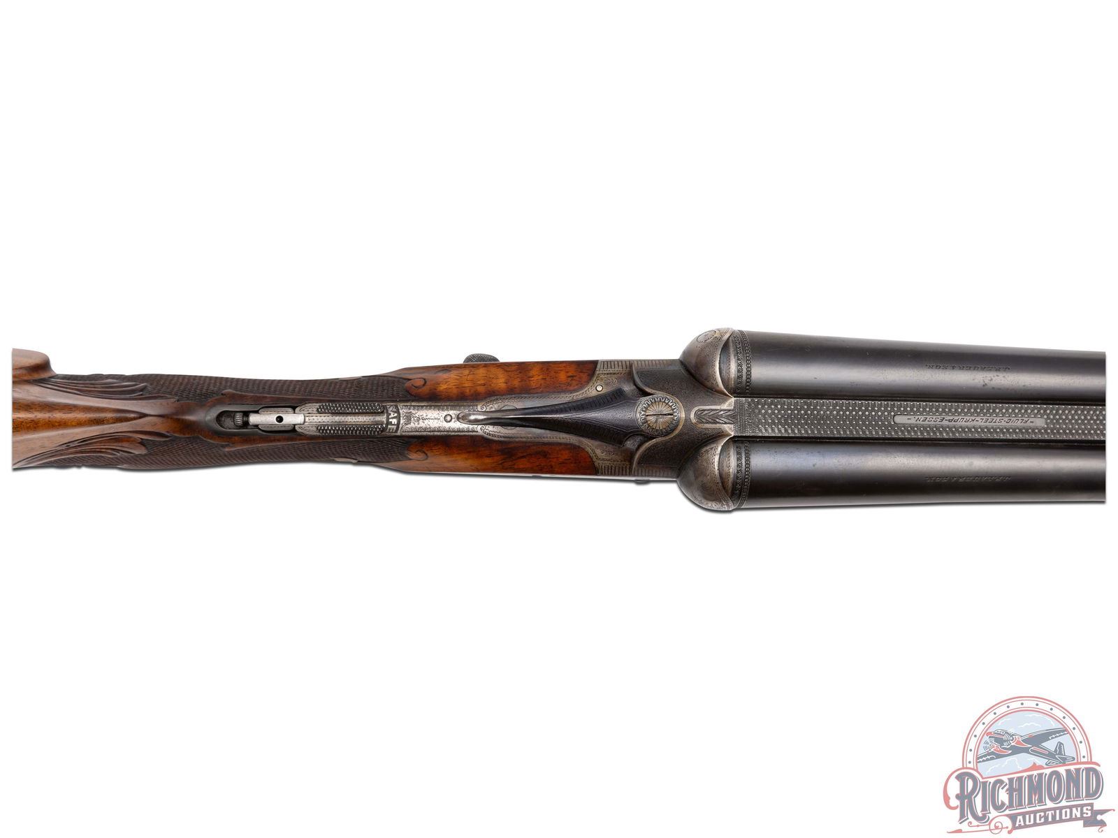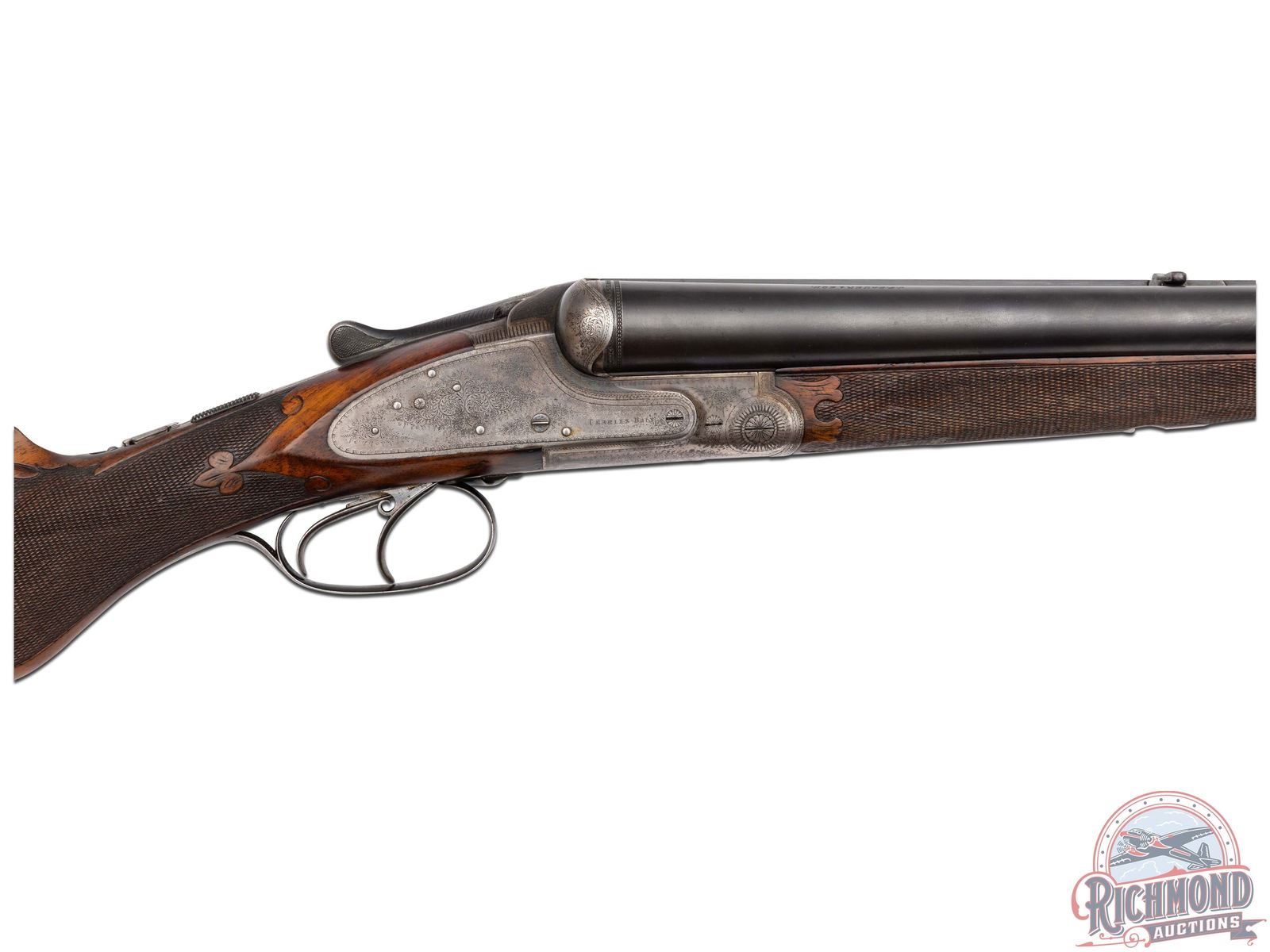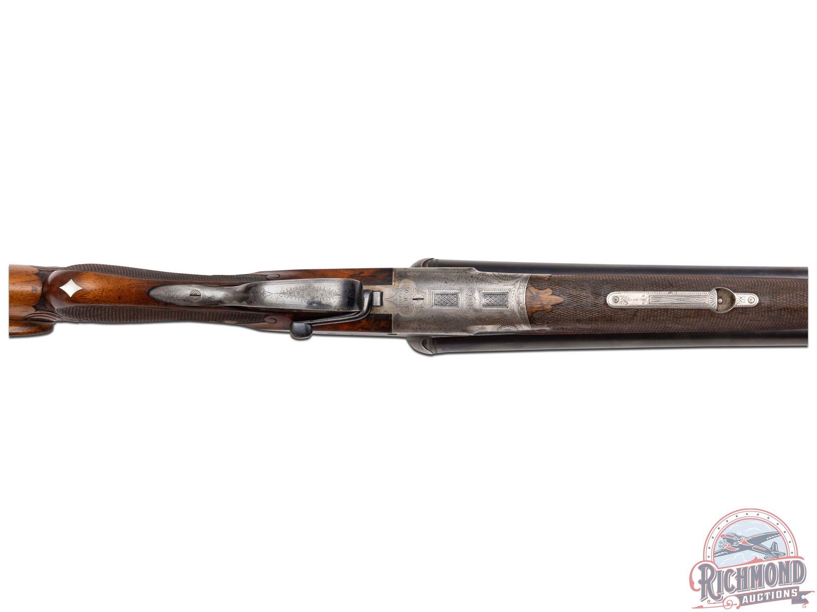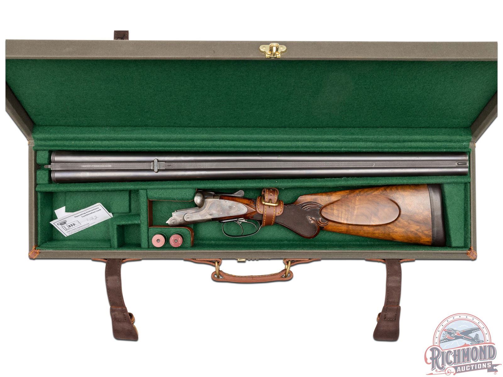 Manufactured for Charles Daly of New York, New York by J.P. Sauer and Son in Prussia in 1908. Features a special order with very rare carved checkering borders. Fitted with 28" Krupp steel barrels with 12 gauge side by side over .30-30 WIN caliber rifle. Barrels have matted rib with steel marking, rifle sights, extractors and "J.P. Sauer and Son" barrel stampings at breech. Case-hardened Diamond Quality sidelock action with scroll engraving, cocking indicators, side clips and Greener crossbolt. Action is marked on each side "Charles Daly" and has blued rifle side cocking lever, tang safety, hidden tang peep sight and pierced double triggers. Select walnut rare checkered round knob pistol grip stock with floral carved border, diamond ebony grip inlay, gold oval vanity plaque, right hand cheekpiece and leather cover recoil pad. Matching checkered splinter forearm with carved borders, ebony inlay and latch release. Comes in a green canvas trunk case with leather straps. Nice quality drilling with special order carved wood feature not often seen. LOP: 14-1/4". DAC: 1-1/2". DAH: 2". CALIBER: 12x12 / 30-30 WIN. S/N: 143180. FFL STATUS: Curio & Relic.