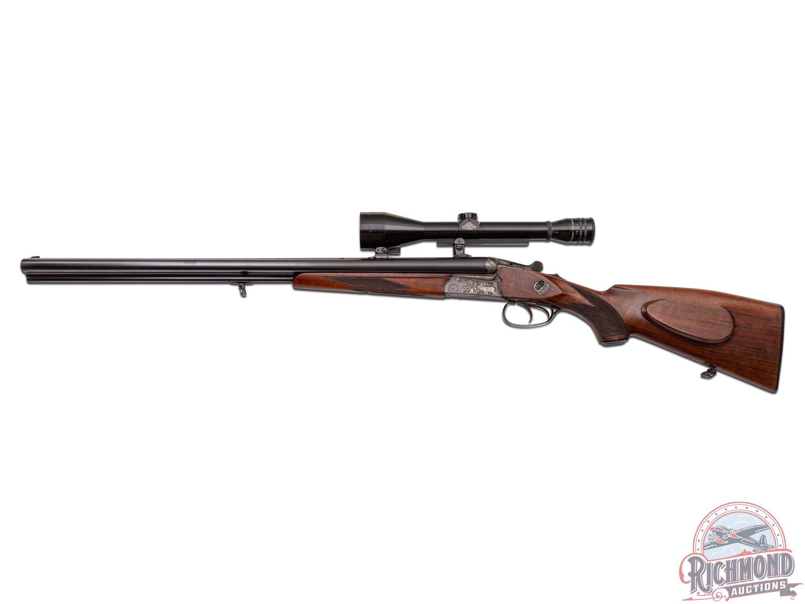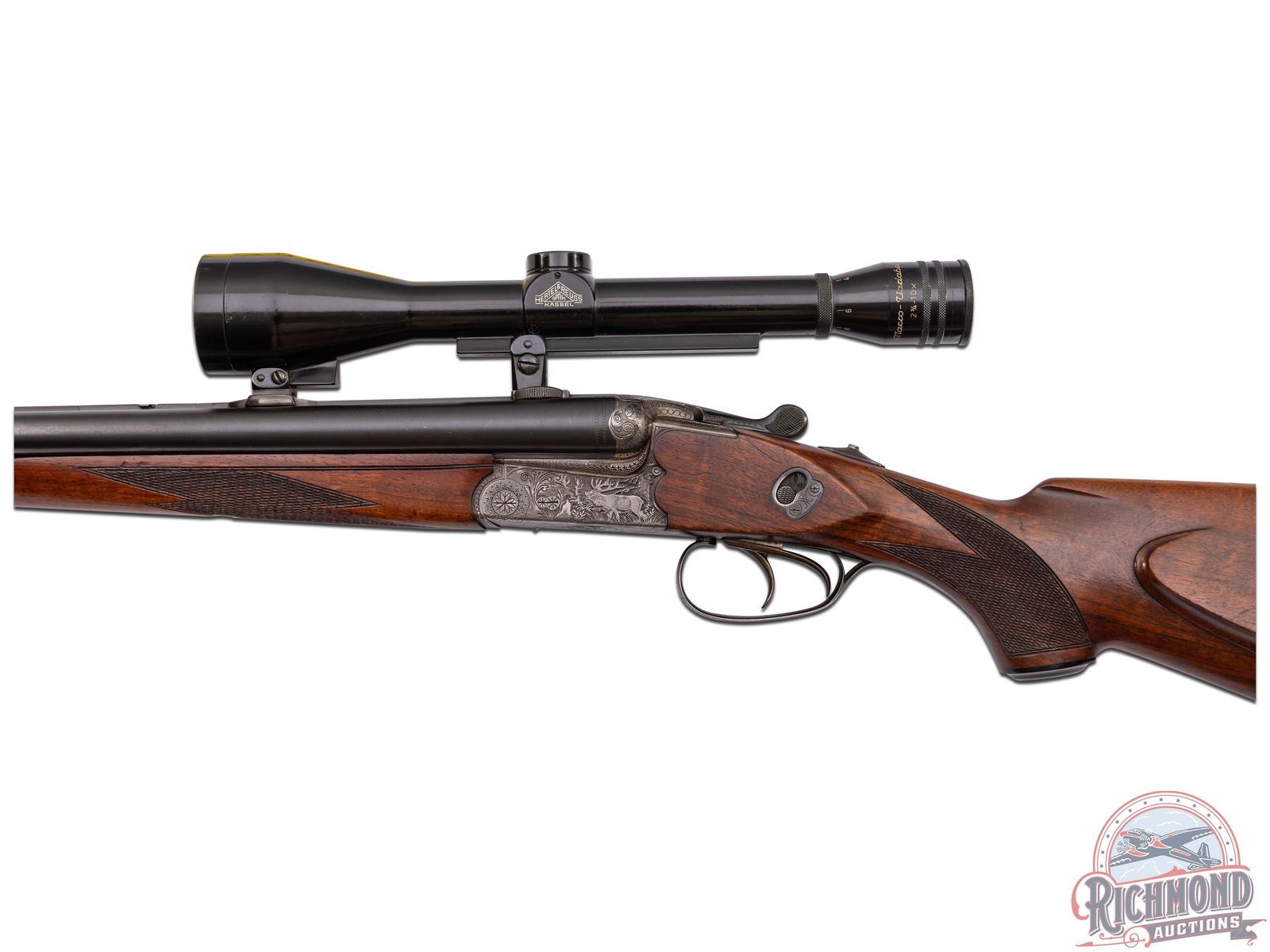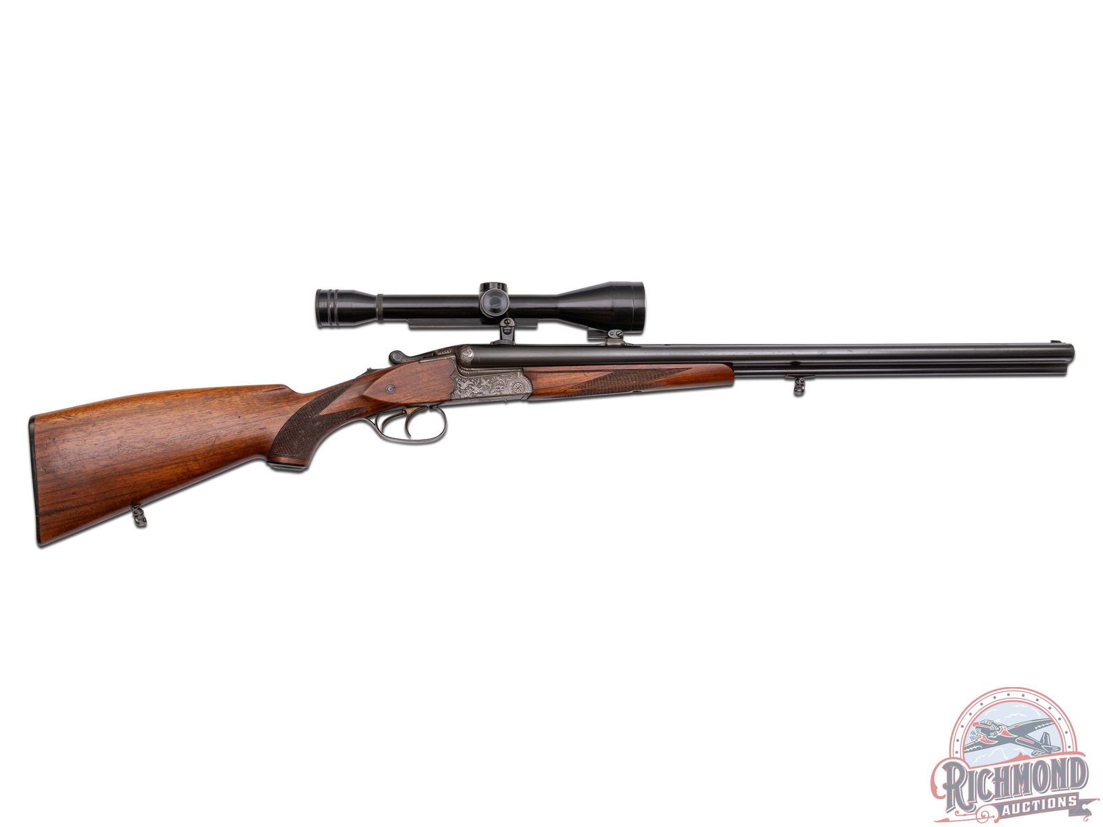 Manufactured in East Germany in 1975 at the former J.P. Sauer factory. Imported by DLN of Howard Lake, MN. Features 25" blued "Special Gewehr Laufstahl" matted rib 16 gauge side by side shotgun barrels over a 7x57 R caliber rifle. Barrels are marked with steel type and "Fortuna-Suhl / Made in G.D.R.". Fitted with rifle sight and rear flip-down. Chambered for 2-3/4" shells, extractors and Full and Modified chokes. Drilling is fitted in European style claw mounts with Hertel & Reuss 2-3/4-10X scope with European post reticle. Coin finished boxlock game scene engraved frame with Hirsch on left and ducks in flight on right. Fitted with sideclips, double triggers (front being a set) and top tang rifle selector with Greener style safety. European walnut checkered pistol grip stock with Roman nose architecture and right hand cheekpiece. Suhl symbol marked hard rubber butt plate and grip cap. Matching walnut checkered splinter forearm with latch release. LOP: 14". DAC: 1-1/4". DAH: 1-3/4". CALIBER: 16x16 / 7x57 R. S/N: 975012. FFL STATUS: Modern.