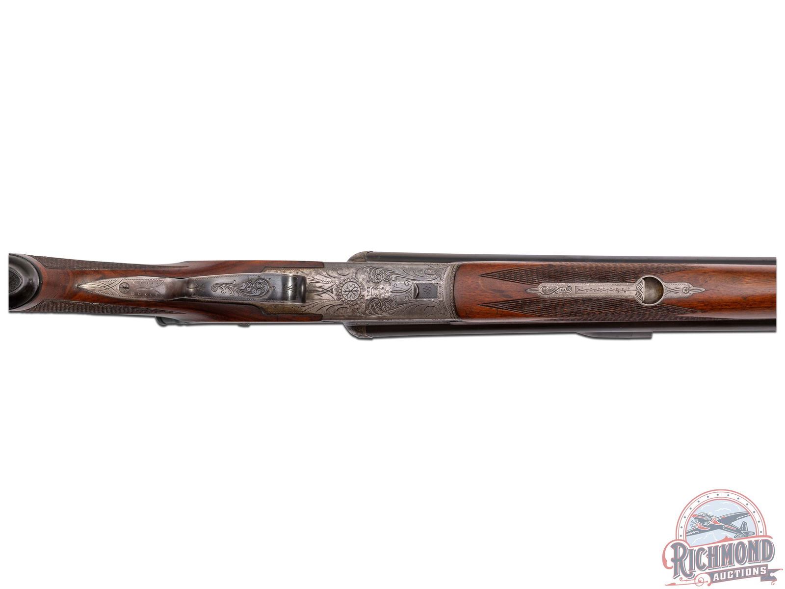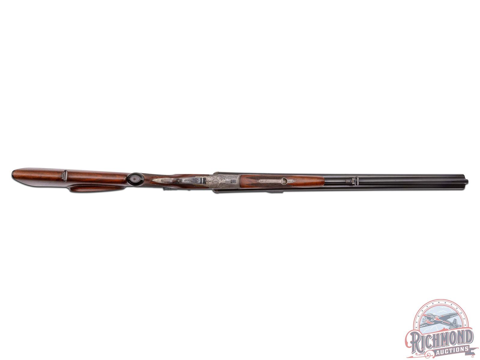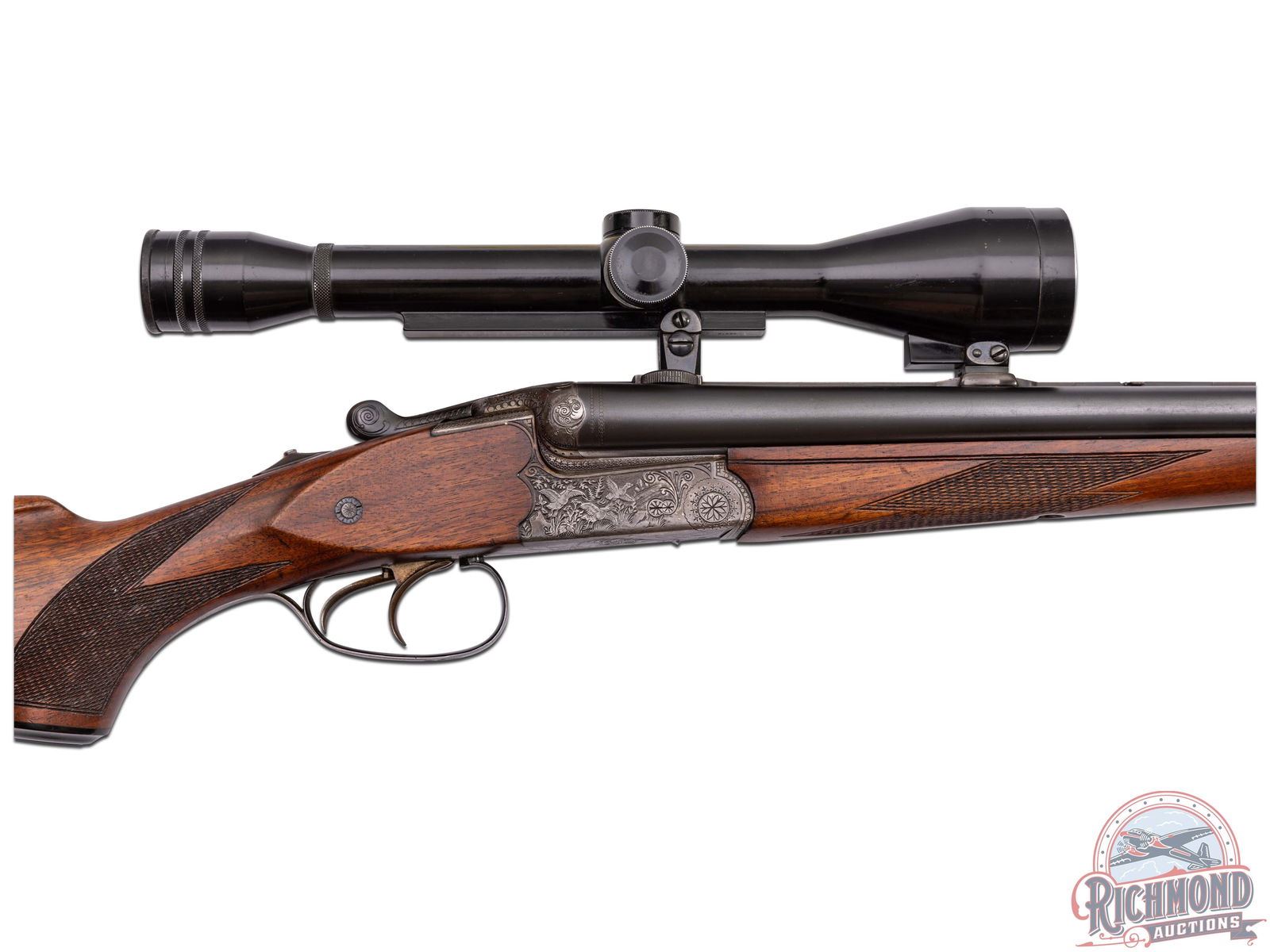 Manufactured in East Germany in 1975 at the former J.P. Sauer factory. Imported by DLN of Howard Lake, MN. Features 25" blued "Special Gewehr Laufstahl" matted rib 16 gauge side by side shotgun barrels over a 7x57 R caliber rifle. Barrels are marked with steel type and "Fortuna-Suhl / Made in G.D.R.". Fitted with rifle sight and rear flip-down. Chambered for 2-3/4" shells, extractors and Full and Modified chokes. Drilling is fitted in European style claw mounts with Hertel & Reuss 2-3/4-10X scope with European post reticle. Coin finished boxlock game scene engraved frame with Hirsch on left and ducks in flight on right. Fitted with sideclips, double triggers (front being a set) and top tang rifle selector with Greener style safety. European walnut checkered pistol grip stock with Roman nose architecture and right hand cheekpiece. Suhl symbol marked hard rubber butt plate and grip cap. Matching walnut checkered splinter forearm with latch release. LOP: 14". DAC: 1-1/4". DAH: 1-3/4". CALIBER: 16x16 / 7x57 R. S/N: 975012. FFL STATUS: Modern.