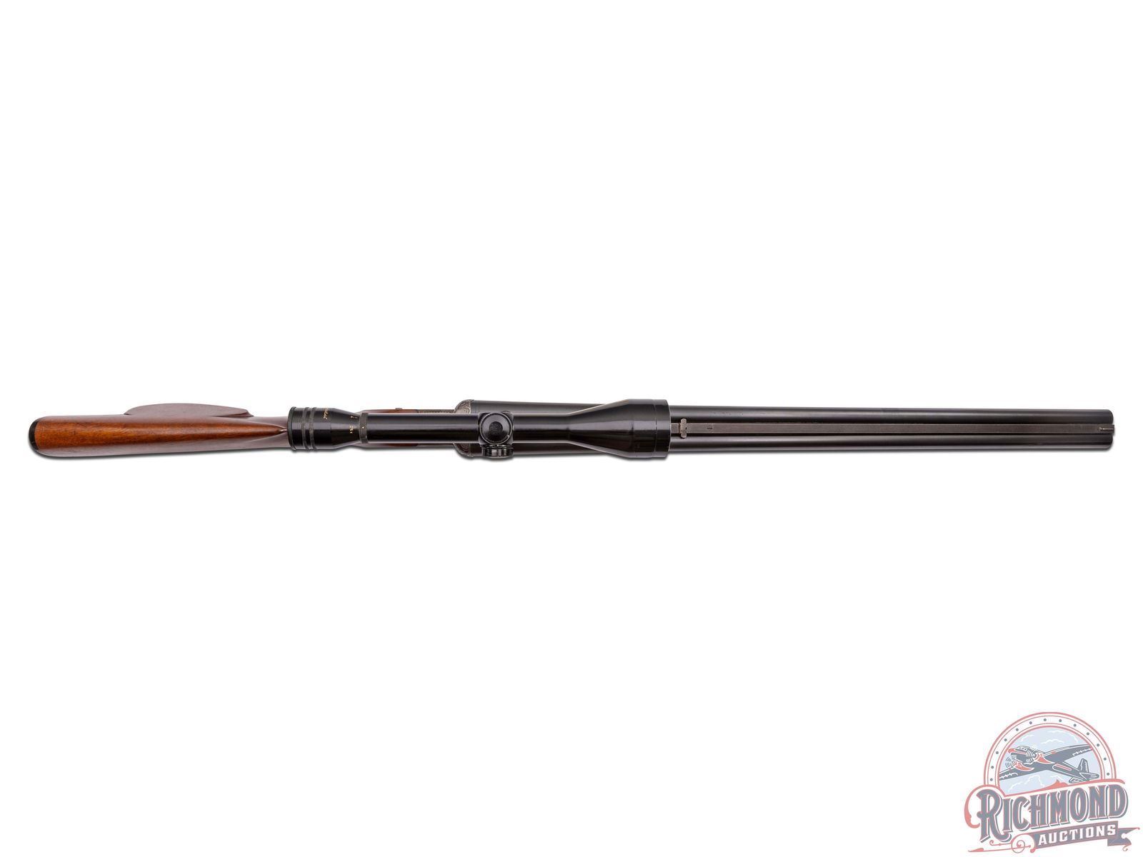 Retains 90% overall with blue showing edge and handling wear. Wood has sharp checkering with small scratches. Good bores and mechanics. Clear optics.