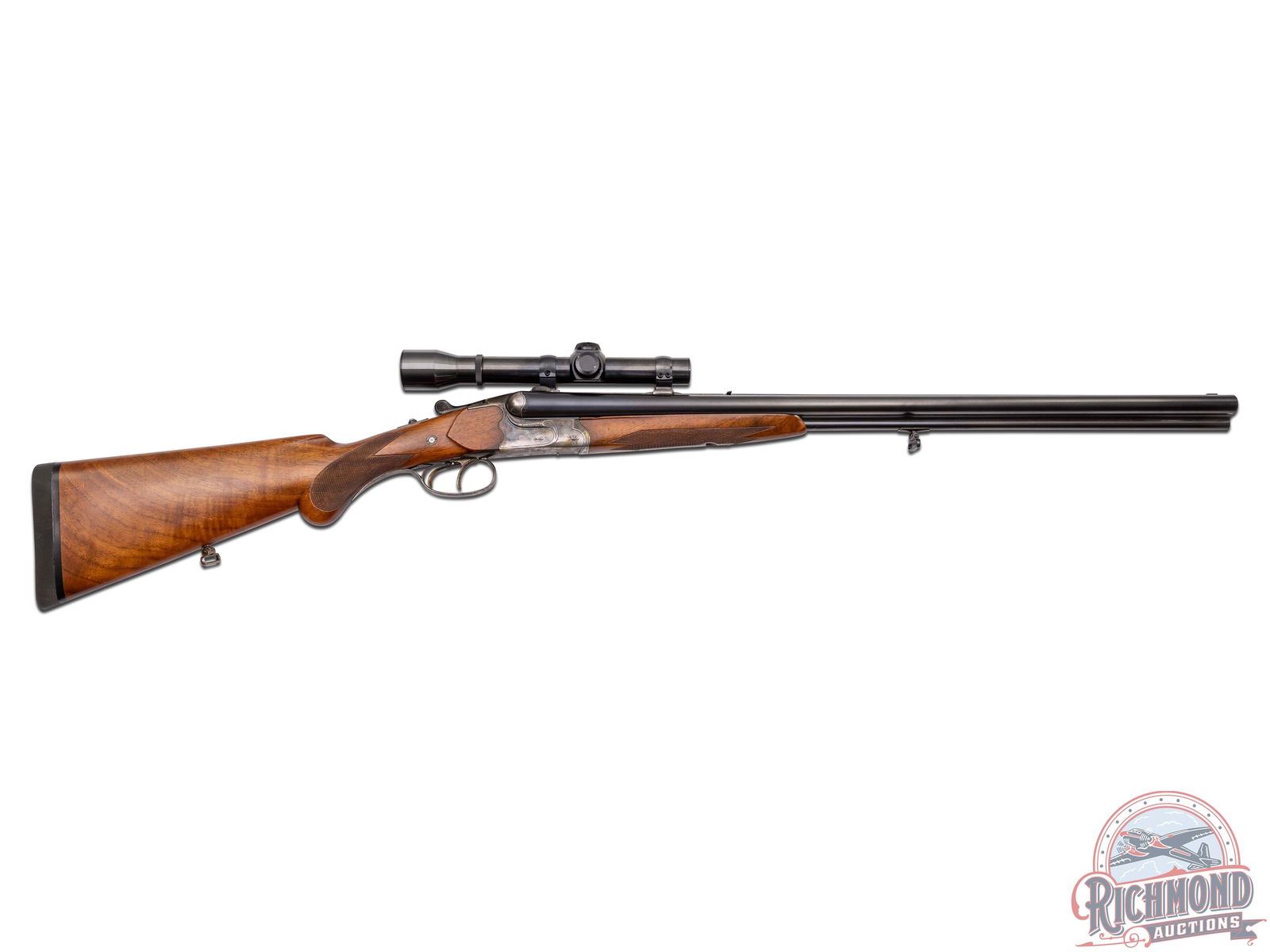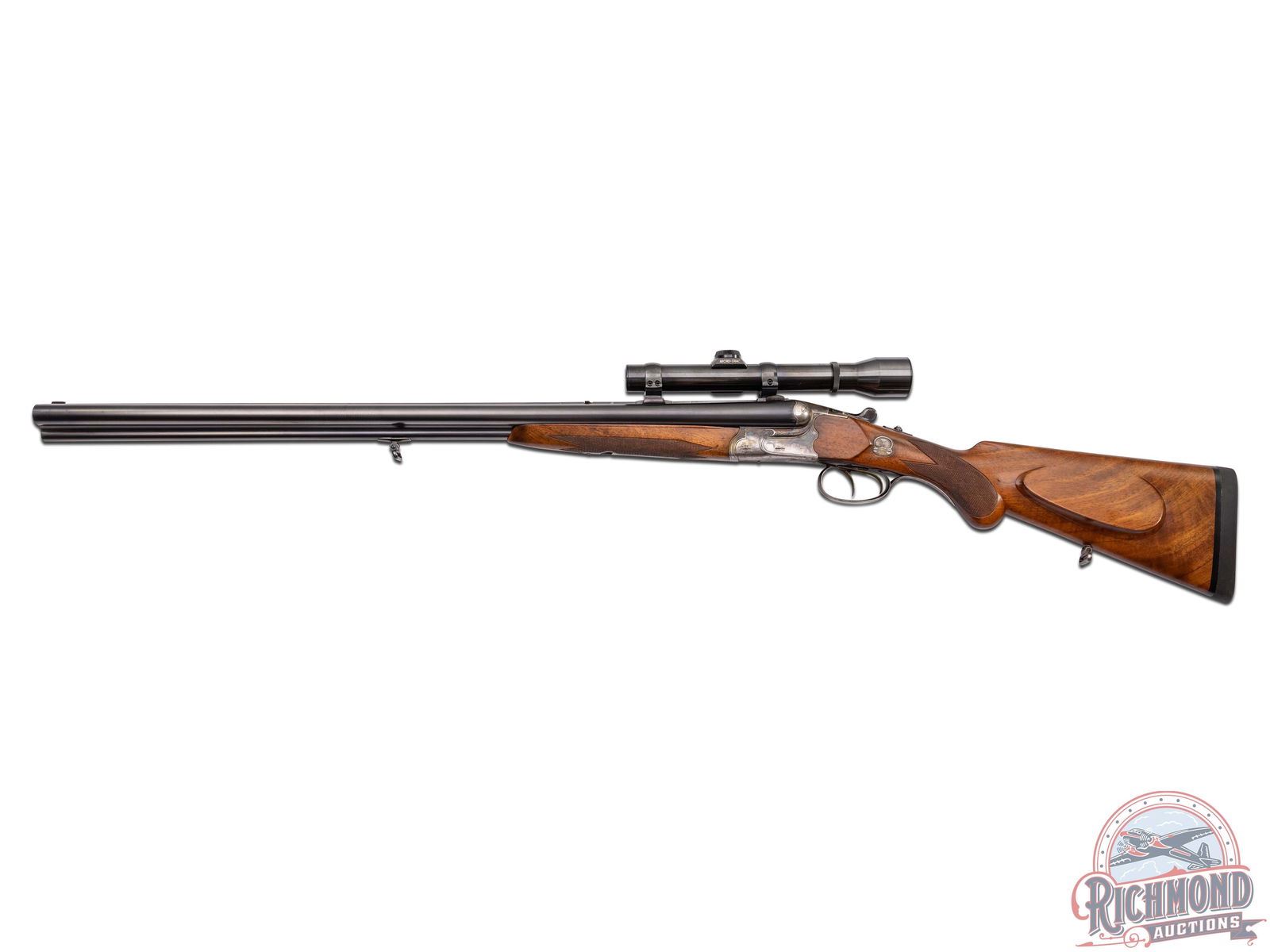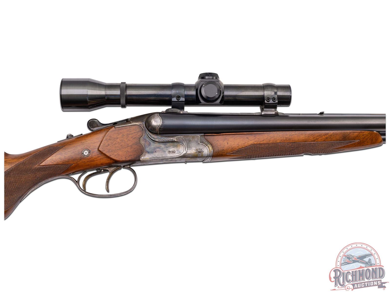 Made by Greifelt & Company in Suhl, Germany in 1928 and marketed by P.G. Stucker of Elberfield. Blued Nitro proofed 26-1/4"Krupp Laufstahl barrels with side by side 16 gauge shotgun barrels over 8x57JR caliber rifle. Barrels have matted rib marked with store name, rifle sights, and claw mounts. Gun has modern made claws with Weaver "Micro-Trac" 2.5x scope with crosshair reticle. Case-hardened line engraved scalloped boxlock "Blitz" action with Greener side safety and crossbolt, top tang barrel selector, double triggers (front being set), and side clips. Light tone checkered walnut round knob pistol grip stock with right hand cheekpiece and added Pachmayr solid rubber recoil pad. Matching checkered walnut splinter forearm with latch release. LOP: 14-1/4". DAC: 1-1/4". DAH: 2-1/4". CALIBER: 16 over 8x57JR. S/N: 33166. FFL STATUS: Curio & Relic.