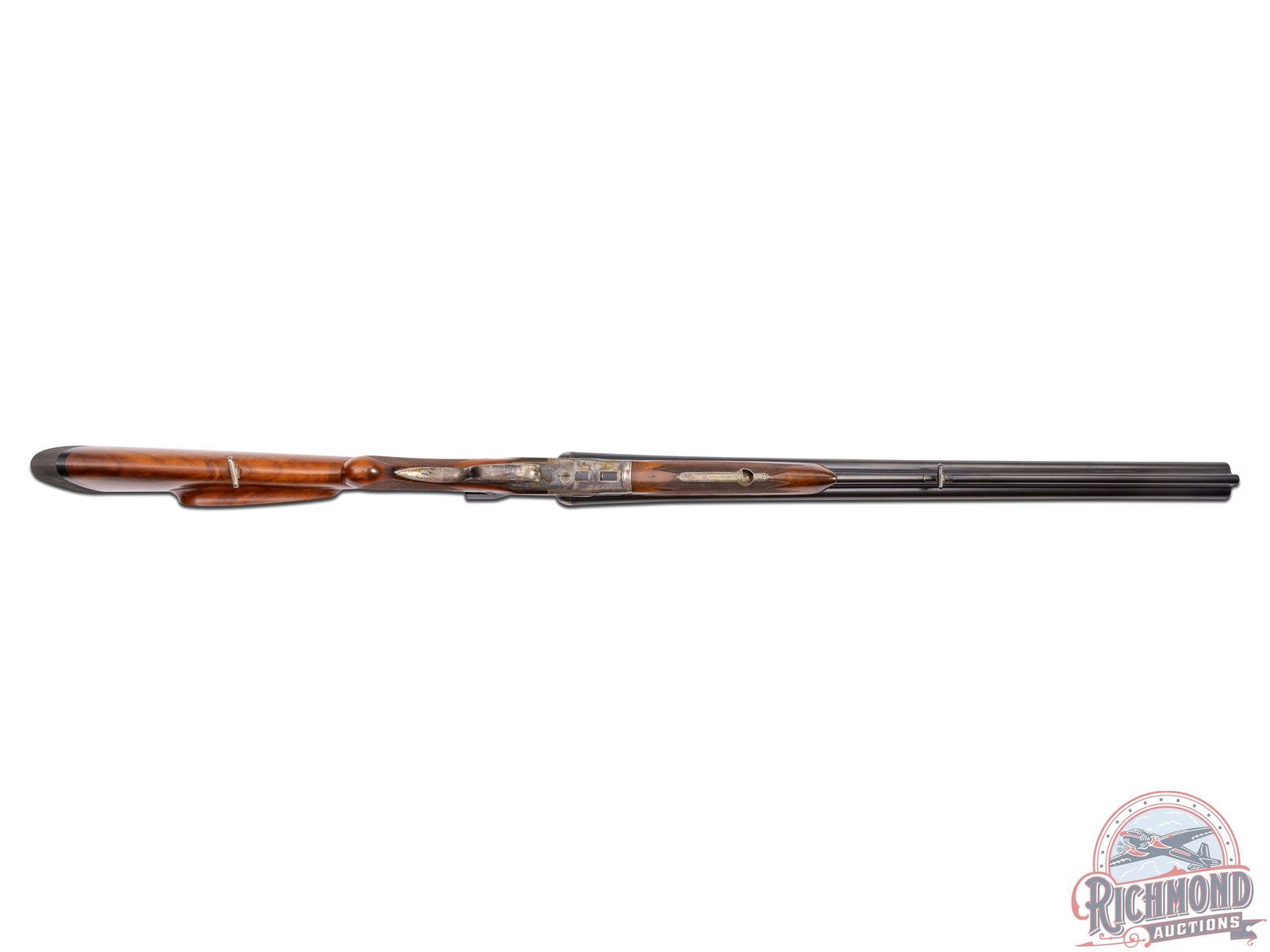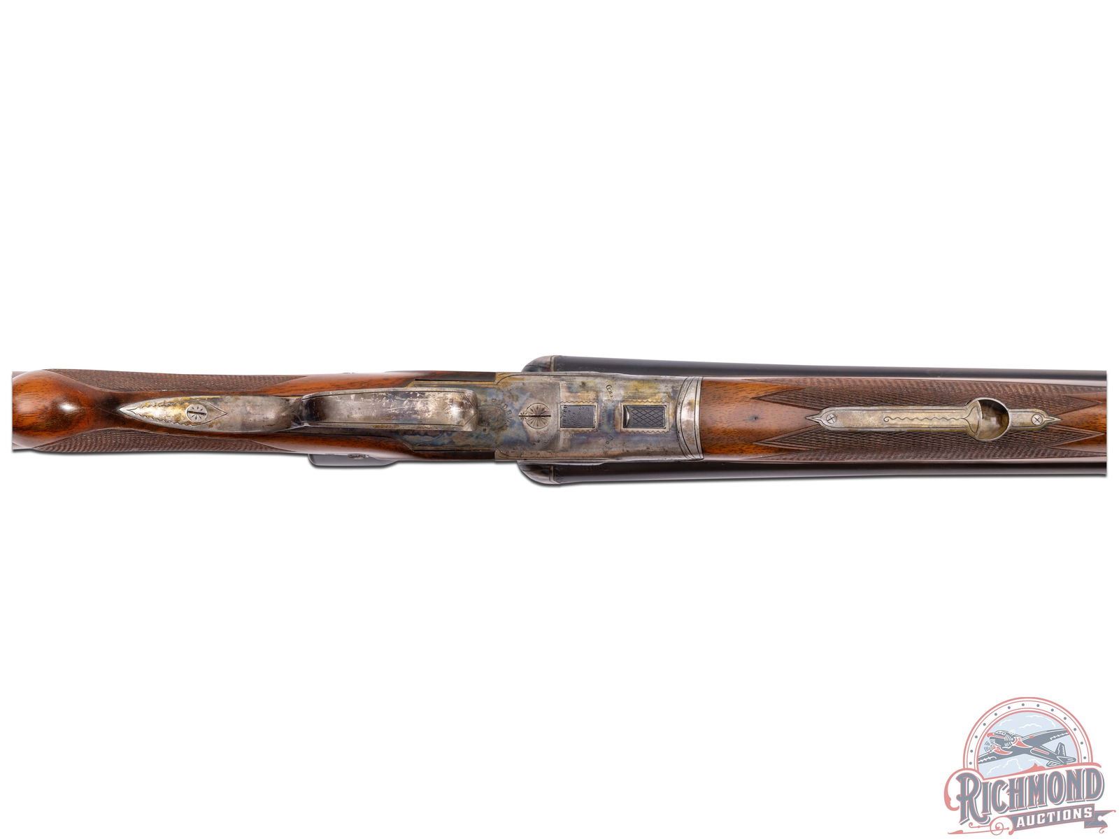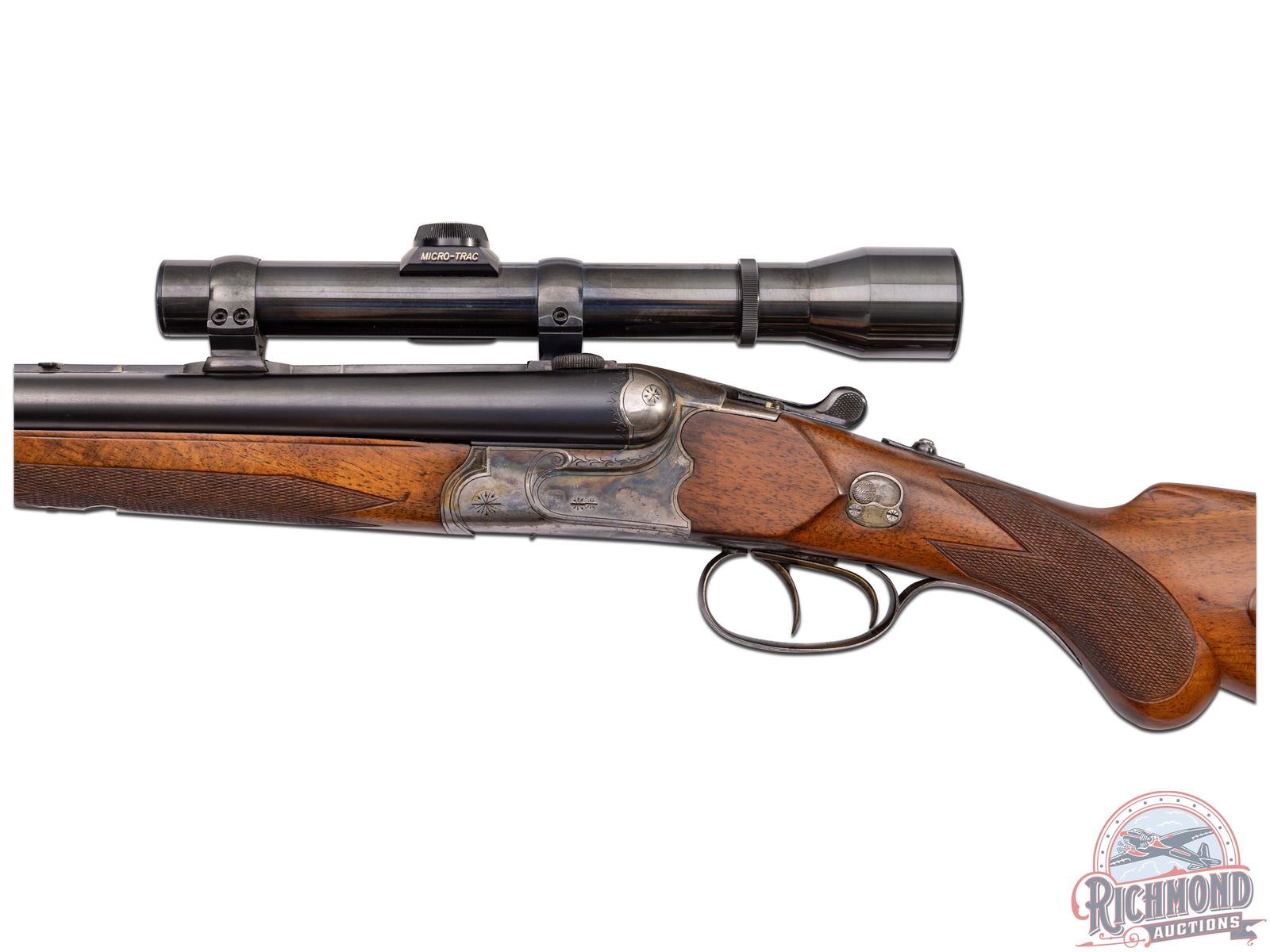 Made by Greifelt & Company in Suhl, Germany in 1928 and marketed by P.G. Stucker of Elberfield. Blued Nitro proofed 26-1/4"Krupp Laufstahl barrels with side by side 16 gauge shotgun barrels over 8x57JR caliber rifle. Barrels have matted rib marked with store name, rifle sights, and claw mounts. Gun has modern made claws with Weaver "Micro-Trac" 2.5x scope with crosshair reticle. Case-hardened line engraved scalloped boxlock "Blitz" action with Greener side safety and crossbolt, top tang barrel selector, double triggers (front being set), and side clips. Light tone checkered walnut round knob pistol grip stock with right hand cheekpiece and added Pachmayr solid rubber recoil pad. Matching checkered walnut splinter forearm with latch release. LOP: 14-1/4". DAC: 1-1/4". DAH: 2-1/4". CALIBER: 16 over 8x57JR. S/N: 33166. FFL STATUS: Curio & Relic.