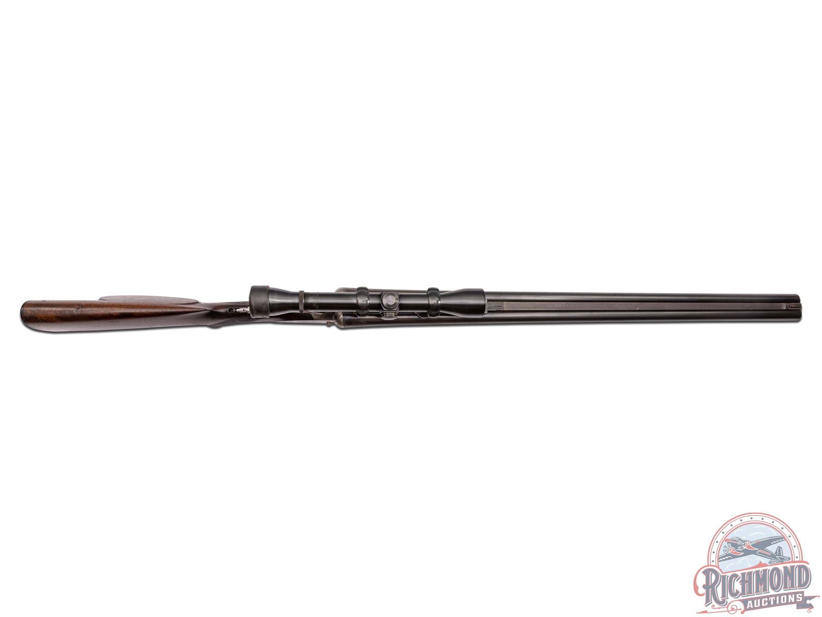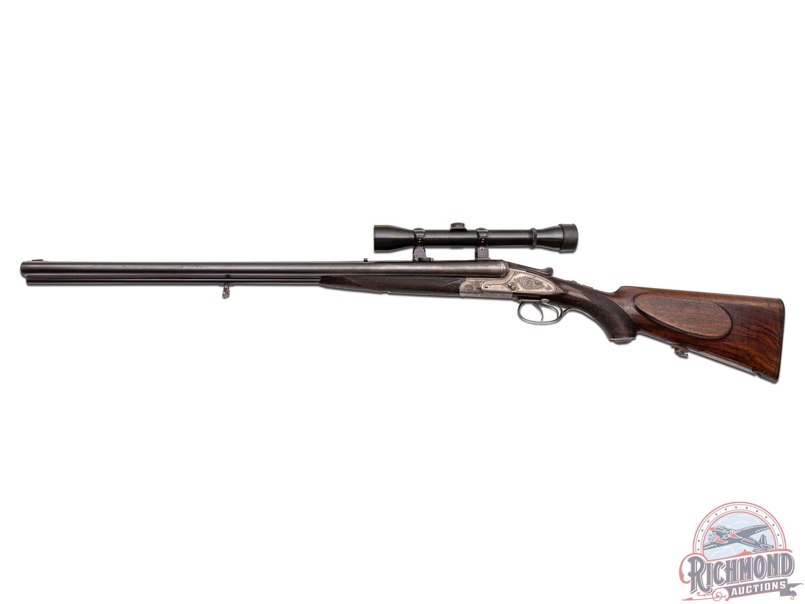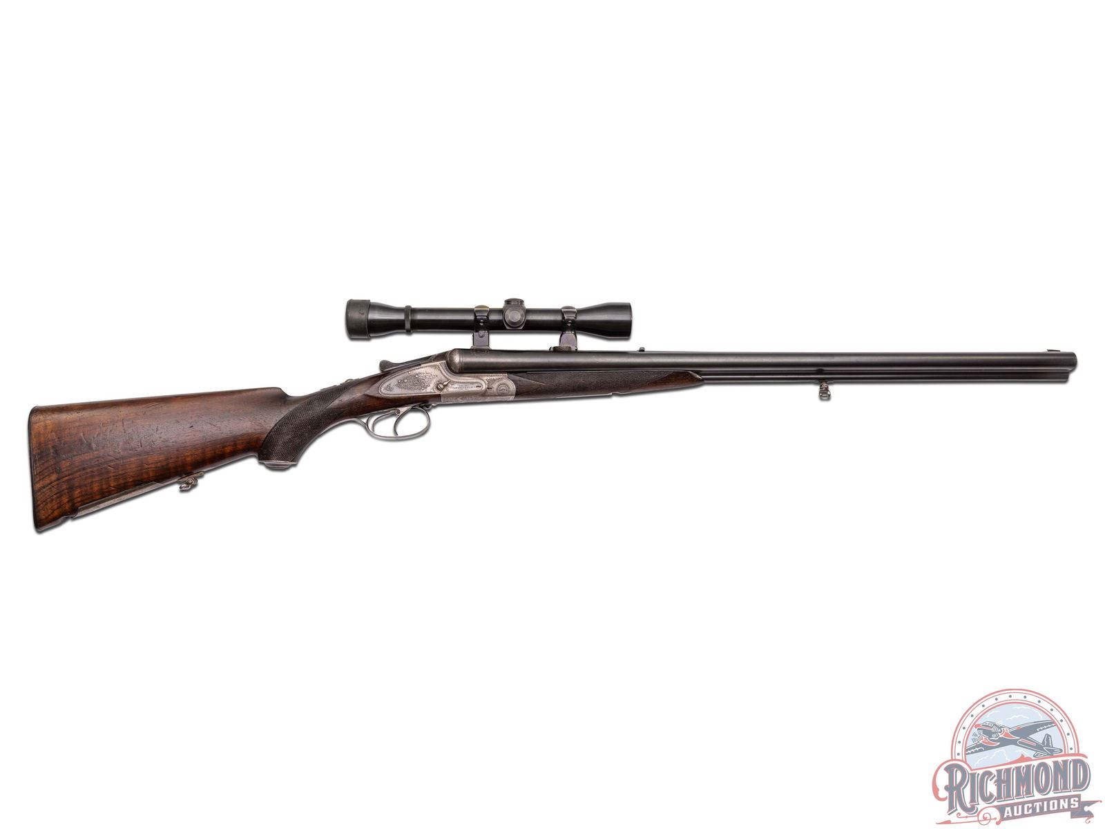 Made in Suhl, Germany by J.P. Sauer & Sohn, circa 1910. 26-3/4" blued Krupp steel barrels with matted rib, rifle sights, claw bases, and extractors with 12 gauge shotgun barrels over 9x72R rifle barrel with 2-1/2" chambers and Full and Modified chokes. Gun is fitted with new made claw mounts and rings with Weaver K-4 scope with Post reticle. Case-hardened sidelock action with vignette engraving, cocking indicators, side cocking lever, and top tang safety . Action is controlled by double triggers and protected by vignette engraved steel trigger guard. Walnut checkered pistol grip stock with horn butt plate, steel grip cap, and vignette engraved steel bullet trap. Matching checkered walnut splinter forearm with latch release. LOP: 14-3/4". DAC: 1-1/2". DAH: 2-1/2". CALIBER: 12/9x72R. S/N: 72338. FFL STATUS: Curio & Relic.