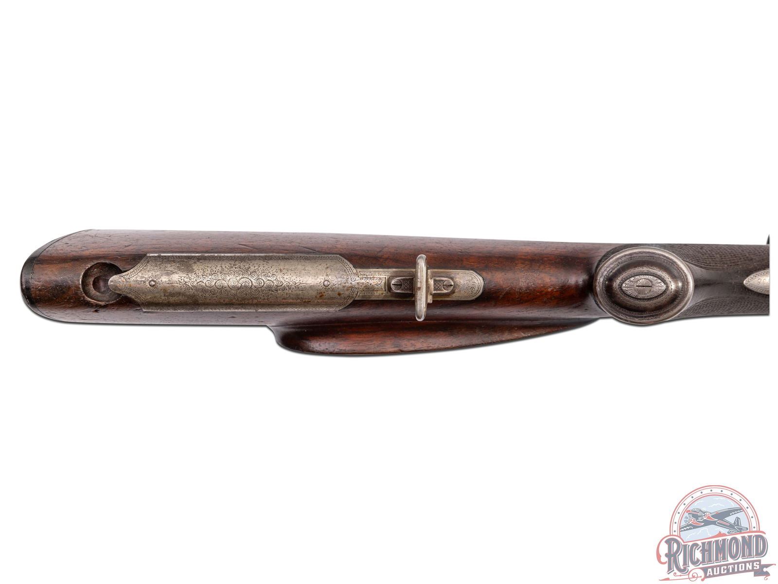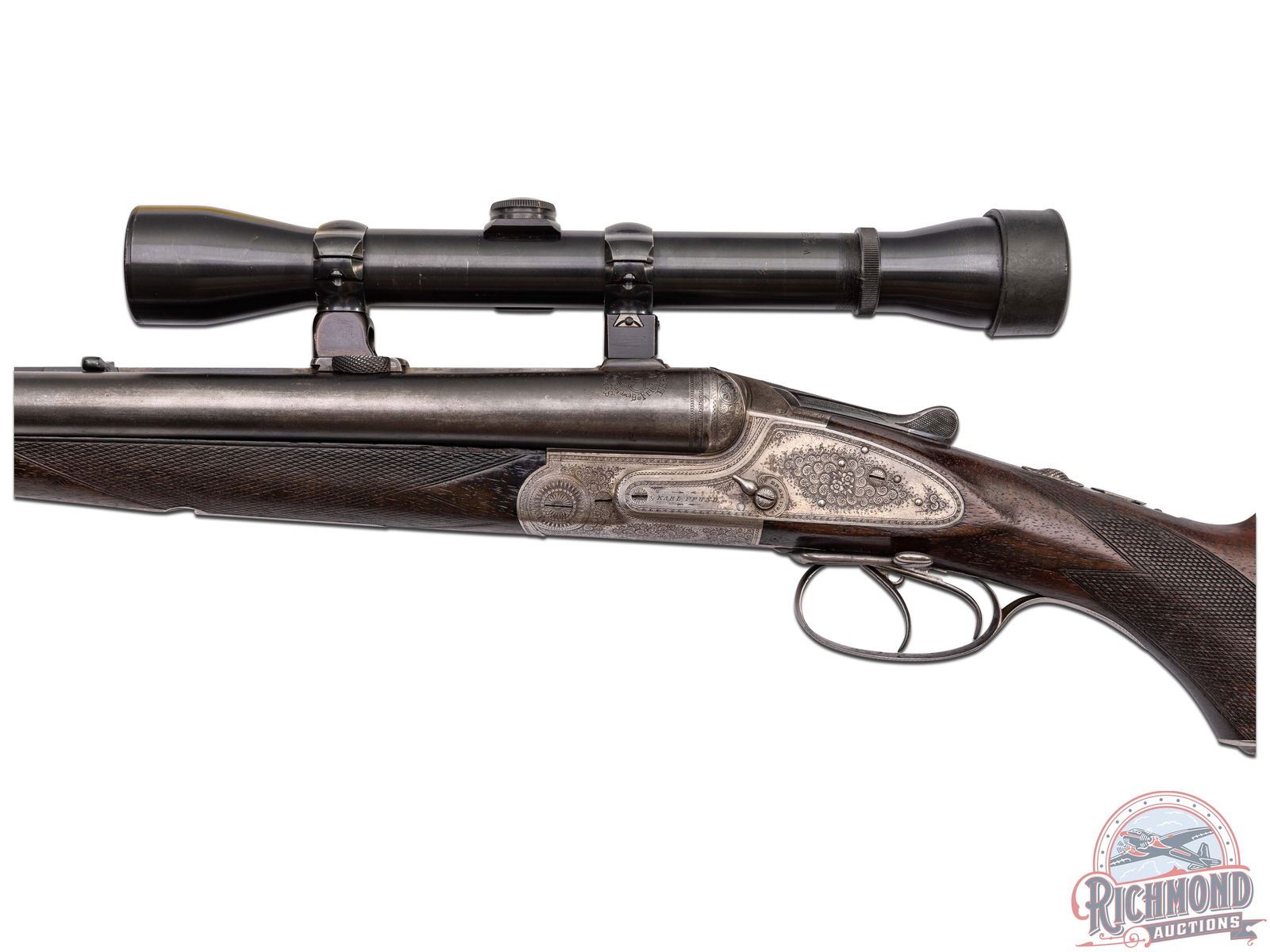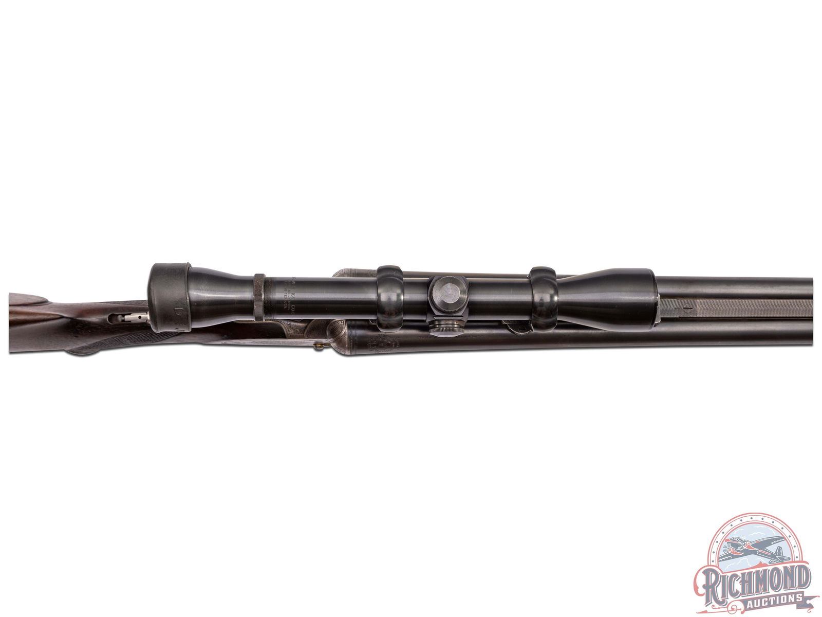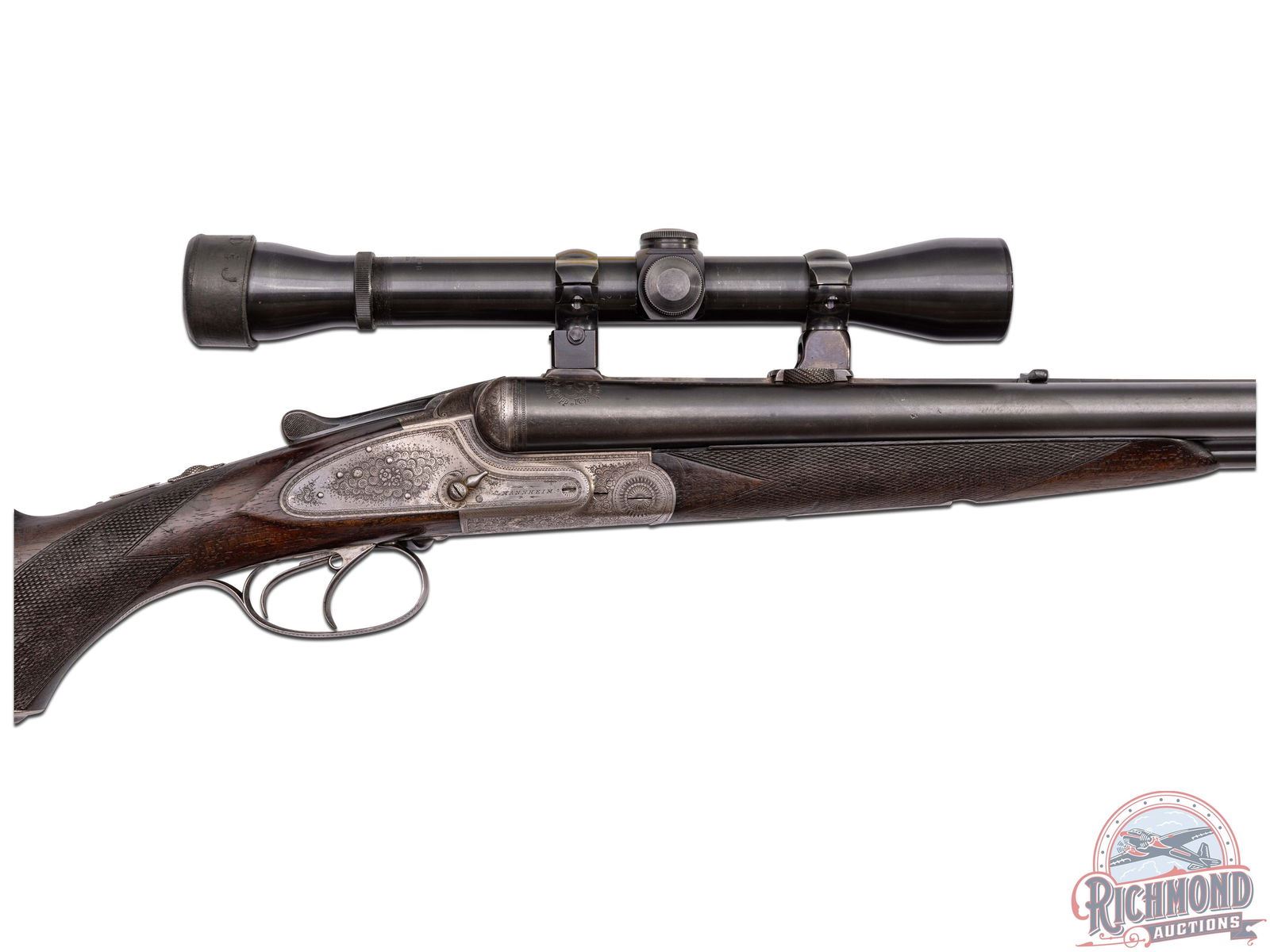 Made in Suhl, Germany by J.P. Sauer & Sohn, circa 1910. 26-3/4" blued Krupp steel barrels with matted rib, rifle sights, claw bases, and extractors with 12 gauge shotgun barrels over 9x72R rifle barrel with 2-1/2" chambers and Full and Modified chokes. Gun is fitted with new made claw mounts and rings with Weaver K-4 scope with Post reticle. Case-hardened sidelock action with vignette engraving, cocking indicators, side cocking lever, and top tang safety . Action is controlled by double triggers and protected by vignette engraved steel trigger guard. Walnut checkered pistol grip stock with horn butt plate, steel grip cap, and vignette engraved steel bullet trap. Matching checkered walnut splinter forearm with latch release. LOP: 14-3/4". DAC: 1-1/2". DAH: 2-1/2". CALIBER: 12/9x72R. S/N: 72338. FFL STATUS: Curio & Relic.