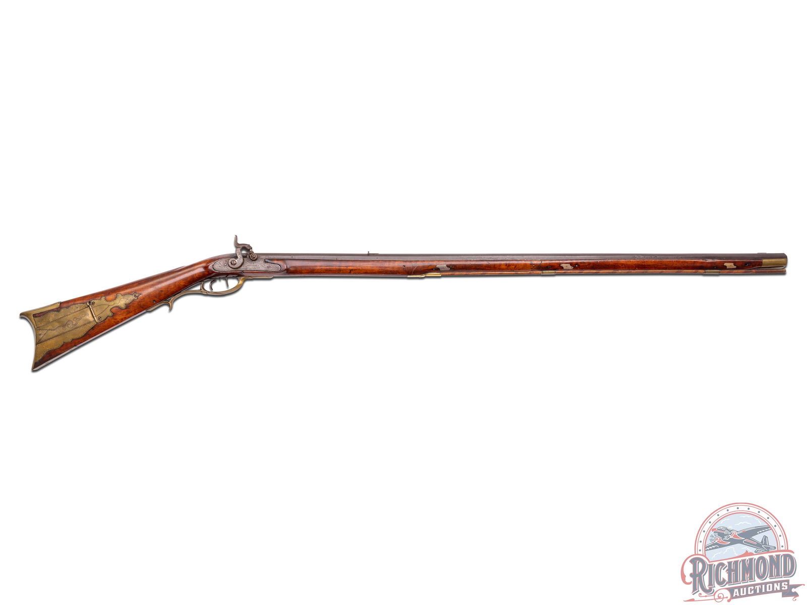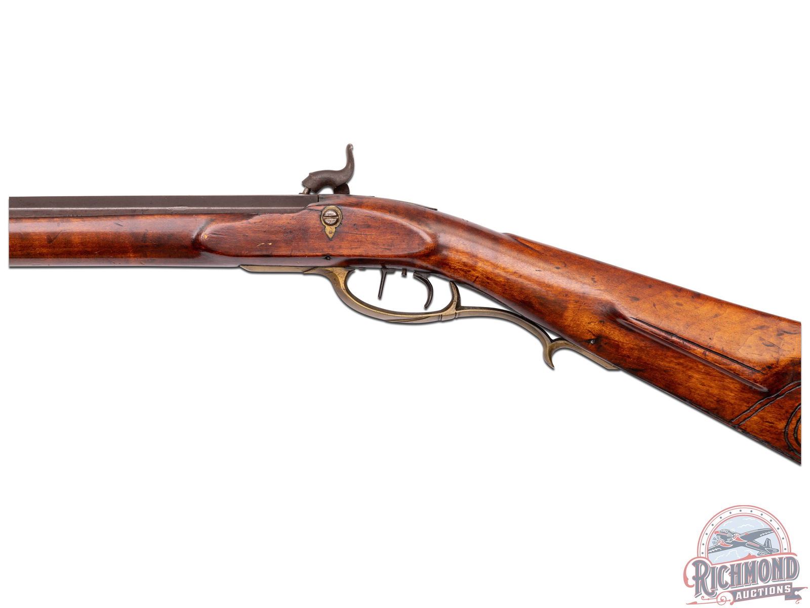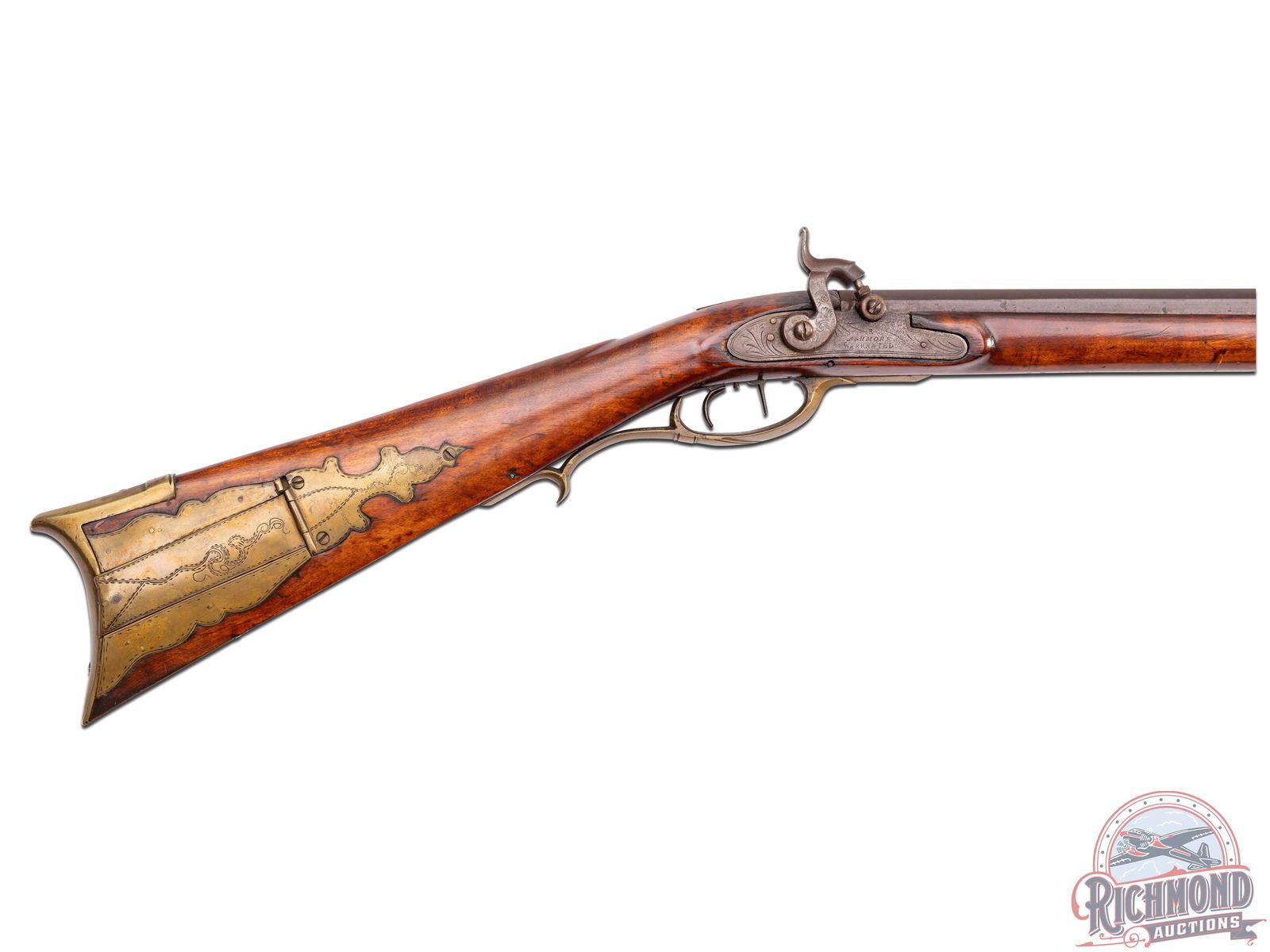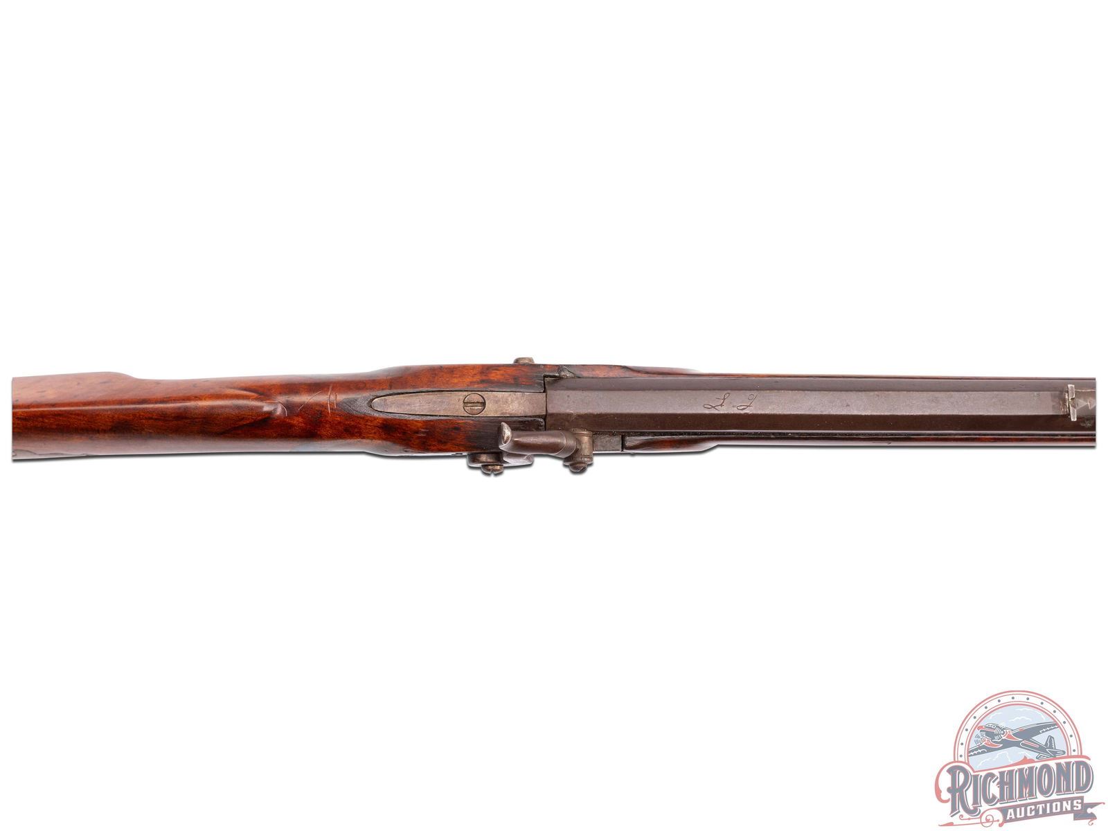 Percussion Kentucky rifle signed "L.F." in script for Lewis Fondersmith. Rifle could have been made later in his career when he was in Fayette County, Uniontown, Pennsylvania, with rifle having a design which resembles the river system (possibly the Ohio or Monongahela?). Actual meaning is lost to history. Rifle measures 55-1/2" overall with a 40" octagon 44 caliber rifled barrel signed "L.F" with rifle sights. Floral engraved "R. Ashmore Warrented" marked percussion lock with double set trigger control. Full curly maple stock with architecture matching Huntingdon-Fayette county areas with brass hardware including four piece patchbox with possible river design and unique hidden button release near hinge. Stock is incised carved in a floral vine pattern often scene on rifles made in this area. Forestock has six coin silver escutcheon plates. Comes with original striped hardwood ramrod with gunsmith made threaded tip. Interesting rifle in need of more research. CALIBER: 44. FFL STATUS: Antique.