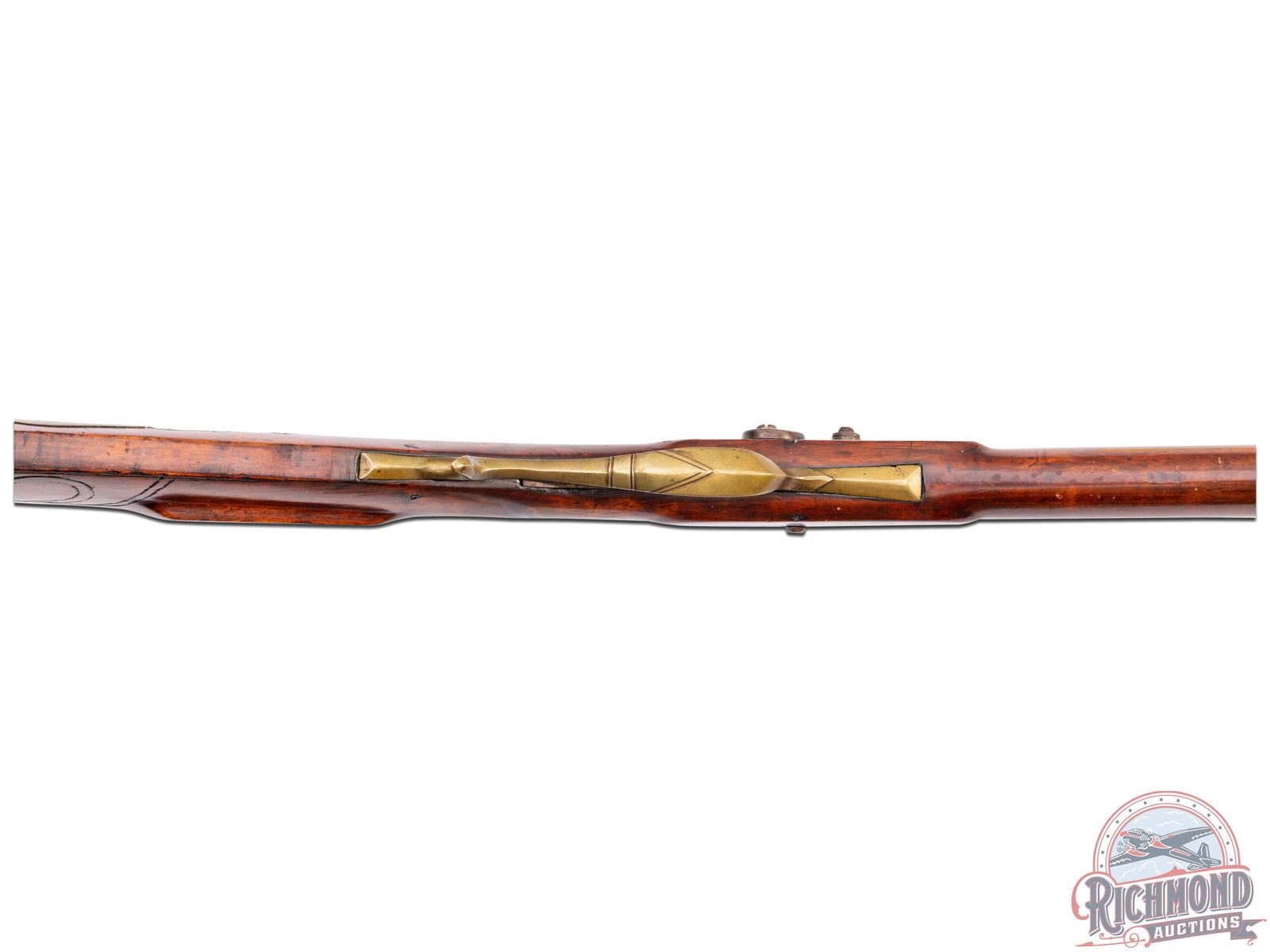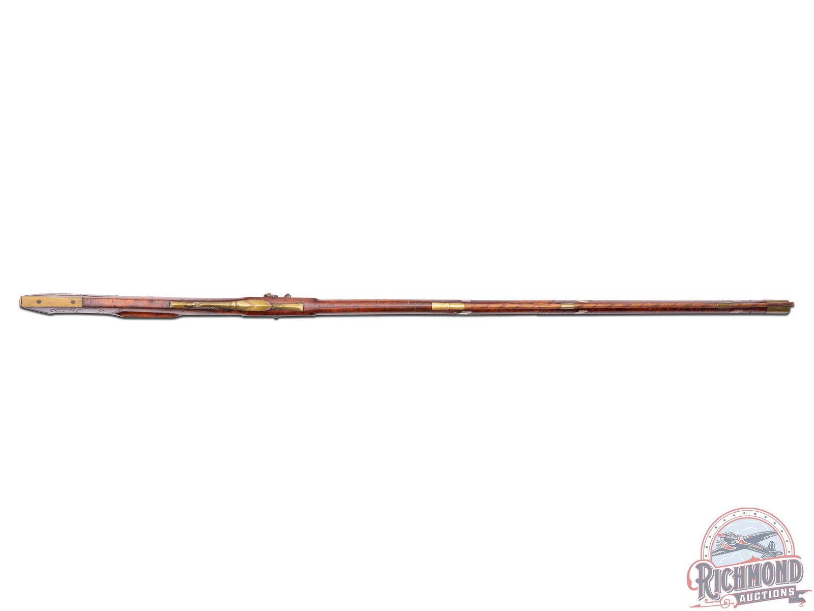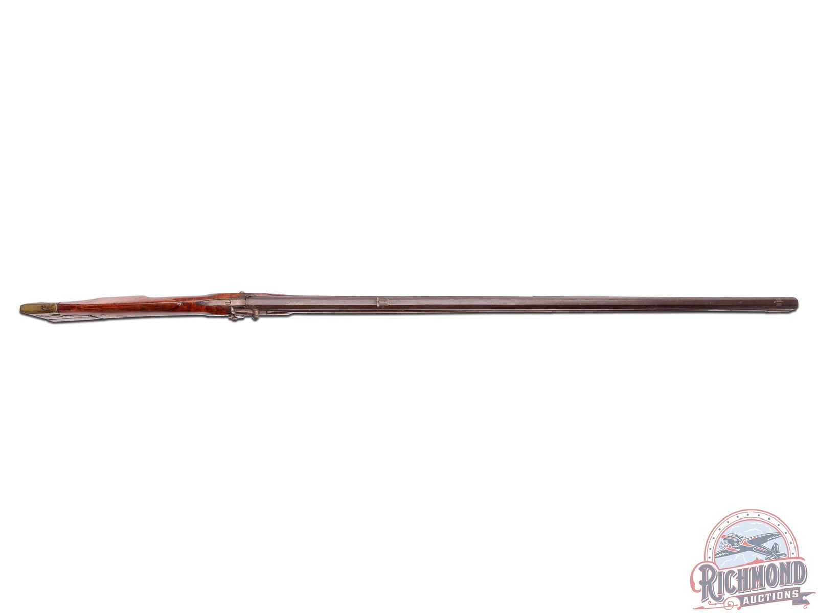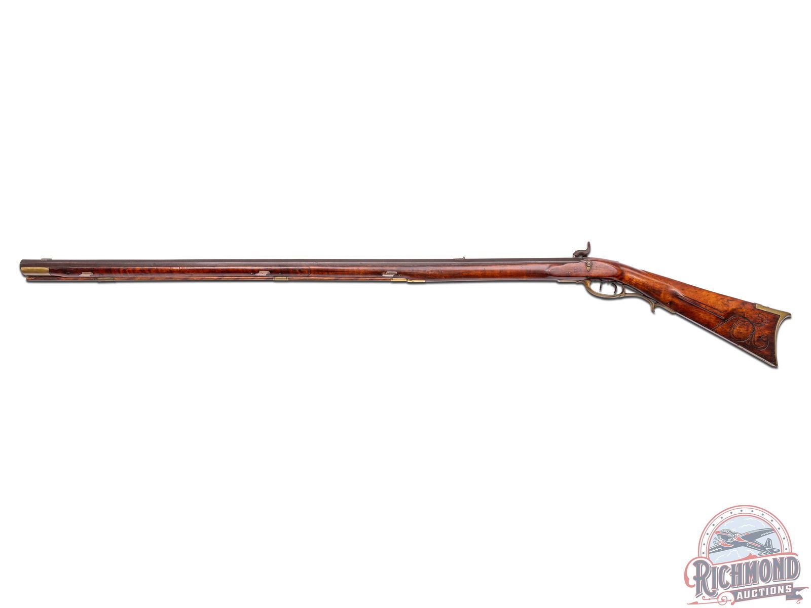 Percussion Kentucky rifle signed "L.F." in script for Lewis Fondersmith. Rifle could have been made later in his career when he was in Fayette County, Uniontown, Pennsylvania, with rifle having a design which resembles the river system (possibly the Ohio or Monongahela?). Actual meaning is lost to history. Rifle measures 55-1/2" overall with a 40" octagon 44 caliber rifled barrel signed "L.F" with rifle sights. Floral engraved "R. Ashmore Warrented" marked percussion lock with double set trigger control. Full curly maple stock with architecture matching Huntingdon-Fayette county areas with brass hardware including four piece patchbox with possible river design and unique hidden button release near hinge. Stock is incised carved in a floral vine pattern often scene on rifles made in this area. Forestock has six coin silver escutcheon plates. Comes with original striped hardwood ramrod with gunsmith made threaded tip. Interesting rifle in need of more research. CALIBER: 44. FFL STATUS: Antique.