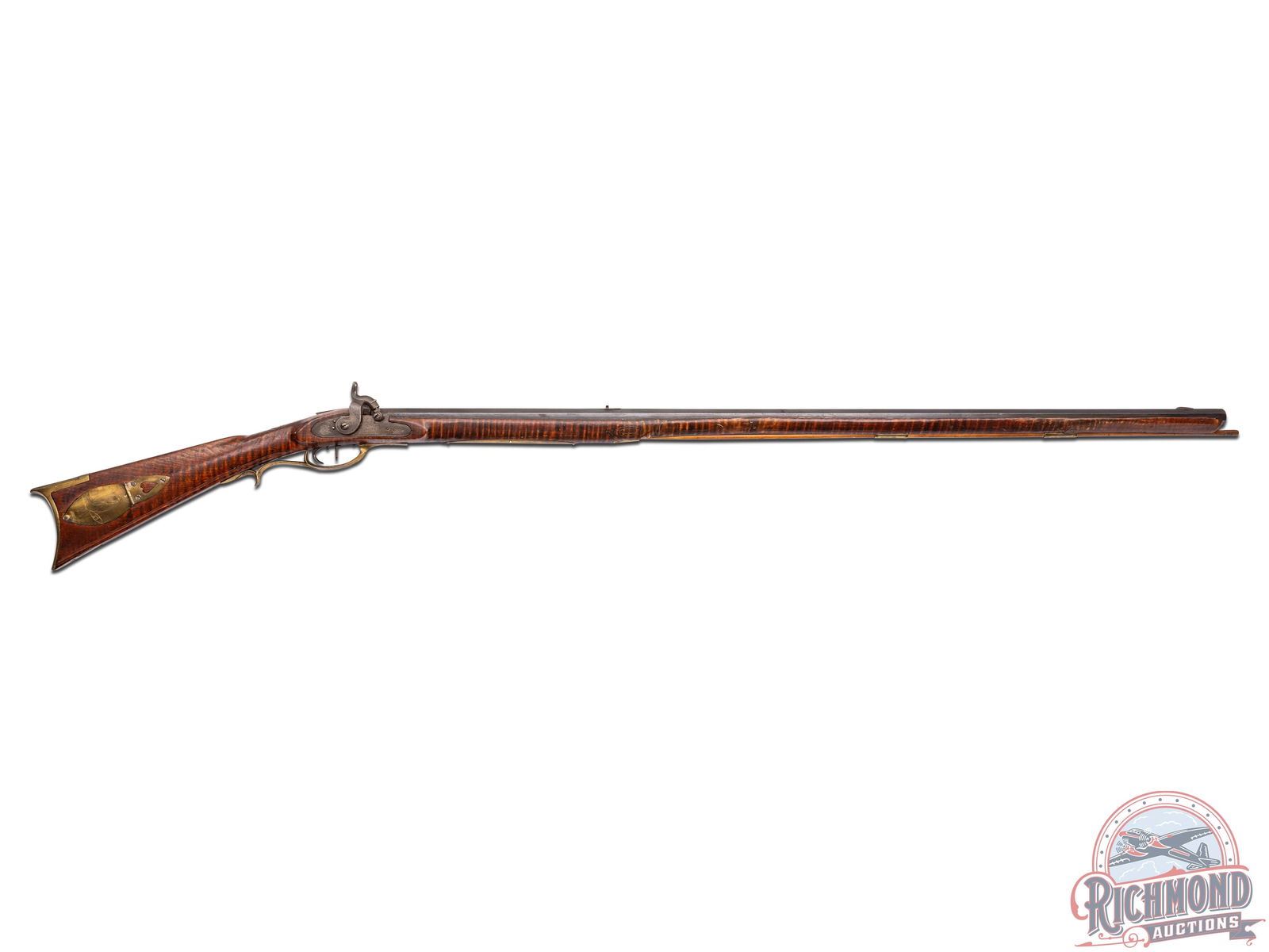 Percussion Kentucky rifle made in Ligonier, Westmoreland County, Pennsylvania, circa 1850. Rifle measures overall 56" with 41" octagon rifled barrel in 38 caliber with hunting sights and signed in script "B. McDowell". Bard McDowell was a sometimes gunsmith and shopkeeper from the Ligonier area. More information on McDowell can be found in the book "The Western Pennsylvania Rifle", by Richard Rosenberger and Charles Kaufmann. Rifle has a percussion Joseph Golcher lock with turned front trigger and rear set control. Full curly maple stock with cheekpiece with incise carving. Forestock has molding line and incise carving at tailpipe. Stock has typical Western PA brass hardware with unique two piece floral engraved patchbox with heart piercing and lid held in place with tapered wooden pin. Stock also has brass saddle plate, brass moon cheek inlay and brass thumbpiece. Comes with hardwood ramrod. CALIBER: 38. FFL STATUS: Antique.
