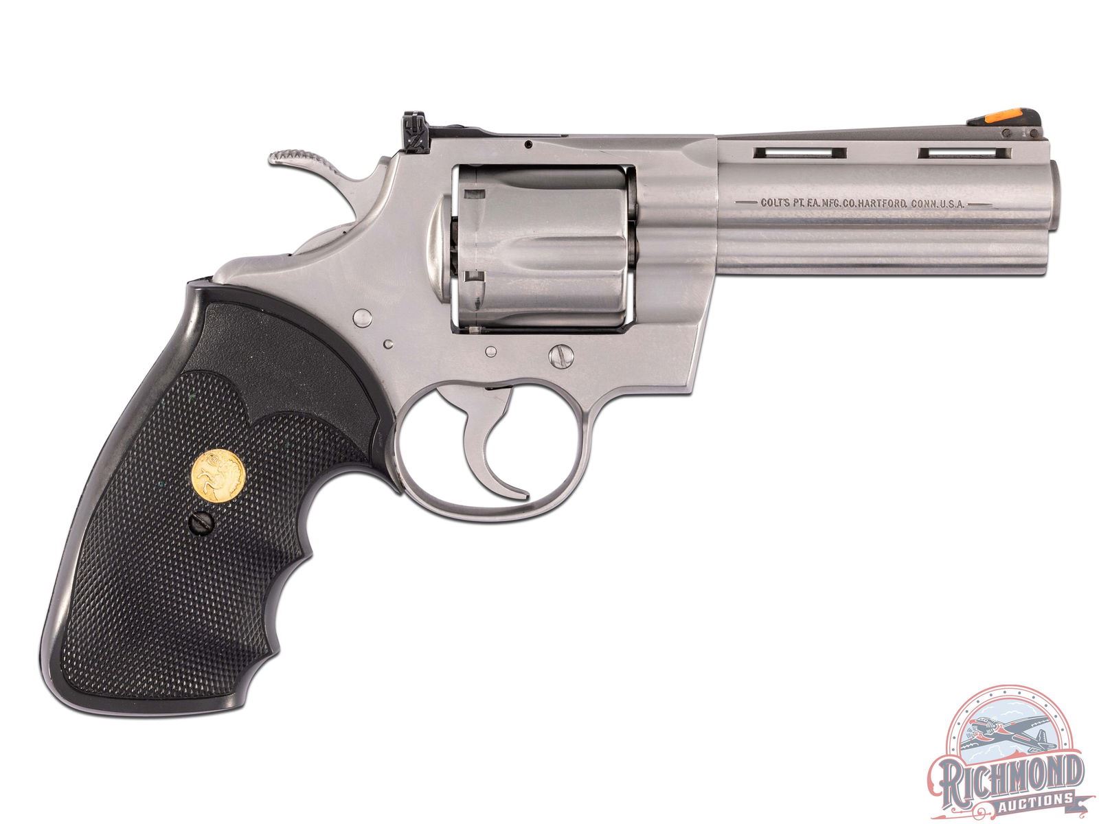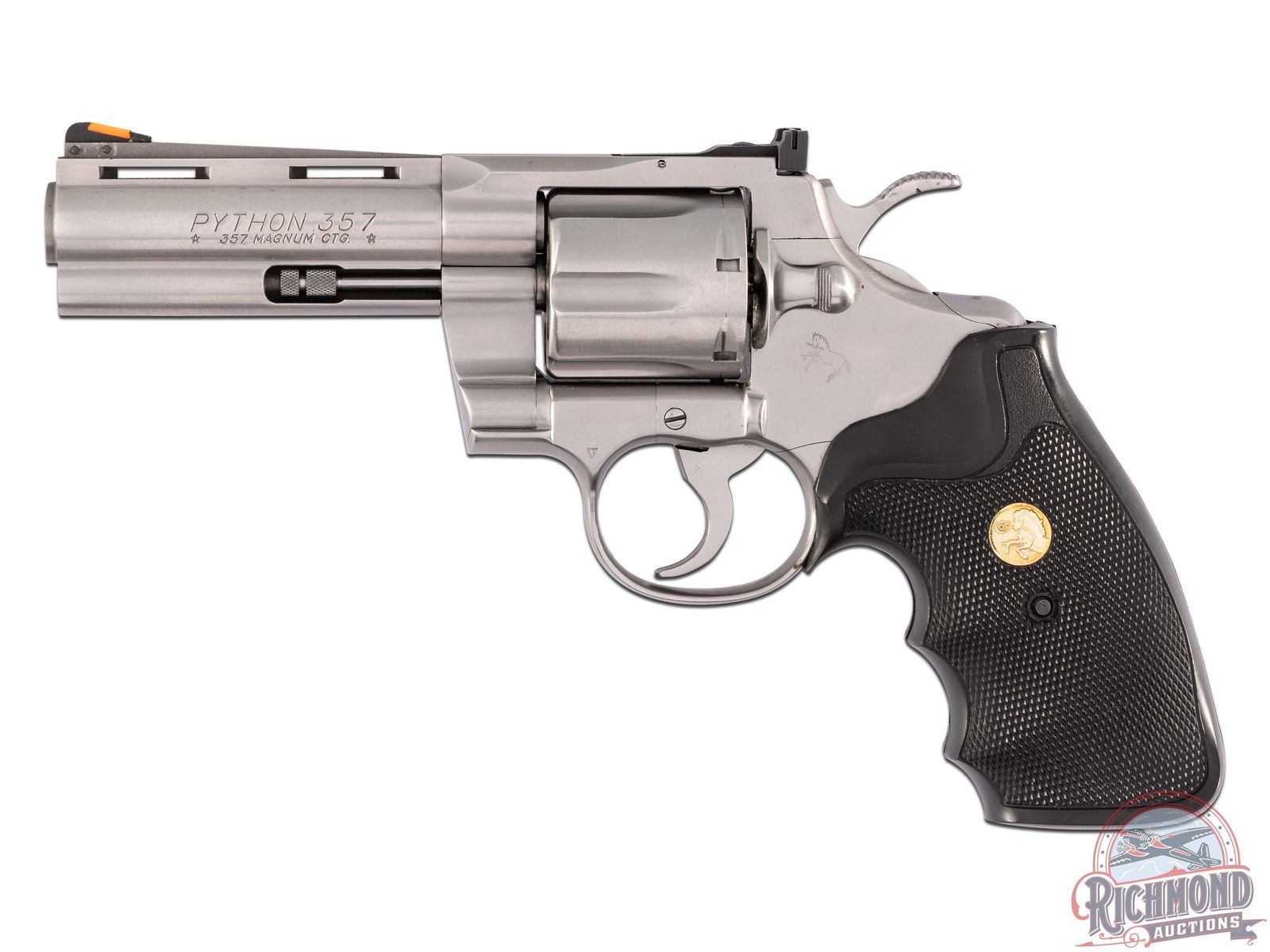 Manufactured in 1990. This stainless snake gun features a 4" ventilated rib barrel with full length ejector shroud. Rear adjustable white outlined notch with highlighted front ramp sights. Left side of the barrel is stamped "PYTHON .357 /* 357 MAGNUM CTG*". Right side of barrel is stamped with a single line Colt address. Left side of the frame is stamped with the Rampant Colt logo. Brushed stainless steel finish with a six round fluted, swing-out cylinder chambered for 357 Magnum or 38 Special cartridges. Fitted with Colt factory checkered rubber, finger grooved grips. CALIBER: 357 MAG. S/N: T84427. FFL STATUS: Modern.