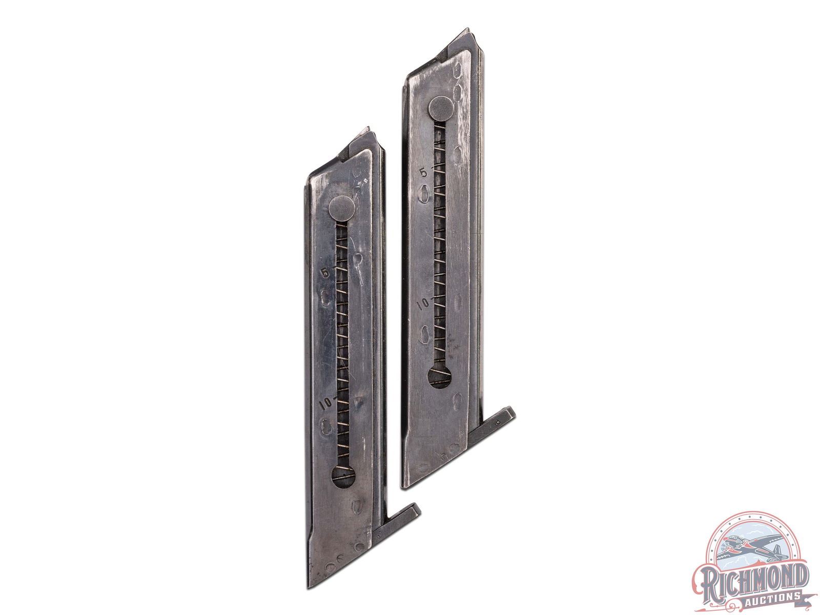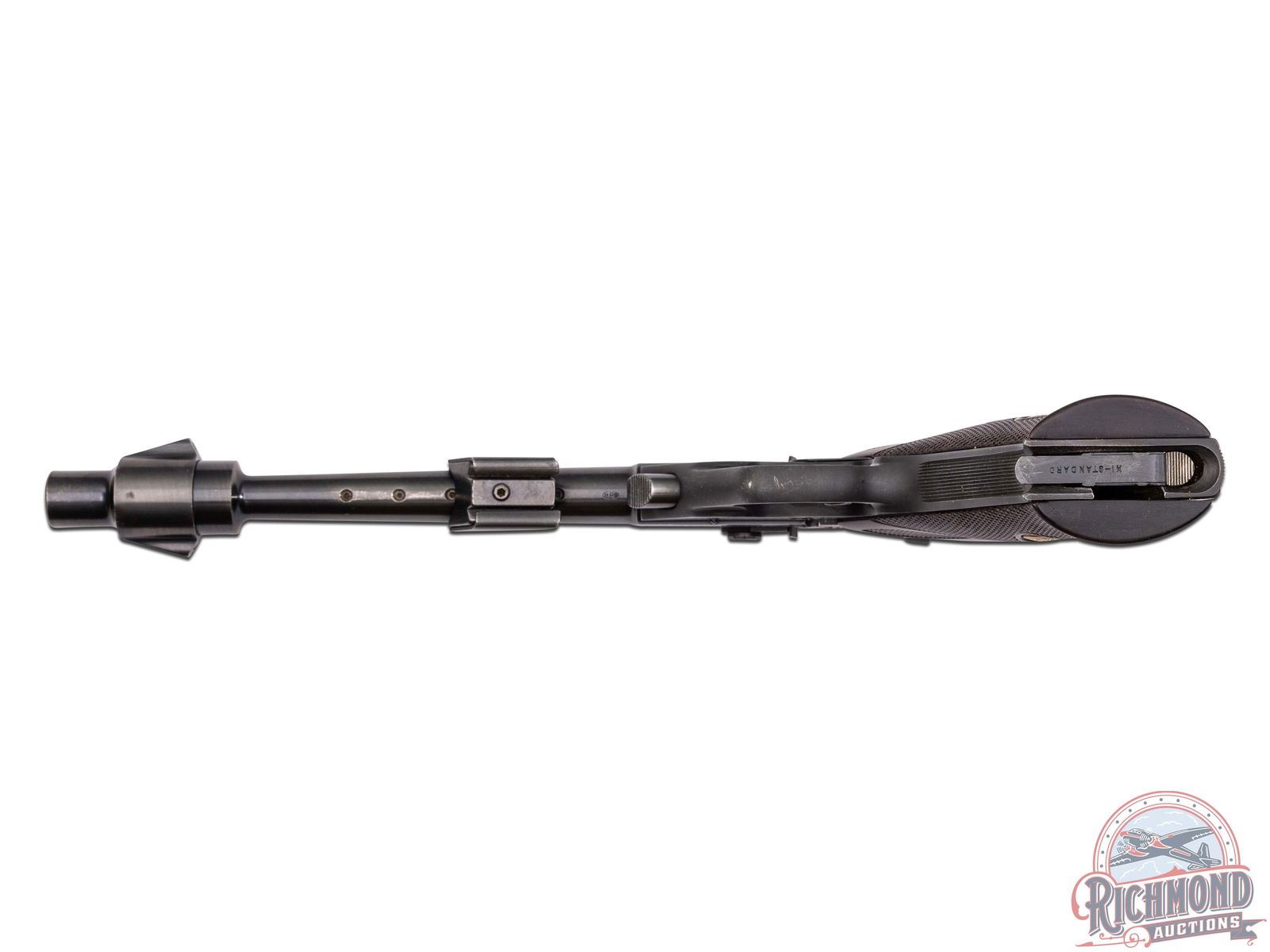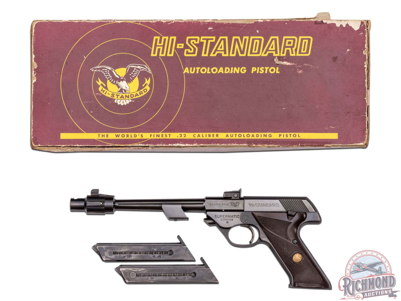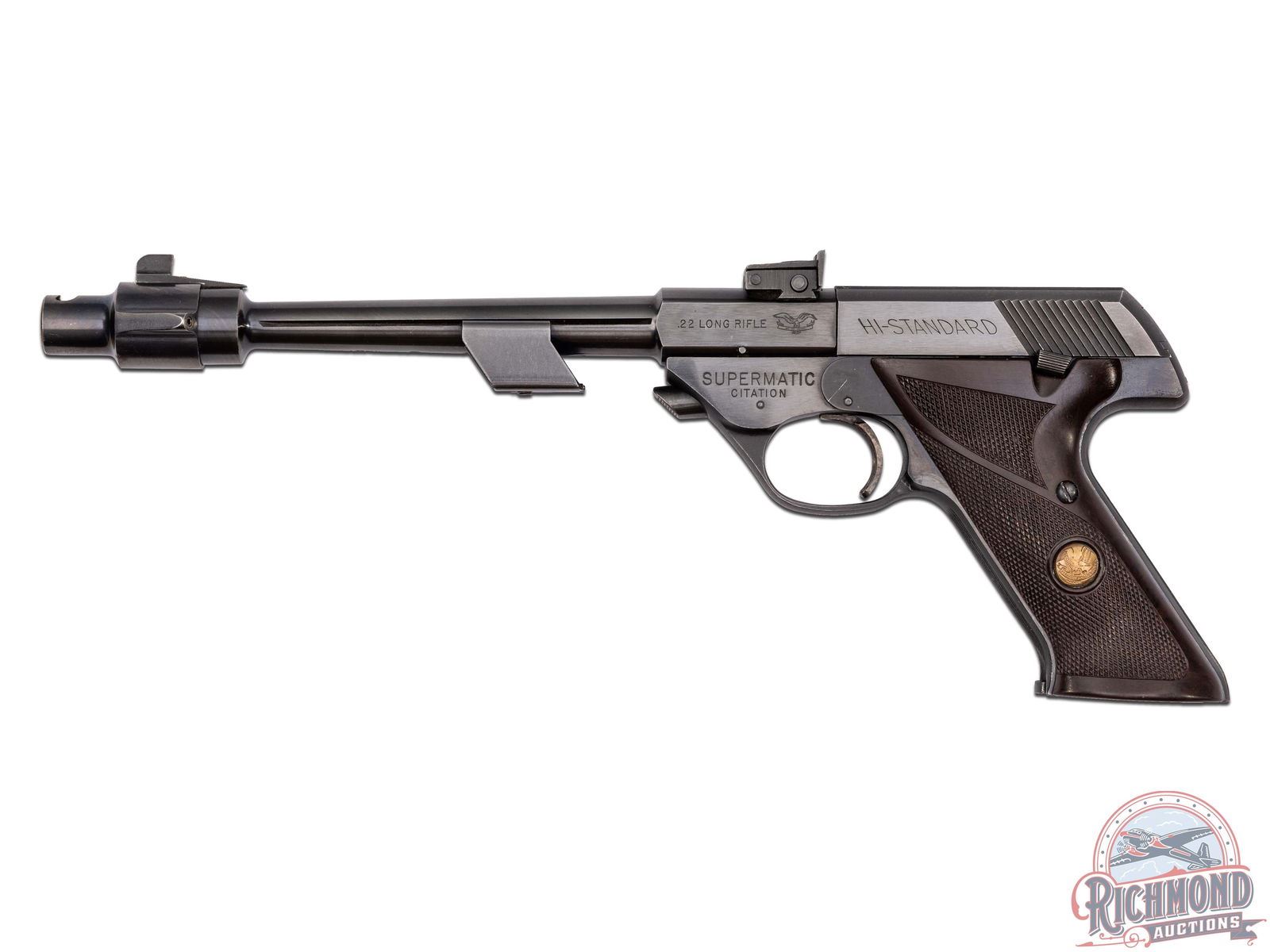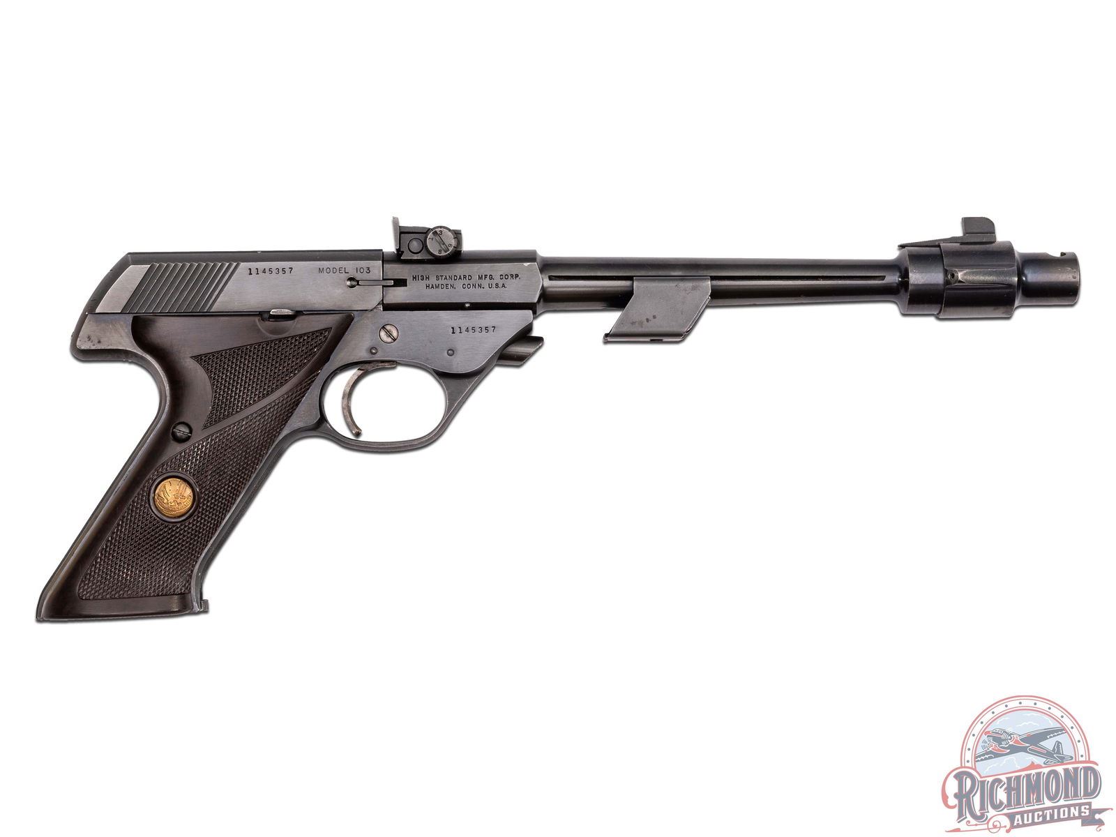 Manufactured in 1965. This great target pistol features an 8" tapered blued barrel with a 2oz adjustable weight and enlarged register at muzzle end to hold a removable muzzle-brake. Rear adjustable notch sight mounted on barrel and ramped blade front sight. Left side of the slide is stamped ".22 LONG RIFLE" with the Eagle logo and "HI-STANDARD". Left side of the frame is stamped "SUPERMATIC / CITATION". Right side of the slide is stamped with the two-line High Standard address, serial number and "MODEL 103". Matching serial number stamped on the frame below. Fitted with factory brown checkered synthetic grips with gold tone medallions. Includes (3) factory 10-round magazines and original factory box. CALIBER: 22LR. S/N: 1145357. FFL STATUS: Curio & Relic.