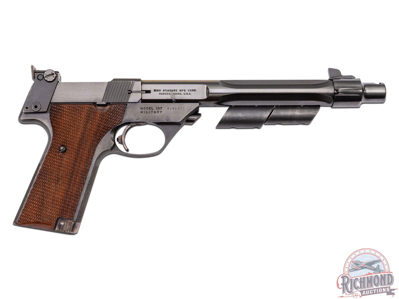 Manufactured in 1969. This great target pistol features a 7-3/4" fluted blued barrel with 2oz and 3oz adjustable weights and an enlarged register at muzzle end to hold a removable muzzle-brake. Rear adjustable notch sight mounted on rear of the frame and ramped blade front sight. Left side of the slide is stamped ".22 LONG RIFLE" with the Eagle logo and "HI-STANDARD". Left side of the frame is stamped "SUPERMATIC / >CITATION<". Right side of the slide is stamped with the two-line High Standard address, and "MODEL 107 / MILITARY" and serial number stamped on the frame below. Matching serial number stamped on top of the slide. Stippled grip straps. Fitted with factory walnut checkered target grips with right hand thumb rest. case-hardened trigger and mag release. Includes a 10-round magazine. CALIBER: 22LR. S/N: 2185270. FFL STATUS: Curio & Relic.