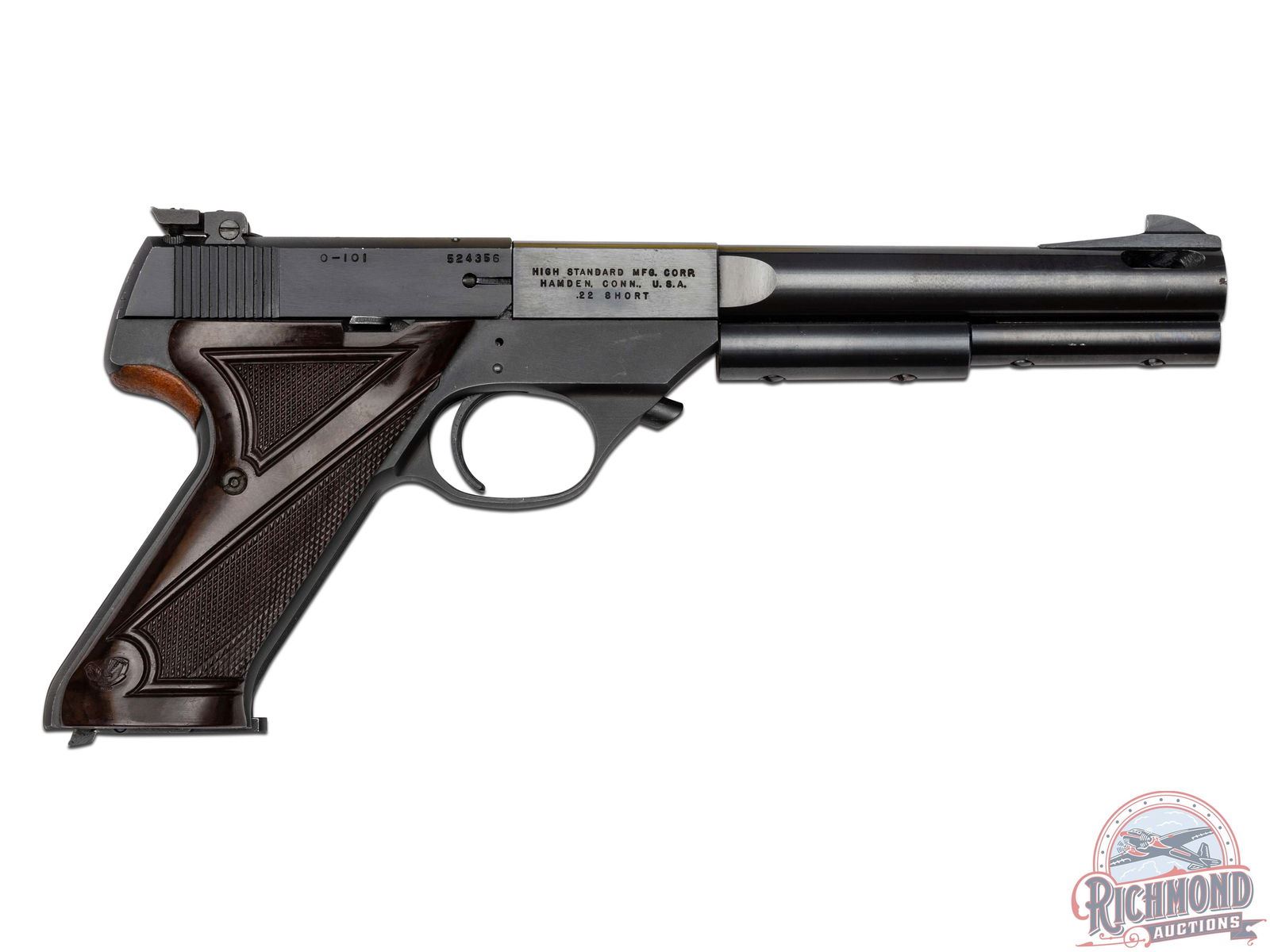 Manufactured in 1955. This great target pistol features a 6-3/4" blued ported barrel with two weights. Rear adjustable notch sight and ramped blade front sight. Left side of the slide is stamped "OLYMPIC" and ">HI-STANDARD<". Right side of the slide is stamped "0-101", serial number and the two-line High Standard address with "22 SHORT" below. Grooved front and back grip straps and added pad. Fitted with factory brown checkered synthetic target style grips with right hand thumb rest. Includes factory 10 round magazine. CALIBER: 22 SHORT. S/N: 524356. FFL STATUS: Curio & Relic.
