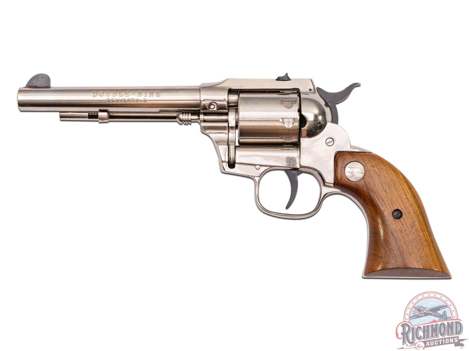 Manufactured in the late 1970's. This western magnum revolver features a 5-1/2" barrel with rear notch and front blade sight. Stamped on the left side of the barrel "DOUBLE NINE / CONVERTIBLE". Non-fluted swing-out cylinder holds up to 9 rounds in both the 22 LR and 22 Magnum cylinders, giving it its moniker. Scarce, nickel finish. Fitted with smooth walnut grips with the eagle logo medallions. Comes in the original factory box. CALIBER: 22 MAG / 22 LR. S/N: M026587. FFL STATUS: Modern.