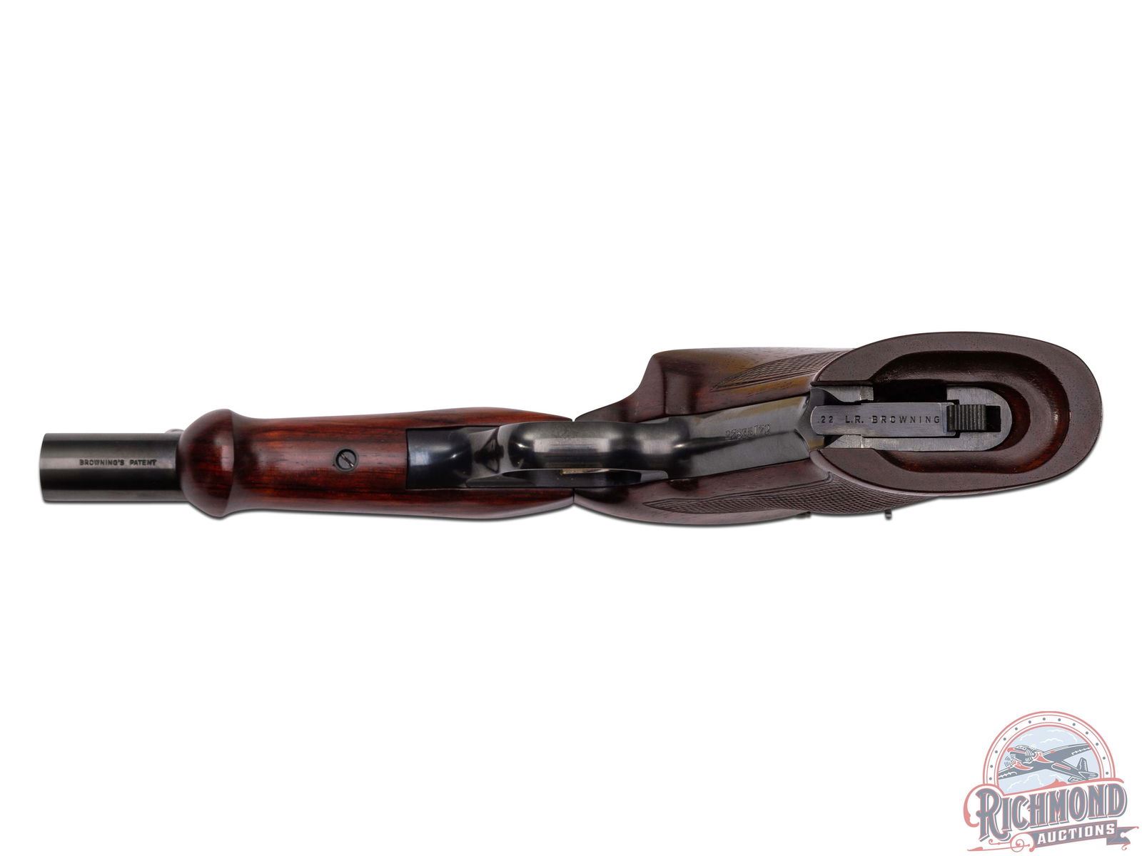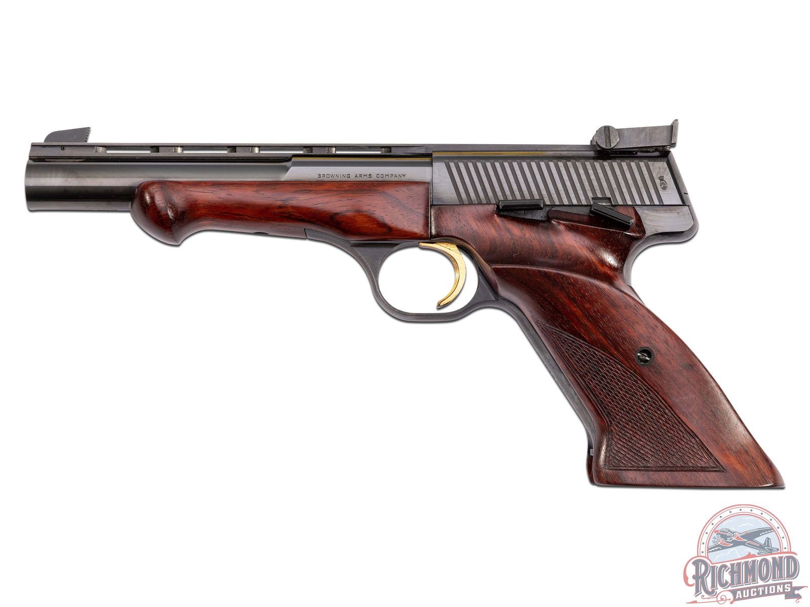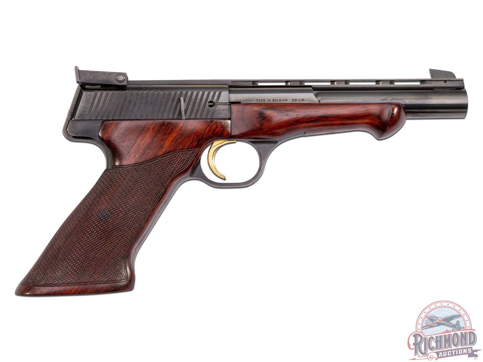 Manufactured in Belgium in 1970 with only a few hundred sold in the United States between 1977 and 1980. This beautiful target pistol features a 5-7/8" ventilated rib barrel with flat sides to round shape. Fully adjustable rear notch sight and blade front sight. Manual thumb safety and gold wash serrated trigger. One piece wrap-around checkered cherry wood grip with palm swell and right hand thumb rest. Matching foregrip. Includes factory Browning 10-round magazine. CALIBER: 22LR. S/N: 27635T70. FFL STATUS: Curio & Relic.