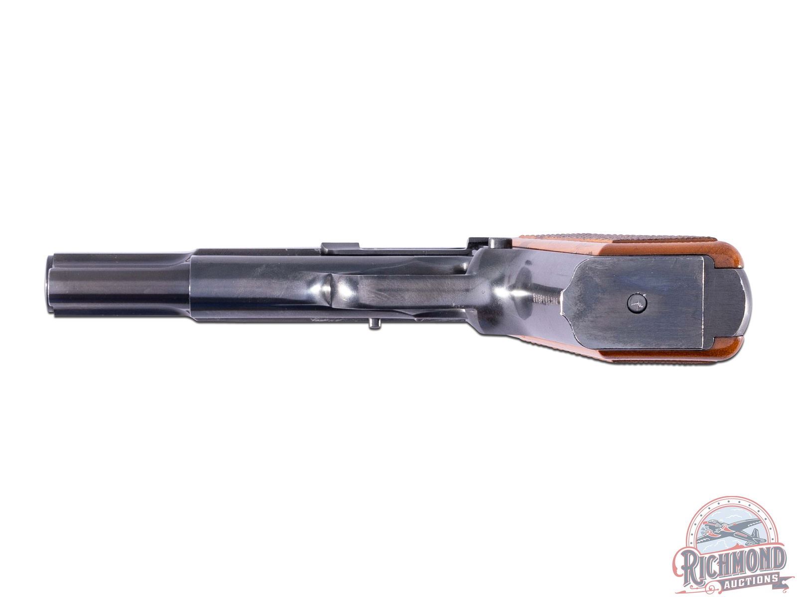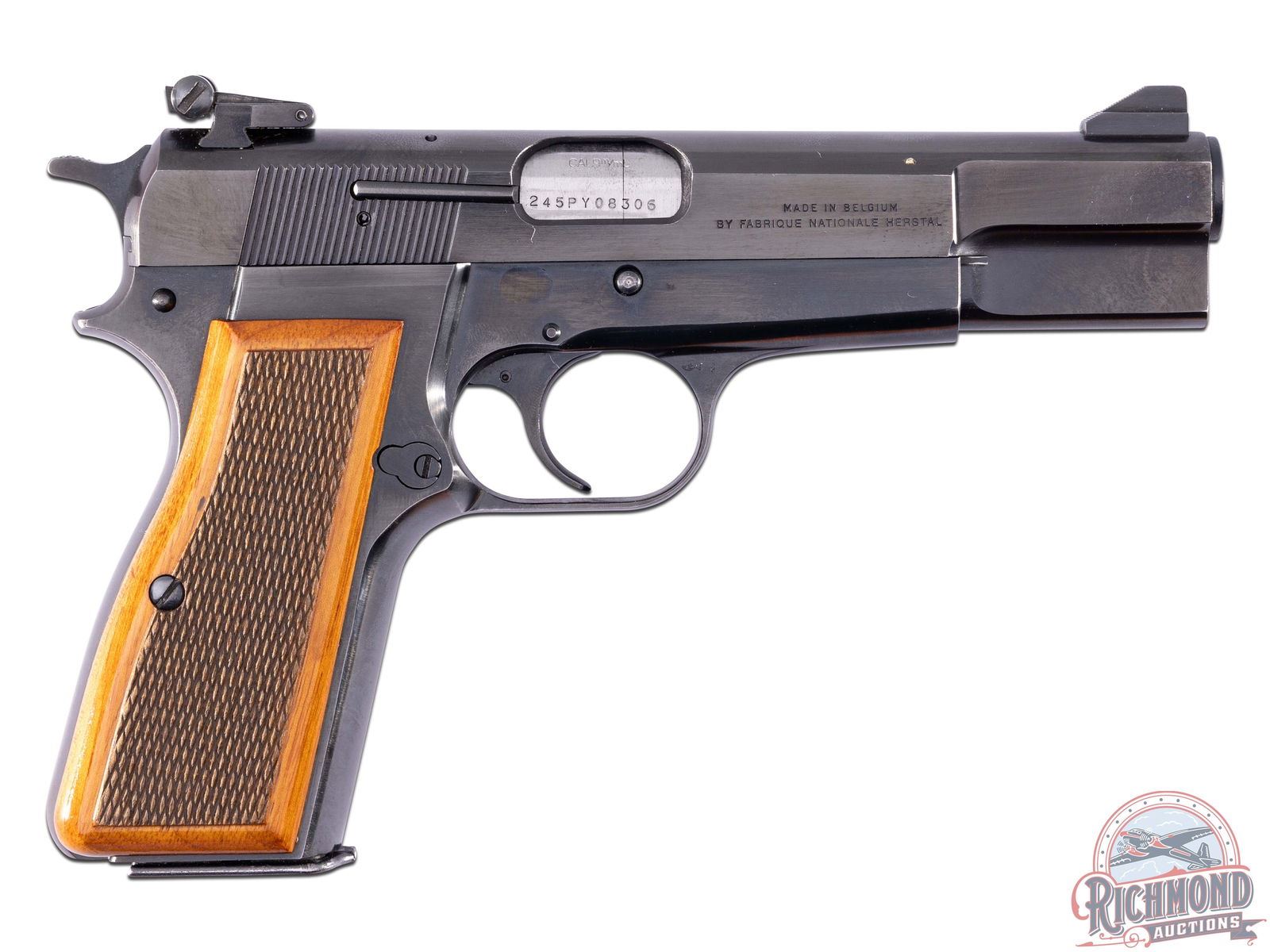 Manufactured in Belgium 1982. Features a 4-5/8" barrel with rear adjustable notch sight and ramped blade front sight. Chambered for the popular 9mm luger cartridge. Blued finish with serrated slide. Fitted with factory checkered wood grip panels. Includes a 13 round magazine. CALIBER: 9mm. S/N: 245PY08306. FFL STATUS: Modern.