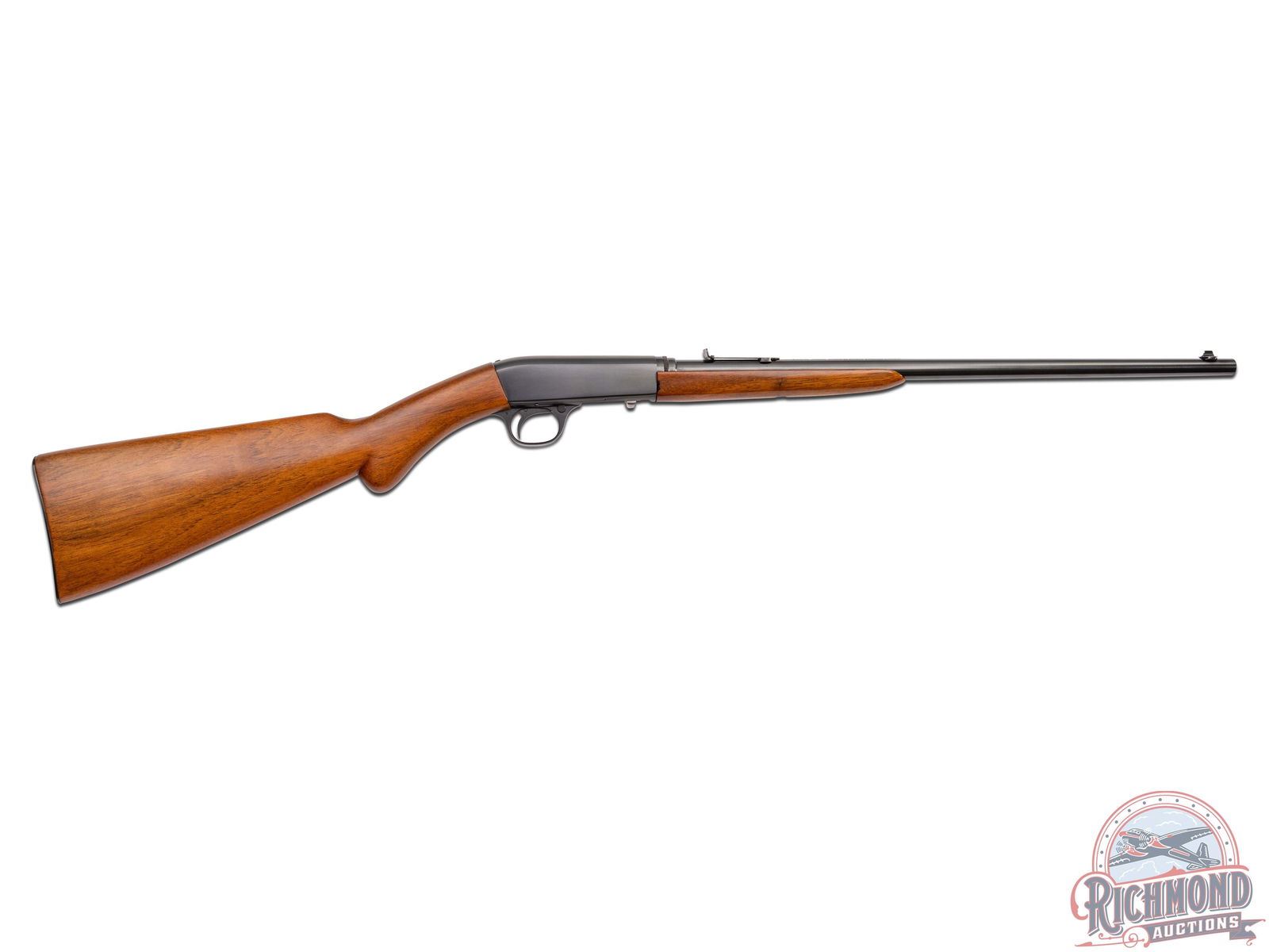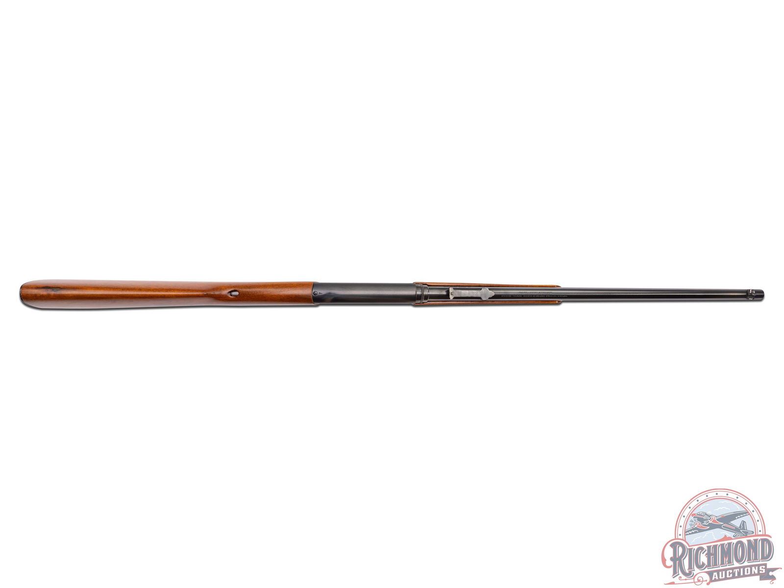 Made in Belgium by Browning, circa 1914. This rifle is generally not seen in this country due to the fact that they were not imported until 1956 as the "SA" model. 19-1/4" blued round barrel in 22 Short caliber with bead pedestal front sight and stamped steel rear notch sight with Browning Herstal address and caliber markings. Blued takedown receiver with "FN" marked trigger guard, push button safety and Belgium proofs on bolt. Plain walnut stock with Model "A" style loading port in front of comb on tang. Round knob pistol grip architecture stock with blued smooth butt plate and tubular magazine. Matching plain walnut splinter forearm. Seldom seen gun in this country. CALIBER: 22S. S/N: 23358. FFL STATUS: Curio & Relic.