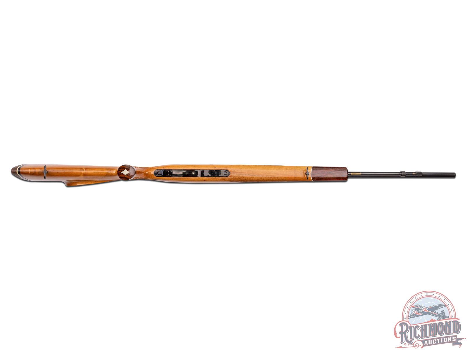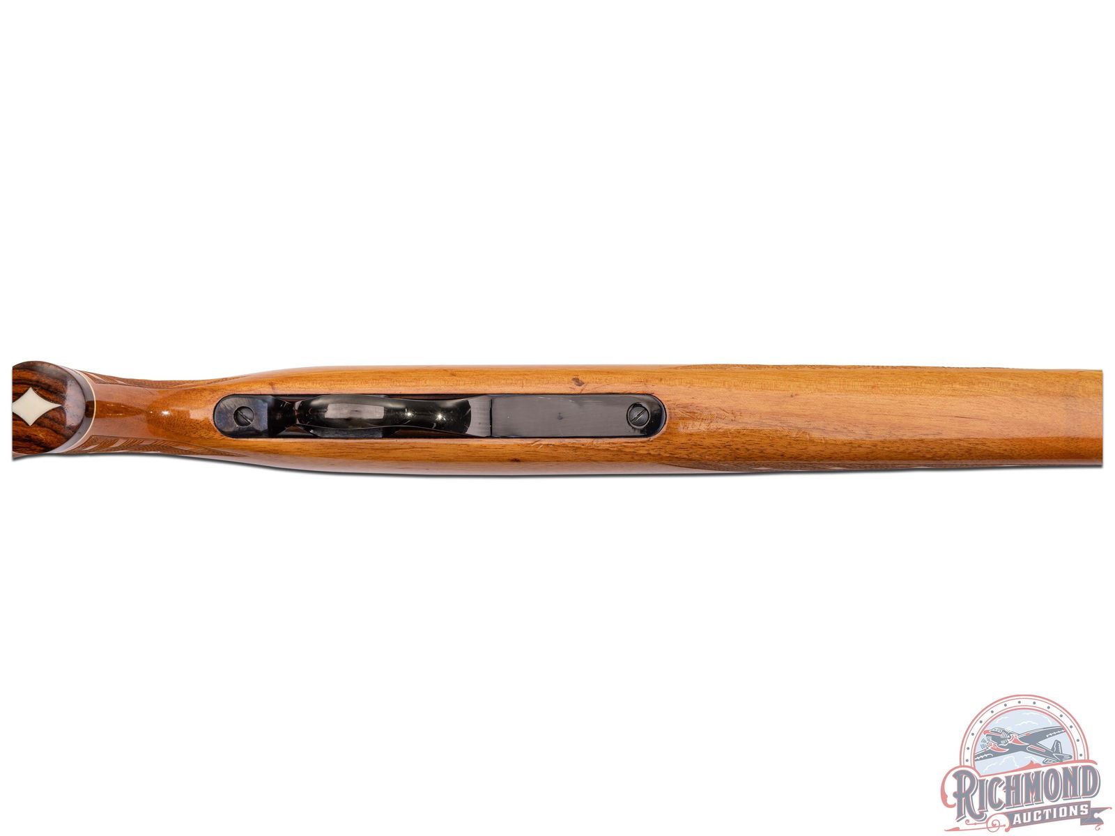 Manufactured circa 1978 by Weatherby in Japan. Features a 24" blued tapered barrel with 3-range leaf flip-up rear notch and front blade with brass bead sight. Tubular magazine feds a semi-automatic action with half jeweled bolt. Blued receiver with dovetail groove. Tang mounted manual thumb safety and blued steel trigger guard. High gloss wood stock with skip-line checkering on pistol grip and forearm. Right side cheekpiece. White lined Rosewood tip and pistol grip cap with white diamond inlay. Fitted with a black and white lined factory brown recoil pad. Equipped with sling swivels. LOP: 13-1/2". CALIBER: 22 LR. S/N: T11503. FFL STATUS: Modern.