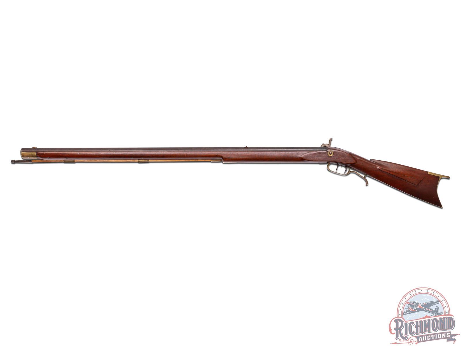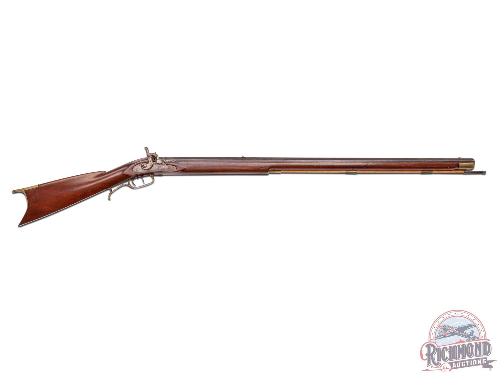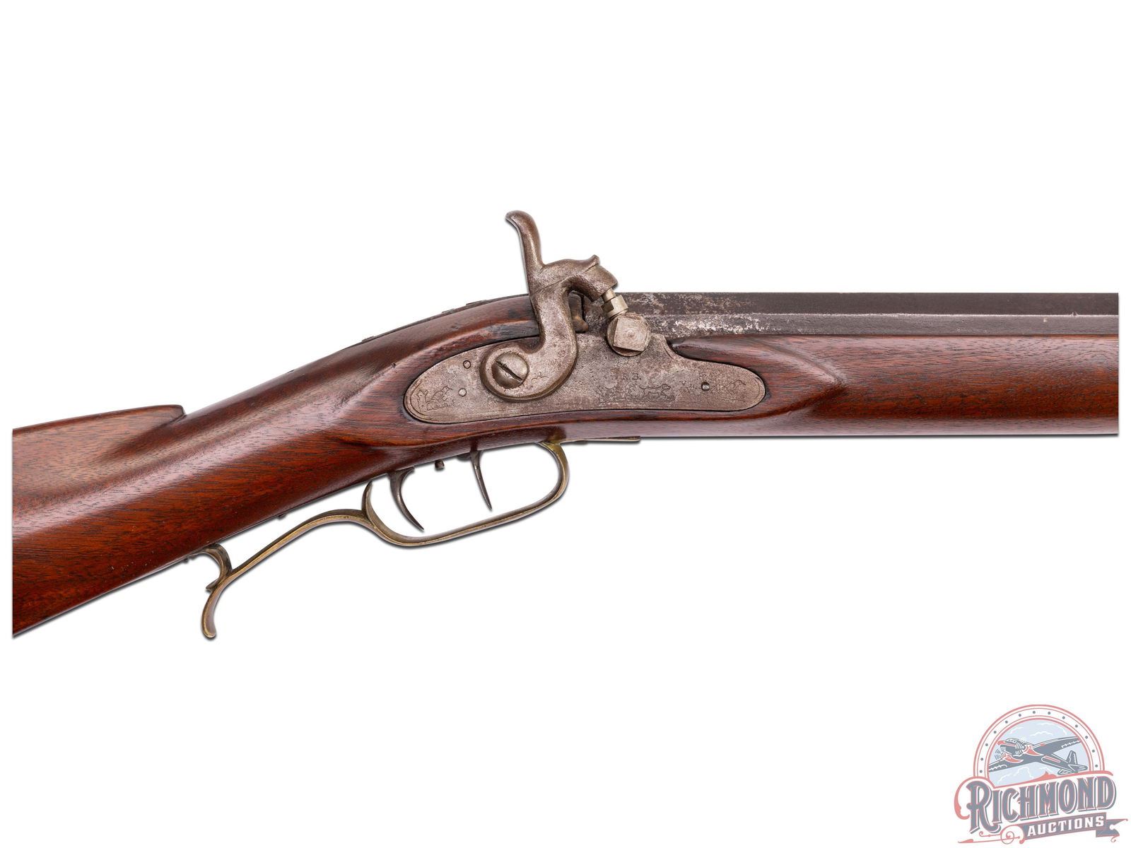 Percussion Kentucky rifle made by J.P. Guyer of Lycoming County, Muncy, PA., circa 1870. Rifle measures 51" overall with a 35-3/4" octagon 44 caliber rifled barrel with hunting sights and stamped "J.P. Guyer Muncy, Pa.". Commercial percussion lock marked "R.B." with double set trigger control. Full walnut stock with brass hardware. Comes with original hardwood ramrod. CALIBER: 44. FFL STATUS: Antique.