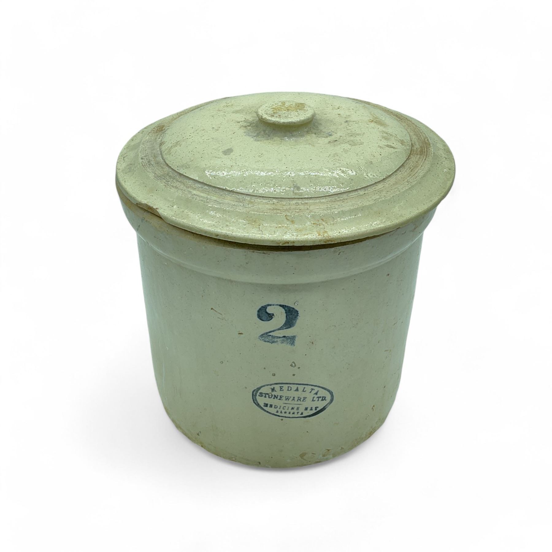 Medalta Stoneware LTD Stoneware Crock with Lid, 8-3/4" Tall x 8-3/4" Diameter (at widest part), Marked "2" and "Medalta Stoneware LTD, Medicine Hat Alberta