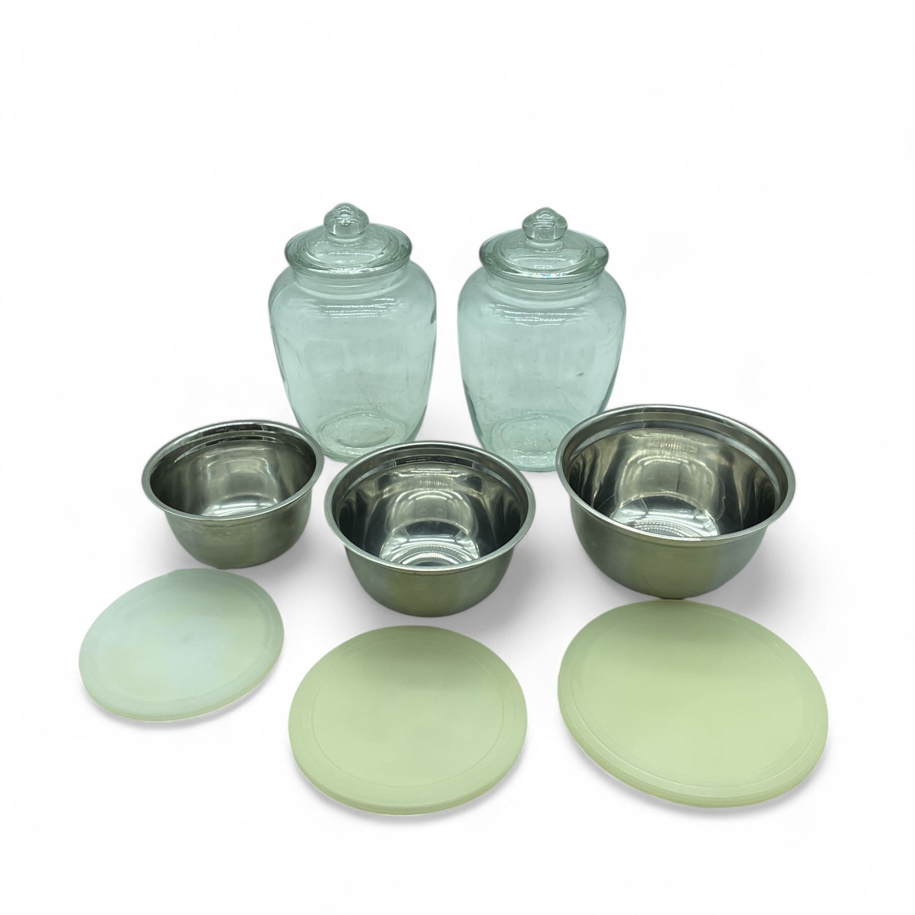 Lot 730 3 Piece Mixing Bowl Set with Lids and 2 Large Glass Candy Jars