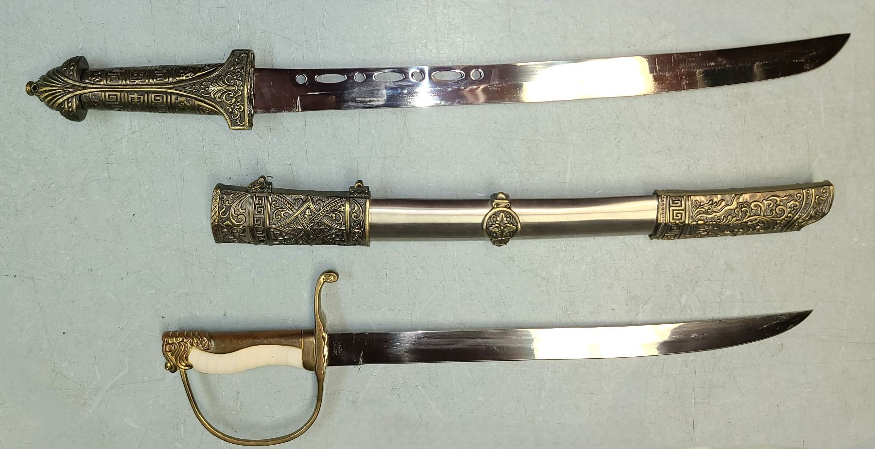 One has no sheath - Largest one with Tanto style blade measures 21 inches long..