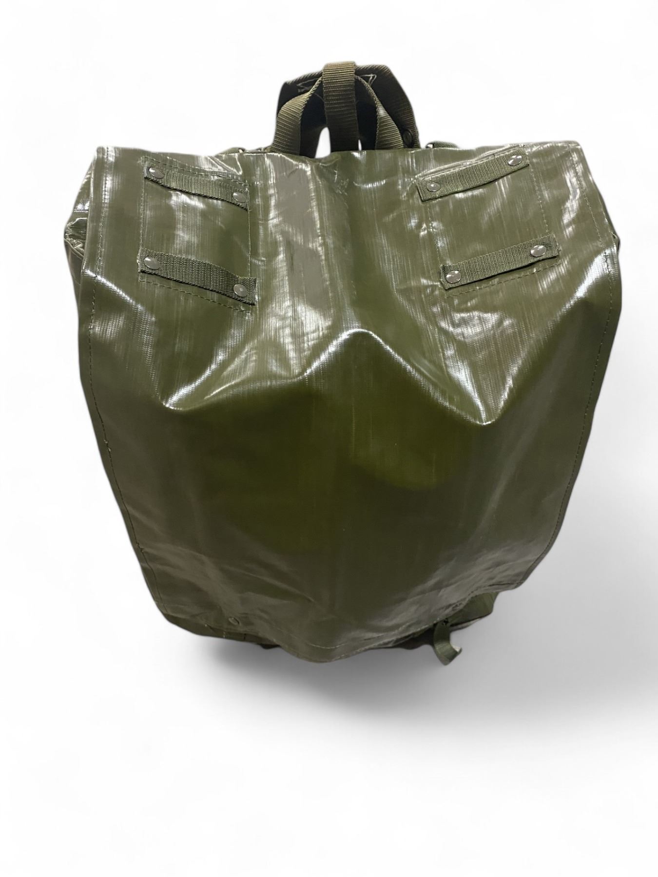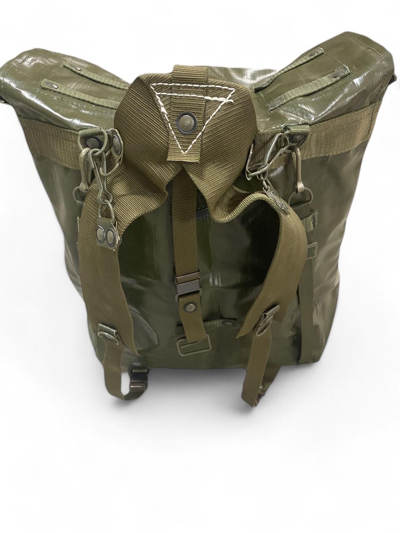 Great water resistant bag from the Czech Army. This is a good general purpose bag that will keep out the rain. A large main compartment and 2 smaller ones will fit all of your gear. Two narrow shoulder straps are attached to the pack with spring hook attachments and comes with wider shoulder strap harness. These may have some marks or fading from storage but are in very good condition. Keep your kit dry and slap it in one of these.