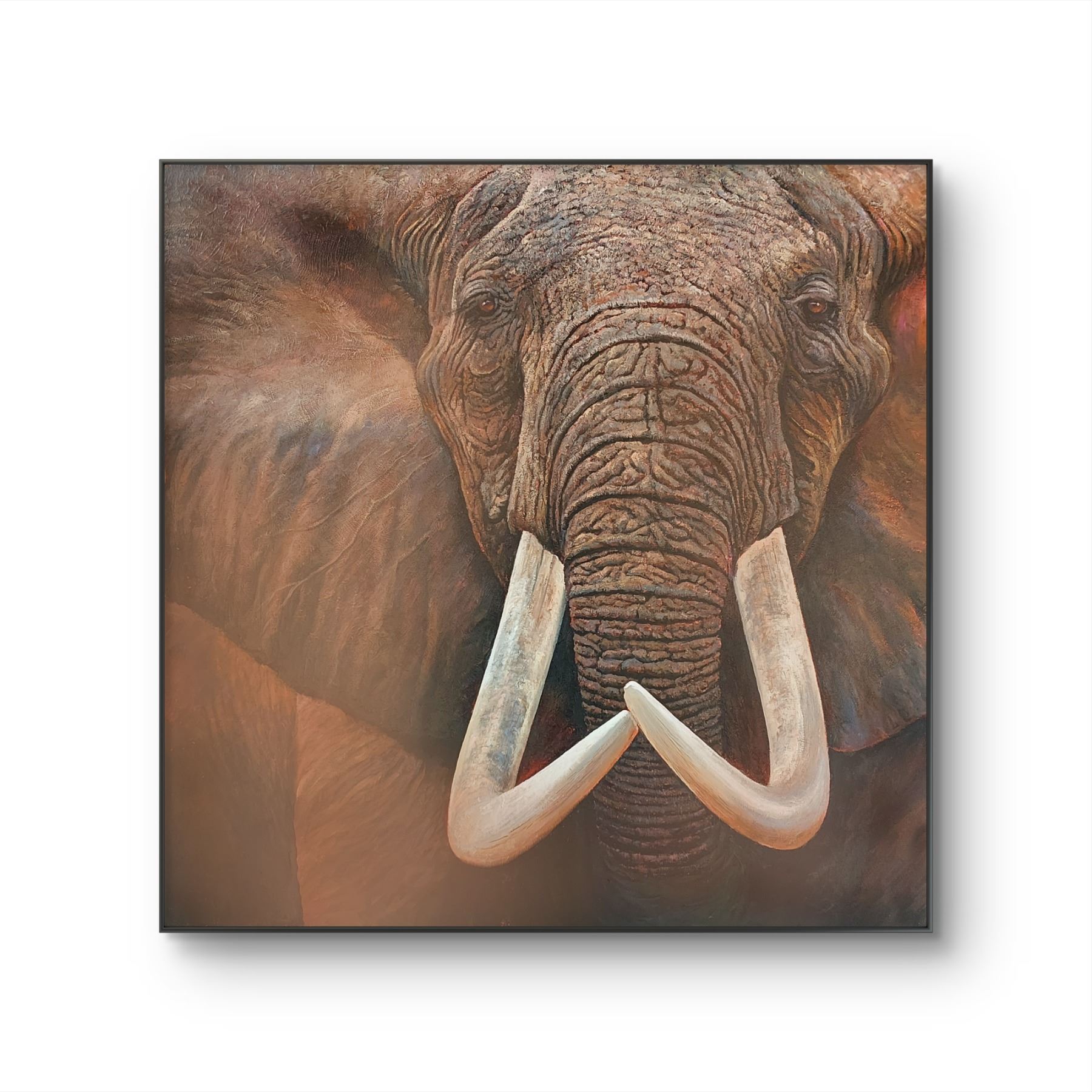 "DIDA" - Original mixed media painting on canvas by wildlife artist Sannette Boshoff. DIDA (or "Gift of God") was a truly special African elepant cow known for its gigantic tisks and the longest ever recorded for a female. The painting is 40"x40" on cotton canvas, mixed media of acrylic texture paste, wound dressing, paper towels and acrylic ink. Per Boshoff - "Male elephants are always admired and revered for their large tusks, while the females are often overlooked and receive little or no recognition. DIDA epitomizes not only the female of the species, but women in general. Their resilience and ability to overcome adversity and to take care of their family is admirable"...which is where the artist's reverence for DIDA originated. Sanette Boshoff.