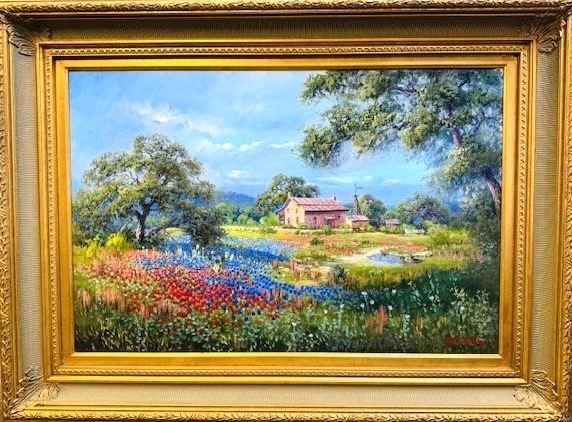 "Hill Country Home" - Original oil on canvas by Texas landscape artist Kay Walton, measures 24"x36" in a beautiful gold tailored frame. Walton is a full-time artist known for her paintings of Texas landscapes, especially the beautiful Hill Country dotted with bluebonnets, oak trees, sparkling streams, winding roads and quaint farmhouses. DALLAS SAFARI CLUB THANKS SOUTHWEST GALLERY FOR THIS 100% DONATION. Mike Downs, 972-960-8935, 214-704-0214, 4500 Sigma Rd., Dallas, TX 75244, mike@swgallery.com, SWGallery.Com, BOOTH #2416.