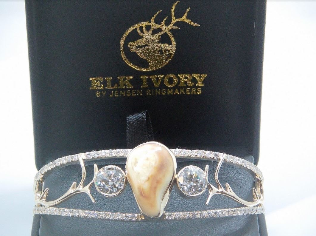 "Imperial Autumn Glory" - Gorgeous 14k gold cuff featuring elk ivory surrounded by 4cts of lab grown diamonds. Whether you're dressing up or down, this lovely one-of-a-kind statement bracelet will complement any attire and is sure to turn heads. DALLAS SAFARI CLUB THANKS JENSEN RINGMAKERS FOR THIS 100% DONATION. Erik Armijo, 208-734-7933, 133 Shoshone St N., Twin Falls, ID 83301, erik@jensen-jewelers.com, ElkIvory.Com, BOOTH #2657.