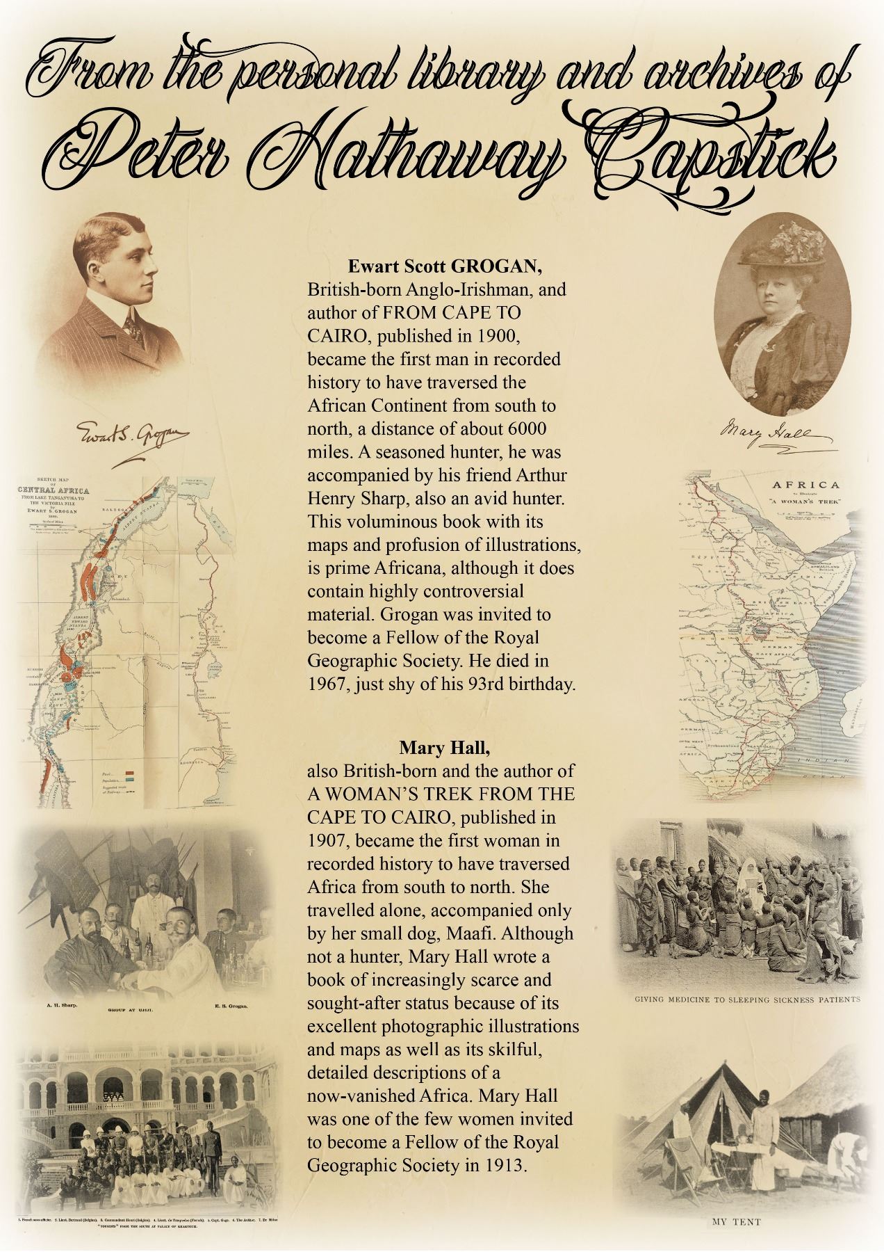 Ewart Scott Grogan, author of FROM CAPE TO CAIRO, published in 1900, and Mary Hall, author of A WOMAN'S TREK FROM THE CAPE TO CAIRO, published in 1907, became the first man and woman, respectively, in recorded history to have travelled overland from Cape Town to Cairo, a distance of about 6,000 miles. These two books, which are in collectible condition and of significant provenance, are accompanied by two highly sought-after maps of the African Continent, both professionally encapsulated in beautiful matching frames. Together, they form part of pioneering African hunting and exploration literature, a literature dominated by the English language. Ewart Grogan, an Anglo-Irishman born into a distinguished family in England in 1874, undertook his historic hunting and exploration safari in 1896, in order to win the approval of his future aristocratic father-in-law who insisted he first do something 'worthwhile' with his life before he could marry his daughter. Grogan, a prolific hunter, wrote a book bursting with high adventure, near-death experiences, and excursions into hardly known cultures. His historic, successful journey resulted in fame, a personal audience with Queen Victoria… and marriage to the girl of his dreams. He became a founder of the British East African Protectorate - today's Kenya - where he was a feisty politician, bold entrepreneur, and the largest landowner. Grogan's increasingly scarce book, which is often highly controversial and provocative, is a key feature in any truly significant library of Africana devoted to African hunting and exploration. He was invited to become a Fellow of the Royal Geographic Society. This magnetic man died in Cape Town in 1967, just shy of his 93rd birthday, frail and alone. Mary Hall, born in England in 1857, became a world traveller who spent time in Australia, New Zealand, East Asia, the South Pacific, China, and Siberia. She is especially esteemed for her truly historic solo safari from the southern tip of Africa to Cairo in the extreme north of the continent. This intrepid woman set out alone in 1905, at the age of 48 and accompanied only by her small dog, Maafi, to traverse the African continent from the extreme south to the extreme north on foot, by rail and boat, in dugout canoes, in machilas and in rickshaws. Although a non-hunter, this remarkable woman brought alive a little-known world in all its wild beauty, assorted dangers, and diverse cultures of a now-vanished Africa through her elegant writing, her excellent photography, and important maps. This scarce book was part of an early force in helping women rediscover their strong independence through travel and, in so doing, to reconnect in numerous cases, with their hunting heritage. She was one of a miniscule group of women invited to become a Fellow of the Royal Geographic Society in 1913, just six years before her death in England at the age of just 62. DSC FOUNDATION THANKS FIONA CAPSTICK FOR THIS 100% DONATION. REFERENCE THE CHARITABLE DEDUCTION QUALIFICATIONS IN THE OFFICAL RULES SECTION OF THE AUCTION CATALOG. Fiona Capstick, ralli@mweb.co.za.