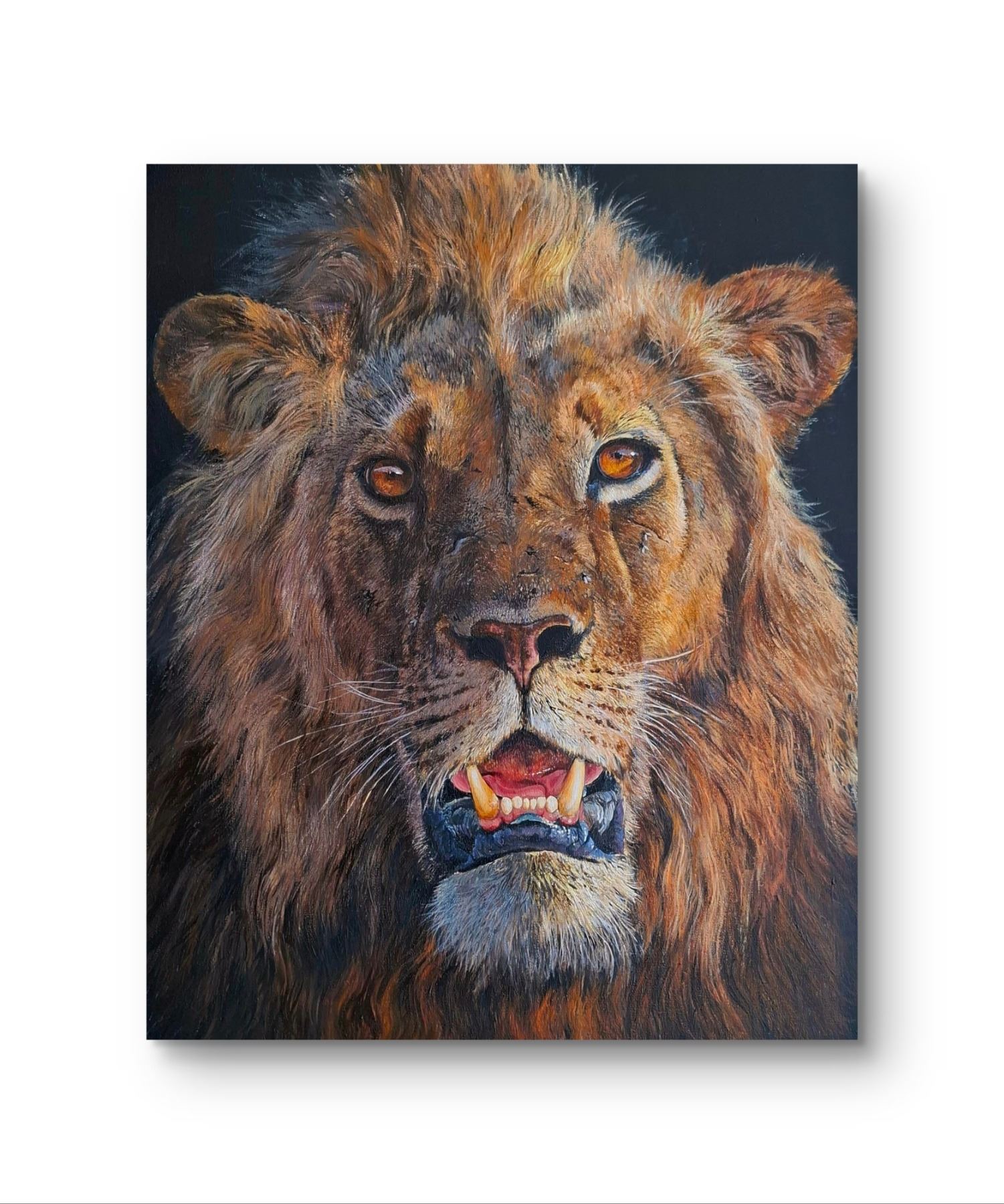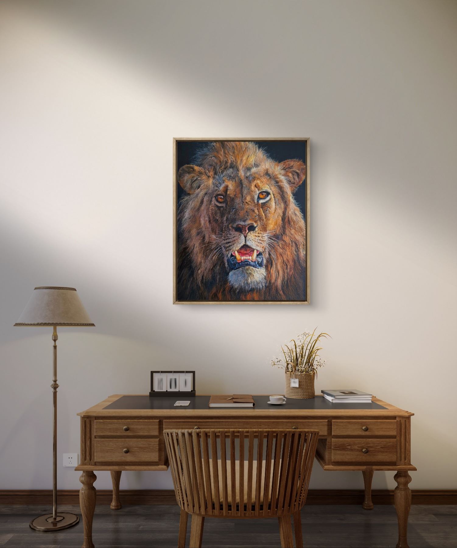 Original mixed media oil and acrylic on linen canvas by South Africa wildlife artist Dawie Fourie; measures 25"x33" stretched over a gallery wrapped framed. "Normally, I prefer narrative paintings where the animals are in a landscape and the landscape becomes part of the story as opposed to portraits. Although this piece was handled ike a landscape using typical landscape techniques to give shape and form, I had no other excuse to paint this lion as a portrait if not for the eyes - I wanted to paint the eyes." - Dawie Fourie. A self-taught artist with an affinity for the South Africa veld and wildlife since childhood, Fourie studied as a nature conservationist before starting a full-time career as an artist 28 years ago. Since, he's enjoyed 6 solo exhibitions, 30 group exhibitions and 6 private exhibitions throughout the USA, France, Dubai, Spain and Normandy. DALLAS SAFARI CLUB THANKS DAWIE FOURIE ARTS FOR THIS 100% DONATION. Dawie Fourie, 011 27 82 332 5641, PO Box 1010, Komatipoort, Mpumalanga 1340, SOUTH AFRICA, dawiefouriearts@gmail.com, SouthAfricanArtists.Com.