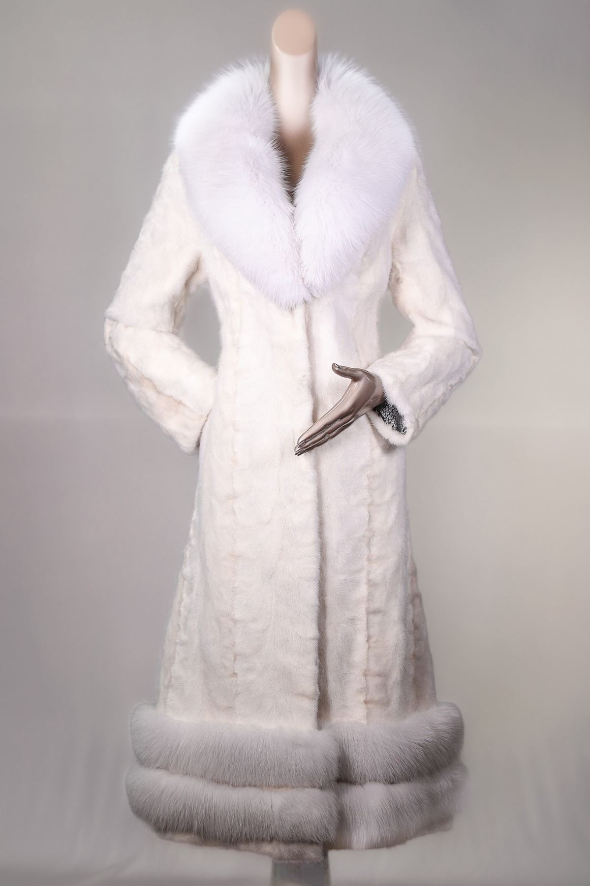 Ladies white mink full length sectional manufactured in Greece, with natural shadow fox shaw collar and double banded bottom. Jacket measures 48 inches and features open sleeves. Free sleeve alterations and exchangeable. This piece will require an extended period of time to reproduce in another size - visit donor at their booth for sizing. For over 70 years, internationally renowned Alaska Fur Gallery of Anchorage has met the fashion needs of discerning men and women. Malena Hausinger, 907-274-3877, 907-223-3678, 428 W 4th Avenue, Anchorage, AK 99501, info@akfurgallery.com, AKFurGallery.Com, BOOTH #2933.