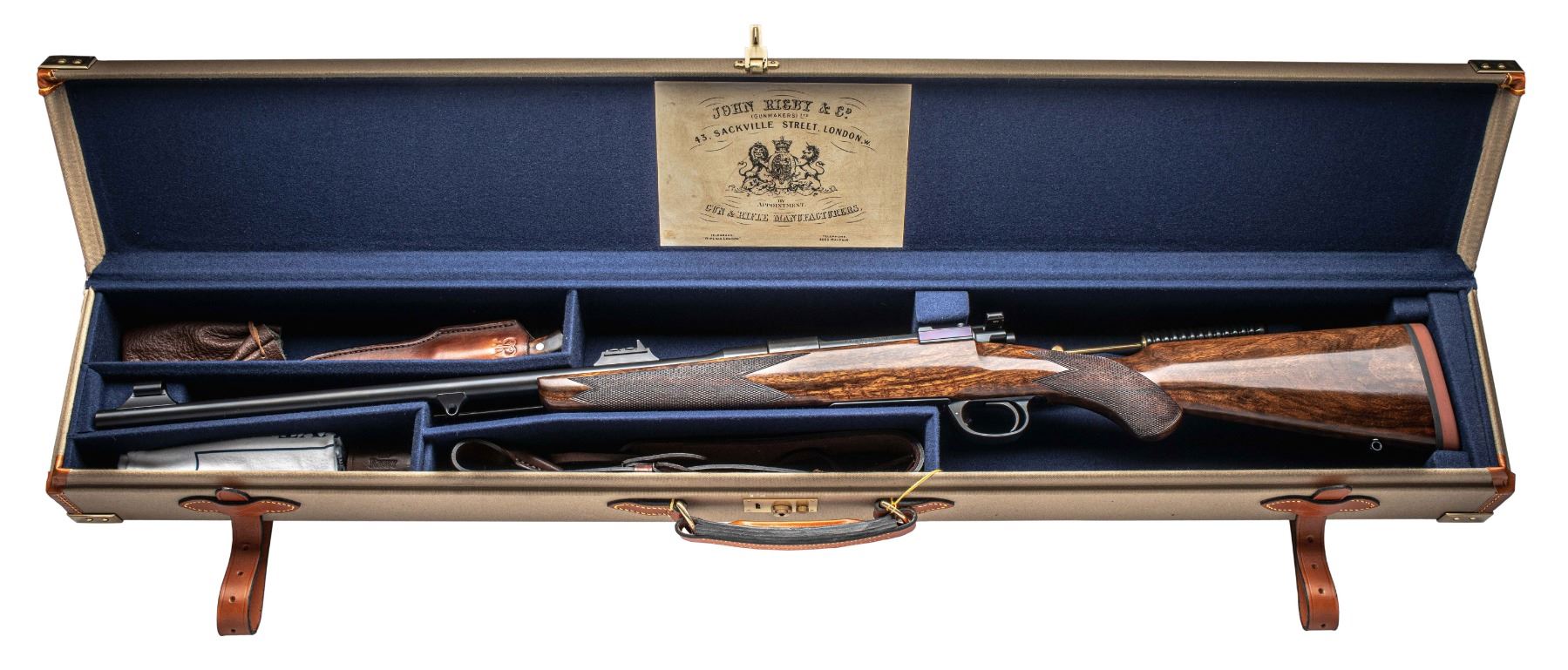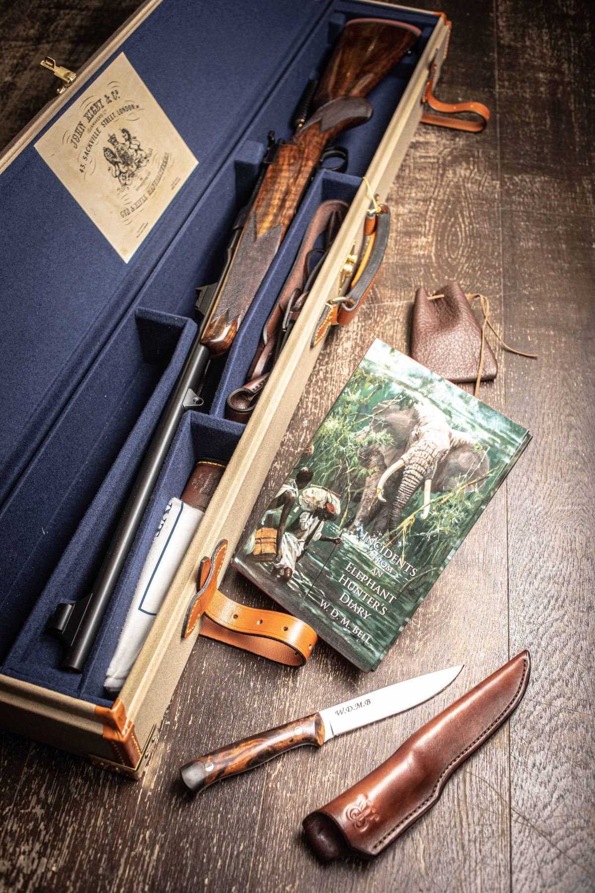 1) WDM BELL .275 RIGBY MAGAZINE RIFLE: Paying homage to iconic British adventurer 'Karamojo' Bell, John Rigby & Co. has donated a limited edition 'W.D.M. Bell' model of their Highland Stalker rifle. The iconic African big game hunter is celebrated worldwide as an advocate for accurate shot placement using smaller caliber rifles, namely with his Rigby Mauser 7x57 (.275 Rigby). Based on the original 1928 Rigby rifle design as taken from the historic ledgers at Rigby, on the magazine floor plate is the engraving of 'W.D.M.B', as per Bell's original rifle. Plus, the rifle has a Rigby spoon bolt handle and Mauser flag safety as ordered specifically to Bell's specifications. Similarly, the rifle features a Mauser 98 action, as well as an ivorine front fore sight and custom design rear half-moon sight, regulated at 100, 300 and 400 yards, as per the original rifle. Presented in a vintage style canvas case, the rifle comes with a limited-edition print of the Rigby ledger book where Bell's legendary original rifle is listed, a Rigby knife and a copy of new previously unpublished stories by Bell, 'Incidents from an Elephant Hunter's Diary', signed by all the Rigby gunmakers involved in production of this rifle.