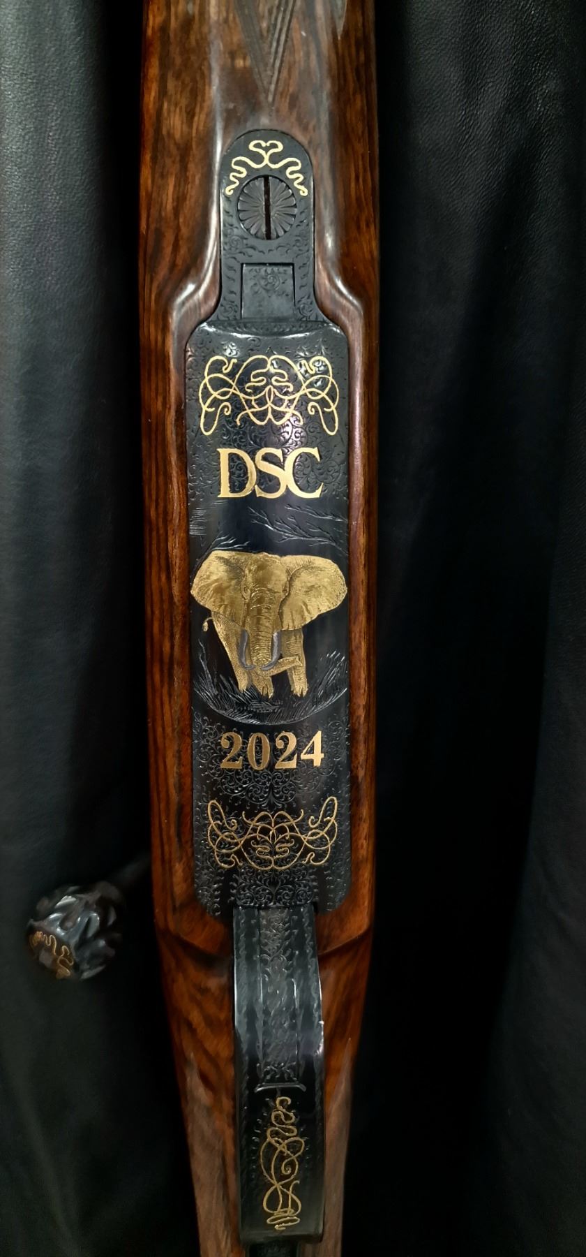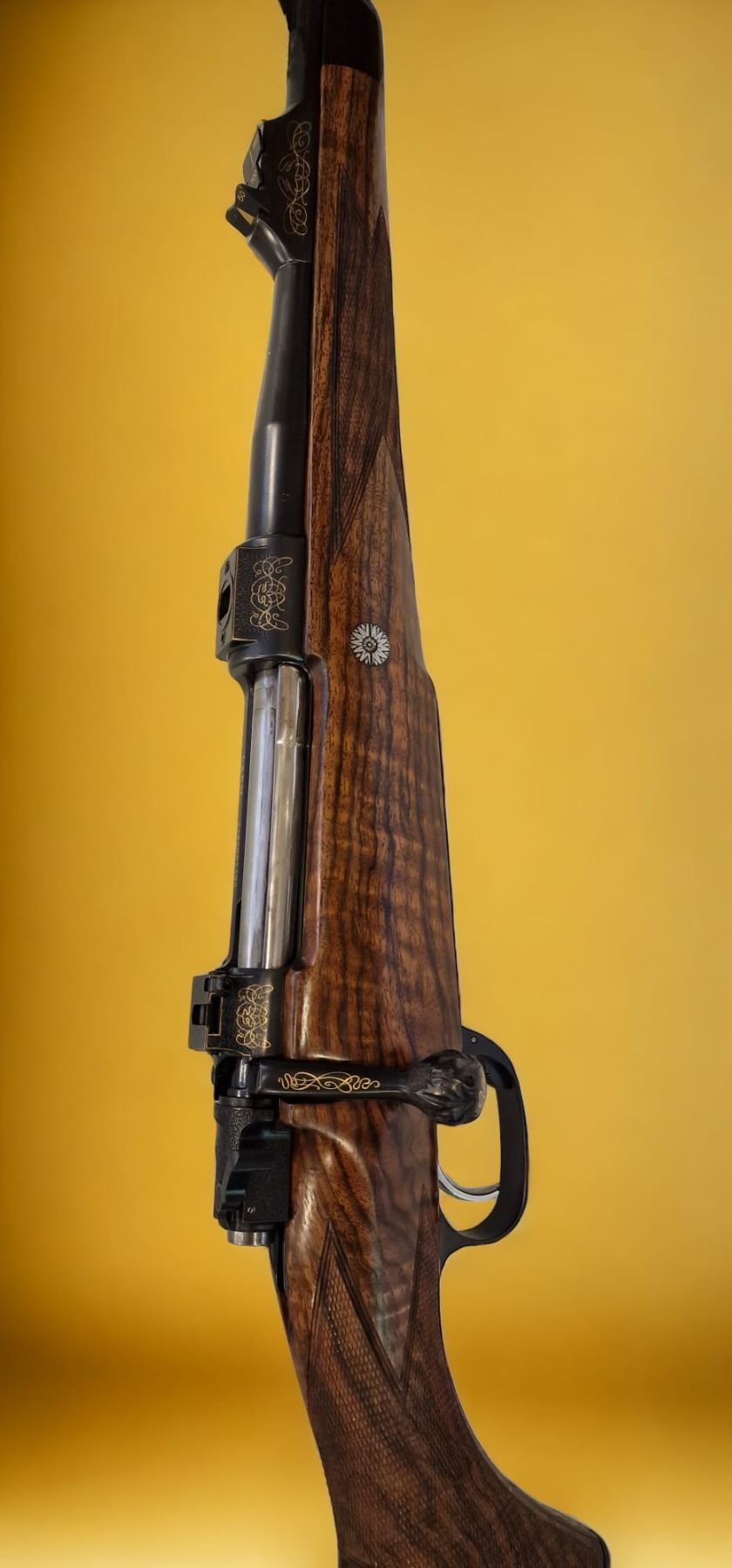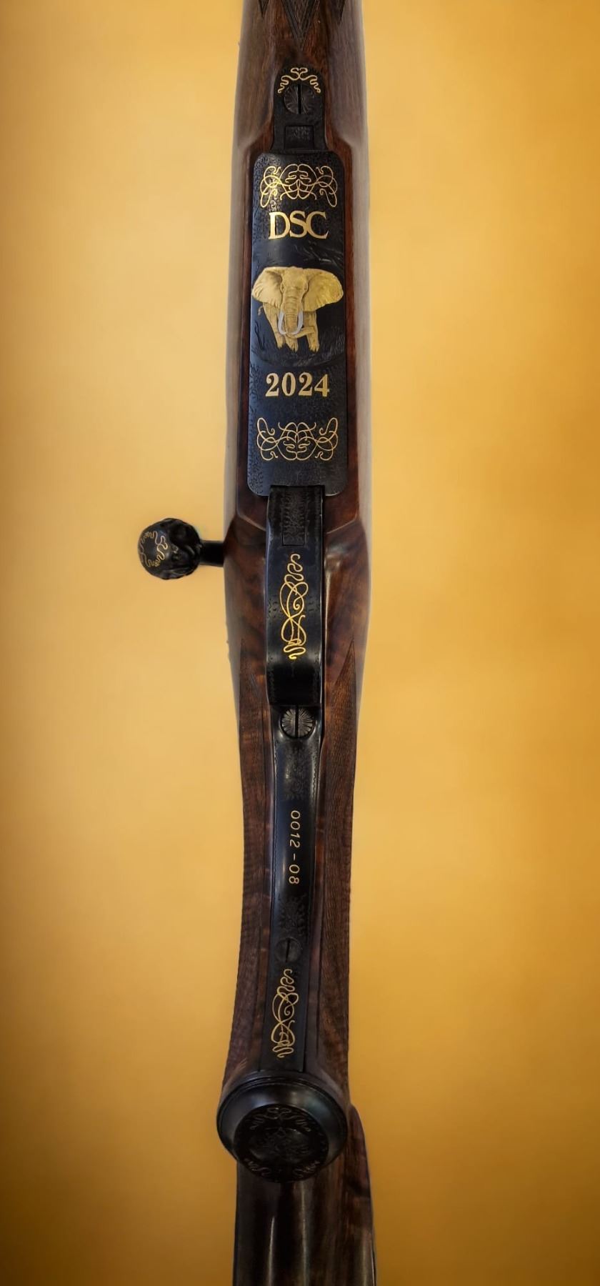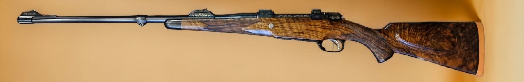 LARM Imperial Deluxe model bolt action rifle chambered in .458 Lott. Rifle features exhibition grade Turkish walnut wood with matte oil finish, match precision barrel with Boheler Rasant steel, Magnum 98 double square bridge action, 3-position safety, three leaflet sights with gold marks, adjustable fine trigger with set trigger, bolt ball contoured by polishing and the finest English floral details and gold inlays on the floor plate. This rifle was made in recogniction for DSC's great efforts and achievements in worldwide hunting and wildlife conservation. Alvaro Hernandez Arribas, 011 34 915 64 0949, 011 34 161 42 3059, Calle Infanta Maria Teresa 15, Madrid 28016, SPAIN, correo@armeriademadrid.com, BOOTH #4439.
