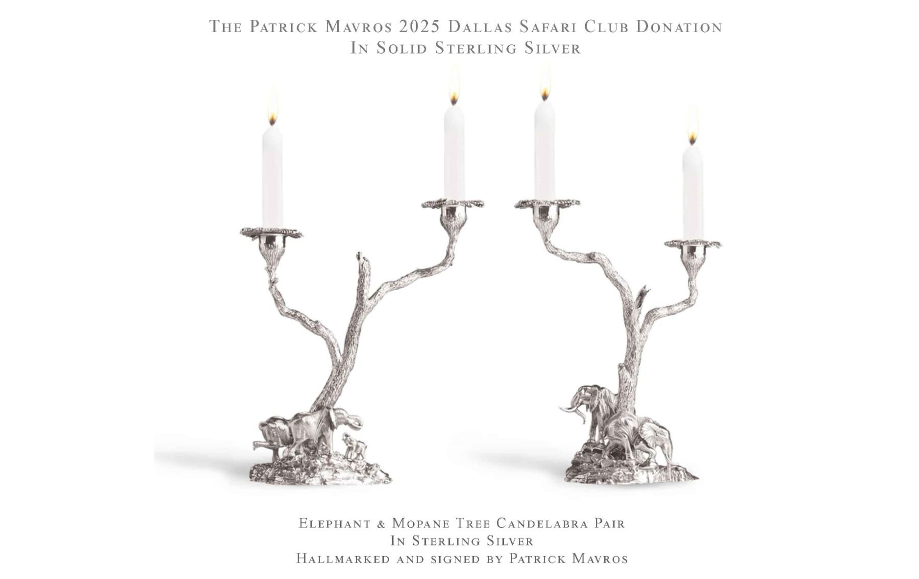 Classic solid sterling silver elephant and mopane tree candelabra pair hallmarked and signed by Patrick Mavros. [/b]DALLAS SAFARI CLUB THANKS PATRICK MAVROS ART FOR THIS 100% DONATION. Patrick Mavros, 011 26 34 860131, 104-106 Fullham Road, London SW3 6HS, ENGLAND, harare@patrickmavros.com,