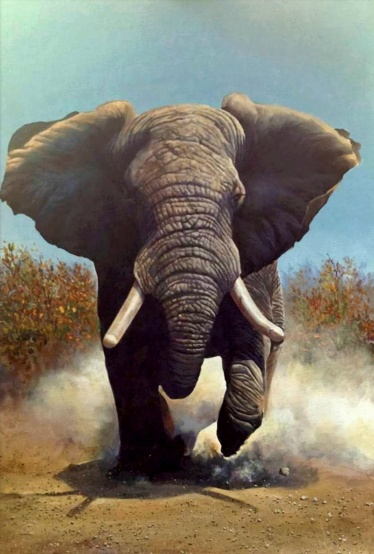 "Meaning Business" - Original oil on canvas by South Africa wildlife artist Dawie Fourie, measures 36"x48" unframed. "There are probably few experiences as heart-pounding as being charged by a fully grown elephant bull. Even though I have seen tens of thousands of photographs of elephants over the years, this particular one remains the single strongest image of an elephant charging" - Dawie Fourie (reference photo was taken near Shingwedzi in the North of the Kruger Park in 1964). Over the years, Fourie has spent countless hours studying, tracking, photographing and painting elephants. No other subject has ever surpassed his interest in or love for that of elephants. Dawie Fourie, 011 27 82 332 5641, PO Box 1010, Komatipoort, Mpumalanga 1340, SOUTH AFRICA, dawiefouriearts@gmail.com, SouthAfricanArtists.Com.