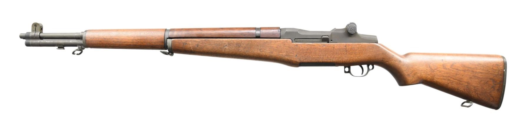 RIFLE. Cal. 30-06. S# 2327762. Bbl. 24". Marked on right side with two "WP" proofs, not in an oval. Bbl. is additionally marked "D35448 WRA." Throat and muzzle gauges: 1.0. Import-marked on left side of receiver. Locking bar rear sight. Blade front sight with protective ears. All major parts' markings are "WRA," including the slant-cut operating rod. Single slot gas cyl. lock screw. Milled trigger guard. Unmarked replacement walnut stock set. CONDITION: well-worn stock set with light staining and numerous handling marks. End of pistol grip has remnants of white paint. Metal parts retain 90% of their dark gray arsenal rework finish with light wear. Very good, shiny bore with sharp lands. (24-5427/RW). CURIO. $600-900.