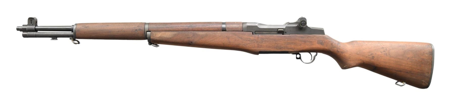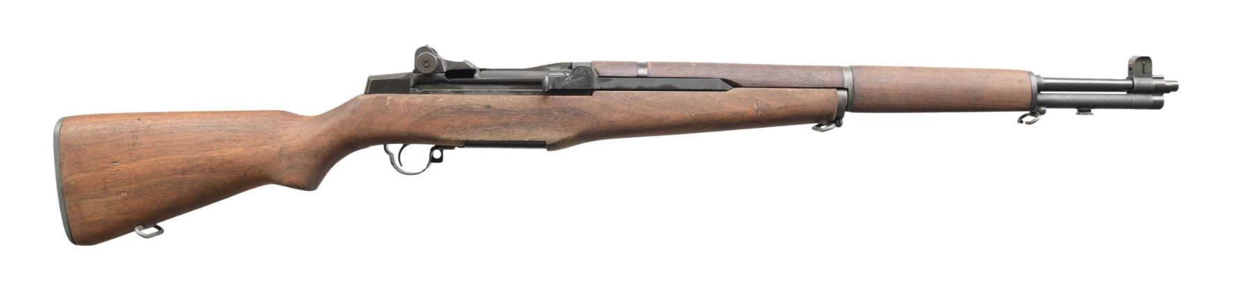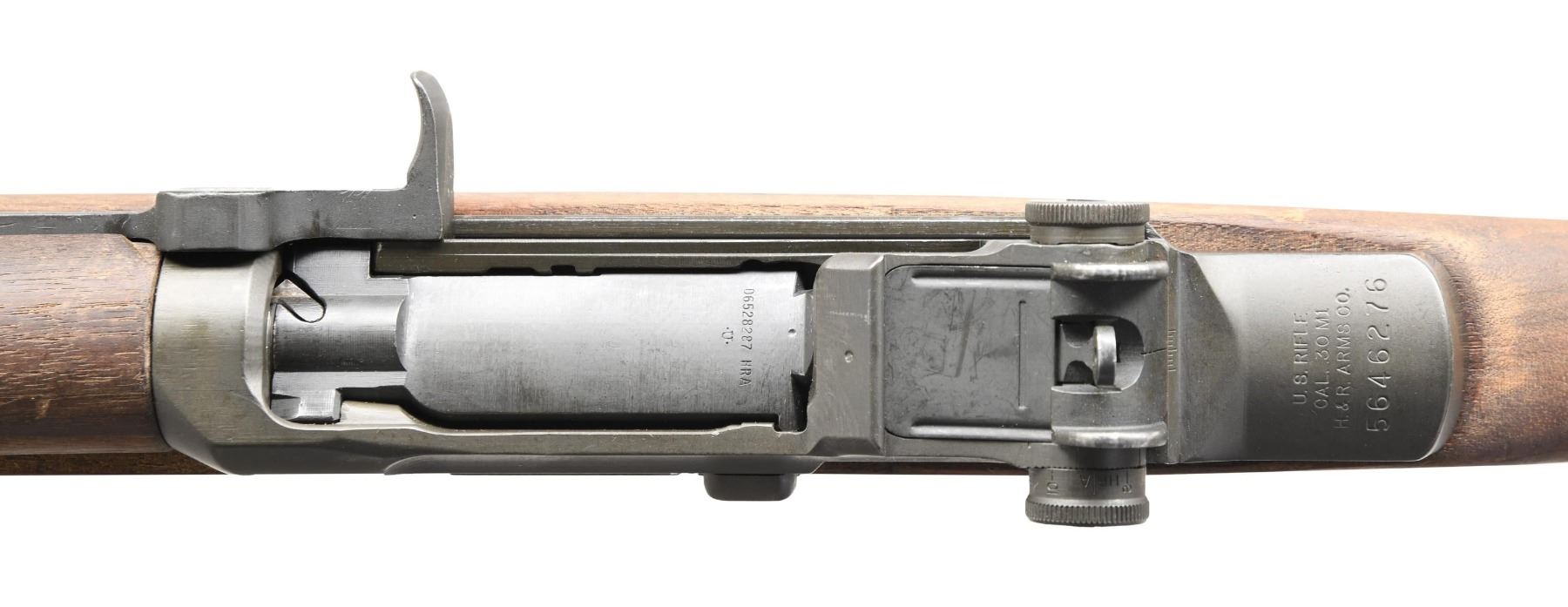 MILITARY RIFLE. Cal. 30-06. S# 5646276. Bbl. 24". Bbl. is marked on right side "HRA 4-55." Throat and muzzle gauges: 1.0. T105E1 aperture rear sight. Blade front sight with wide spaced protective ears. All visible parts' markings are "HRA." High-hump gas cyl. lock. Stamped trigger guard. Walnut stock set. Walnut stock set. Buttstock is marked on the left side with defense acceptance "eagle" and marked under grip with an encircled "P" proof. Buttstock shows evidence of minor hand fitting in trigger housing area. CONDITION: stock set has been cleaned, leaving moderate staining, wear, and handling marks. Buttstock is numbered "1325" on the right rear. Metal shows 80% original Parkerized finish with thinning and light wear. Very good, shiny bore with sharp lands. (24-5425/RW). CURIO. $700-1,000.