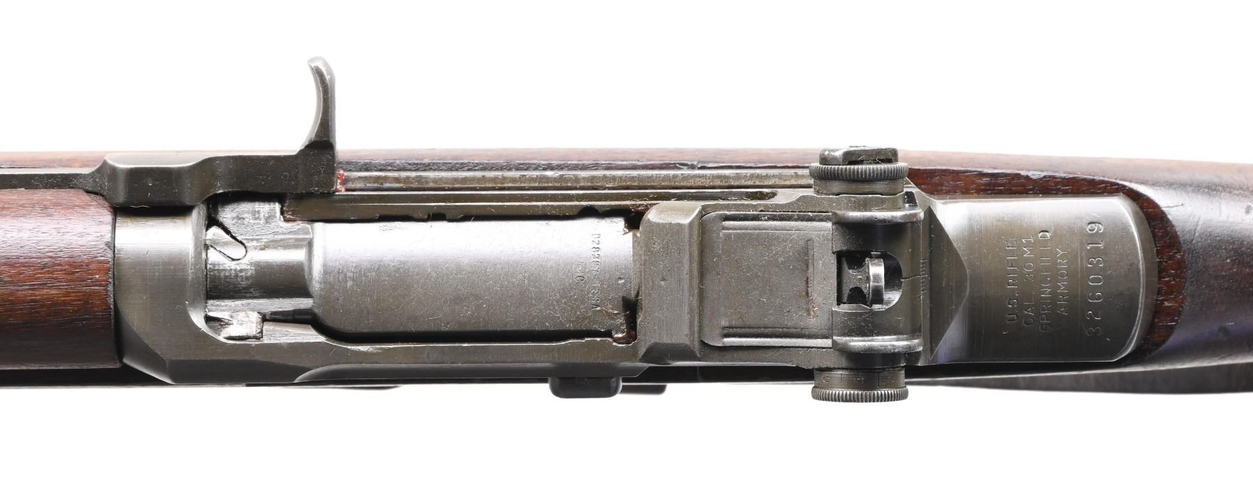 RIFLE. Cal. 30-06. S# 3260319. Bbl. 24". Barrel is marked on the right side "3-S A 9 44". Throat and muzzle gauge 2.0. "Locking Bar" rear sight with "Battle Range" elevation knob. All major parts markings are "SA". Stamped trigger guard. Walnut stock set. Buttstock is marked on the left side with faint boxed acceptance mark which appears to be G.A. W. and "crossed cannons". Boxed "SA" overhaul mark on cheek area. Two encircled "P" proofs under grip. Unmarked Model 1907 brown leather sling with steel hooks. Operating rod does not have the later relief cut. Long fork follower rod. Sling shows wear and flexing. UNNATTCHED ACCESSORIES: cleaning kit in butt. Cleaning rod, M10 in sealed paper tube, canvas cleaning rod case, and CMP sales receipt for the cleaning rods. The sealed foil pack on the paper is not present. CONDITION: stock set has an arsenal rework finish with moderate wear, staining, and handling marks throughout. Metal retains 80% of its arsenal rework finish with areas of thinning and wear. Very good, shiny bore. (24-3817/RW). CURIO. $900-1,400.