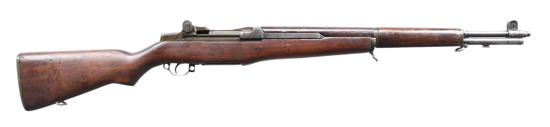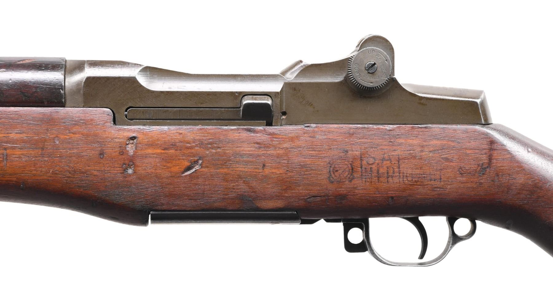 Cal. 30-06. S# 3765152. Bbl. 24". Barrel is marked "3 S A 4 45." Throat gauges 3.0. Muzzle gauges 2.0. "Locking Bar" rear sight with "Battle Range" elevation knob. Blade front sight with protective ears. Receiver is marked on right front leg "S-A 11-68" in electro-pencil, indicating an arsenal over haul in 1968. All major parts' markings are "SA." Trigger housing marked only with drawing #. Milled trigger guard. Walnut stock set. Buttstock is marked on the left side with crossed cannons and a boxed "SA / NFR" a WWII Springfield Armory rebuild mark. The next mark is the G.A.W. final acceptance mark, which is followed by another crossed cannon. The markings are all faint due to the arsenal rework finish. There are two "P" proofs under the grip, one of which is encircled, and "2165" is scratched inside the barrel channel. CONDITION: the stock set with its arsenal rework finish has moderate wear and handling marks throughout. The metal retains nearly 50% of its original finish, with thinning, wear, and small areas of oxidation. Bore has worn lands turning dark in the grooves. (24-3907/RW). CURIO. $800-1,200.