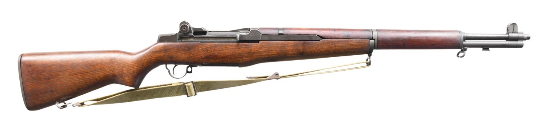MILITARY RIFLE. Cal.30-06. S# 5889791. Bbl. 24". Markings on the right side include "SA" and "6 55" "P" proof and "defense acceptance eagle." Throat gauges 1.0 and muzzle gauges less than 1.0. T105E1 aperture rear sight. Blade front sight with protective ears. Operating rod and bolt marked "SA." Hi-Hump gas cylinder lock and front sight appear to be replacements. Trigger housing assembly with stamped guard has "HRA" markings. Walnut stock set. Buttstock has the boxed "Defense Acceptance Eagle' on the left side and the encircled "P" proof under grip. Front handguard appears to be hardwood replacement stained to match. Vintage web sling. CONDITION: stock set has a professional cleaning of the original finish. There is a small loss of wood in the buttplate area. The metal retains a large percentage of its original finish with thinning and wear. Very good, shiny bore but with small areas of fouling. (24-3819/RW). CURIO. $900-1,400.