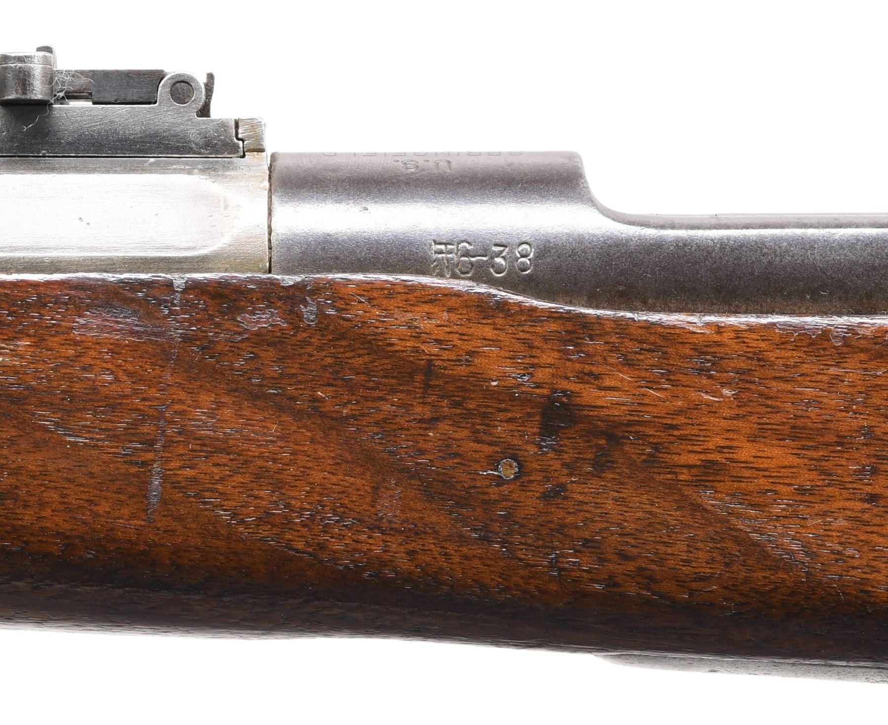 MILITARY RIFLE. Cal. 30-06. S# 1031979. Bbl. 24". Very early production barrel, marked behind the front sight "RIA", a flaming bomb, and "7-06". Ladder rear sight graduated to 2850 yards. Flat windage and elevation knobs. Blade front sight. Receiver has an added marking on the left side at the front, which appears as an oriental character followed by "6-38". Remington-marked replacement bolt. All milled furniture. Non-matching walnut stock set. Buttstock is from 1903-A3 production with brass reinforcing pins. UNNATTACHED ACCESSORIES: nickel-plated oiler in the butt. CONDITION: stock set shows hobbiest gunsmith type fitting, notably around cut-off recess and attempts to tighten the barrel bands. The finish has some added gloss over the wear and numerous handling marks. The metal has wear and is turning overall gray with small areas of cleaned oxidation. Bore has moderately worn lands, turning dark in the grooves. (24-3906/RW). CURIO. $700-1,000.
