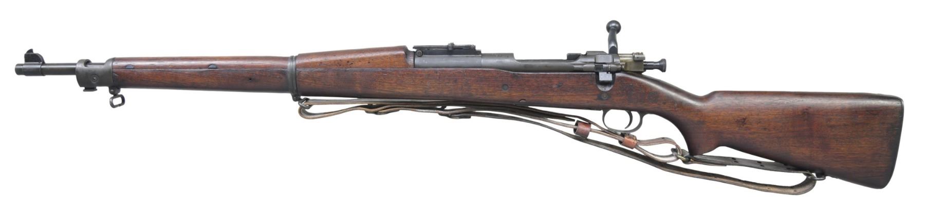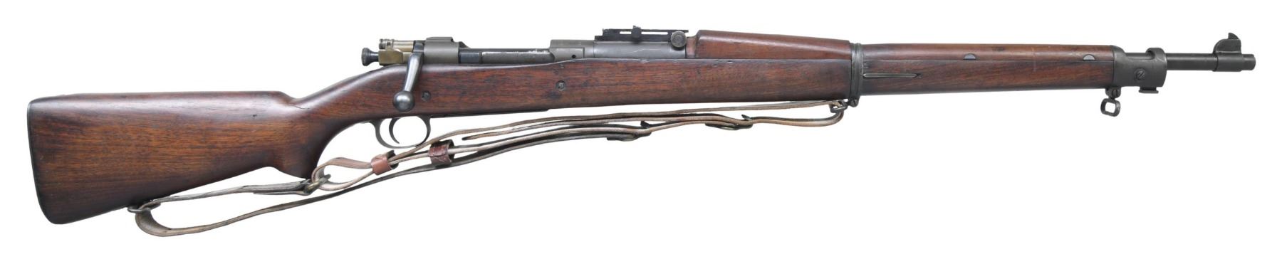 RIFLE WITH TYPE "C" STOCK. Cal. 30-06. S# 1241157. Bbl. 24". The replacement barrel is marked "H.S. (flaming bomb) 3-44." Ladder rear sight with volley notch graduated to 2850 yards. Sight is mounted on Remington base without lightning cuts. Blade front sight. Bolt is from Smith Corona 1903-A3. Safety marked "R." All milled furniture, including smooth trap buttplate. Original type "C" pistol grip walnut stock set with original finish and crisp markings. Boxed "S.A. / G.A.W." and "crossed cannons" on the left side. Two encircled "P" proofs under grip. Model 1907 leather sling marked "LAWRENCE." UNNATTACHED ACCESSORIES: nickel-plated oiler in butt. CONDITION: stock set has moderate wear and handling marks but has a good appearance commensurate with careful service. Metal has 80% of its arsenal-reworked Parkerization with thinning and wear. Very good, shiny bore with sharp lands. PROVENANCE: from the collection of Mark Ivey Godfrey. (42-5274/RW). CURIO. $600-900.