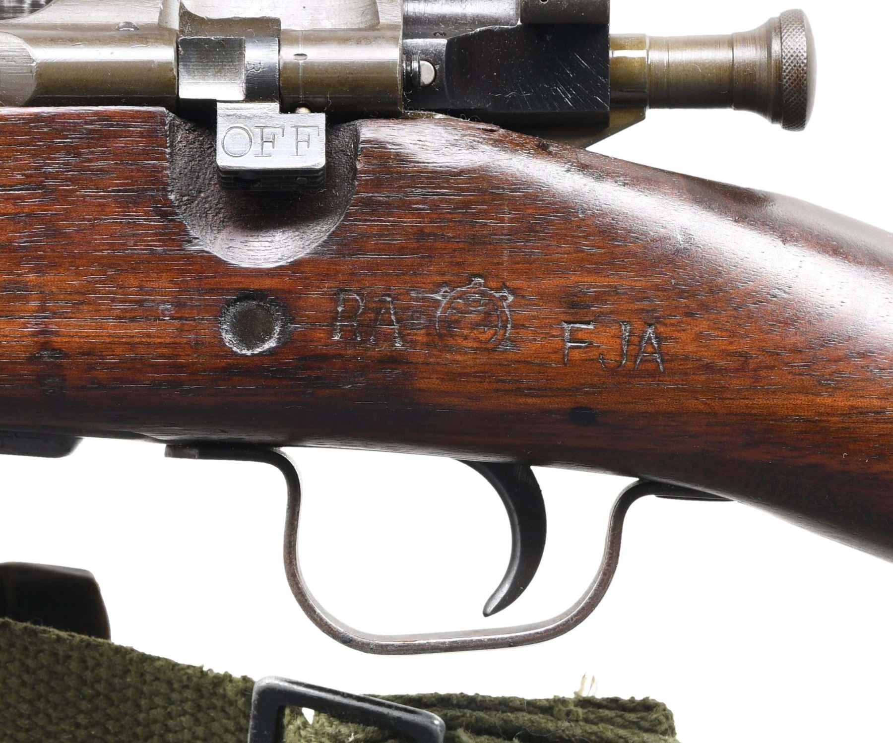 MILITARY RIFLE. Cal. 30-06. S# 3981604. Bbl. 24". Barrel is marked behind front sight "RA" with a flaming bomb and "8-43." Aperture rear sight graduated to 800 yards. Blade front sight. Bolt and cut-off parts marked "R." All stamped furniture, including a fine checkered buttplate and large bow trigger guard. Matching walnut stock set. Buttstock is marked on the left side with "RA" crossed cannons and "FJA." Partial encircled "P" proof under grip. Tiny "W" behind trigger guard. Four assembly Marks ahead of trigger guard. Green web sling. CONDITION: stock set has moderate wear and handling marks. notable dents on left side over magazine and scratches under forend due to band removal. Metal retains its correct mix of original finishes, both blue and parkerization with light wear. Very good, shiny 2-groove bore. (24-3831/RW). CURIO. $500-800.