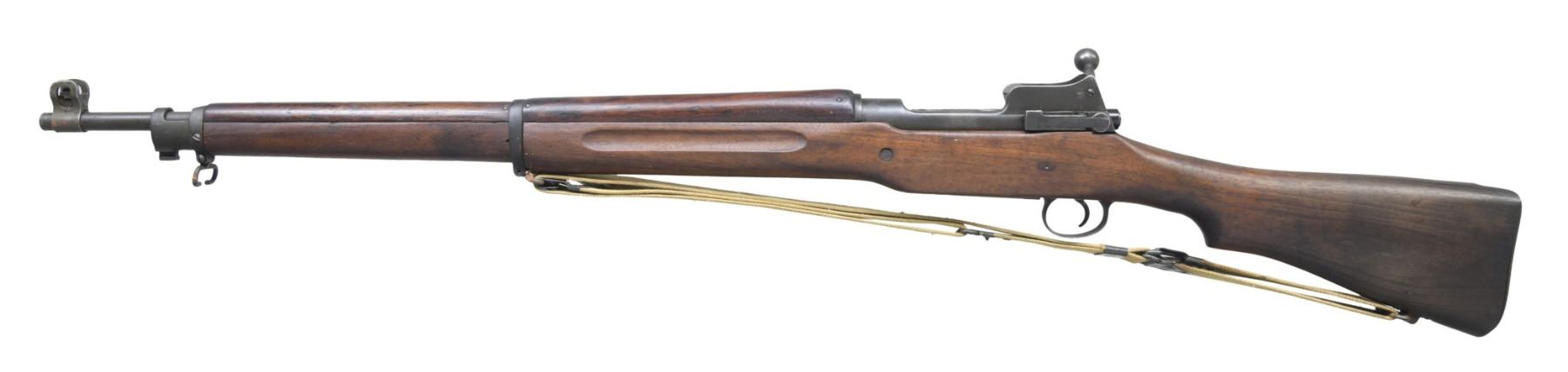 RIFLE. Cal. 30-06. S# 95454. Bbl. 26". marked behind front sight "W"/"flaming bomb" / "12-17". Bolt marked with "flaming bomb". Cocking piece and front sight base marked "W". Bolt shroud, Rear sight assembly and buttstock marked "E". Receiver marked on left rail with "eagle" acceptance mark and encircled star which indicates this to be an early production rifle kept for stateside use due to interchangeability issues. Ladder aperture rear sight graduated to 1600 yards. Blade front sight with protective ears. Scarce sheet metal follower which allows bolt to close correctly during the manual of arms. Unmarked walnut stock set. Kerr "NOBUKL" web sling. UNNATTACHED ACCESSORIES: nickel plated oiler in butt. CONDITION: replacement buttstock has light wear and staining. Handguards are a darker hue with slightly more wear. Metal retains a large degree of an arsenal rework parkerization with light wear. Bore has moderately worn lands turning dark in the grooves. (24-4148/RW). CURIO. $300-500.