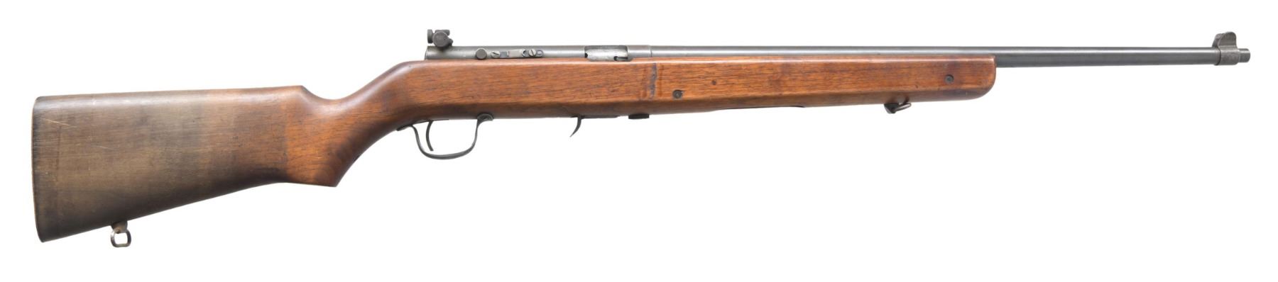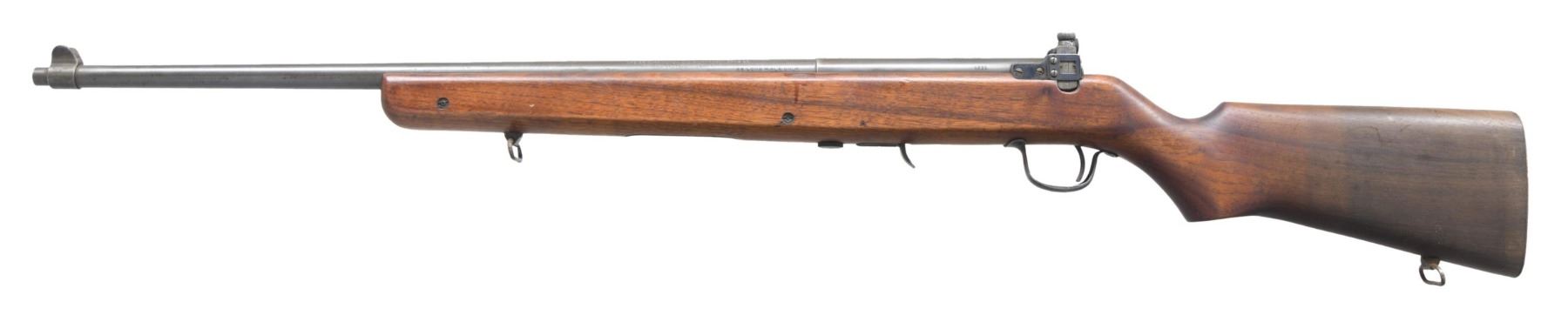 Cal. 22 LR. S# 5635. Heavy 23" bbl. Protected blade front sight & Redfield receiver peep sight. Operating rod actuated by slot in Walnut stock. MAGS: NONE. CONDITION: rifle shows water damage on large portions of buttstock along with oxidation on buttplate. Metal has faded gray & patina appearance. Wood shows previous light sanding & refinish. Shiny bore with strong rifling. (24-4165/MD). CURIO. $500-800.