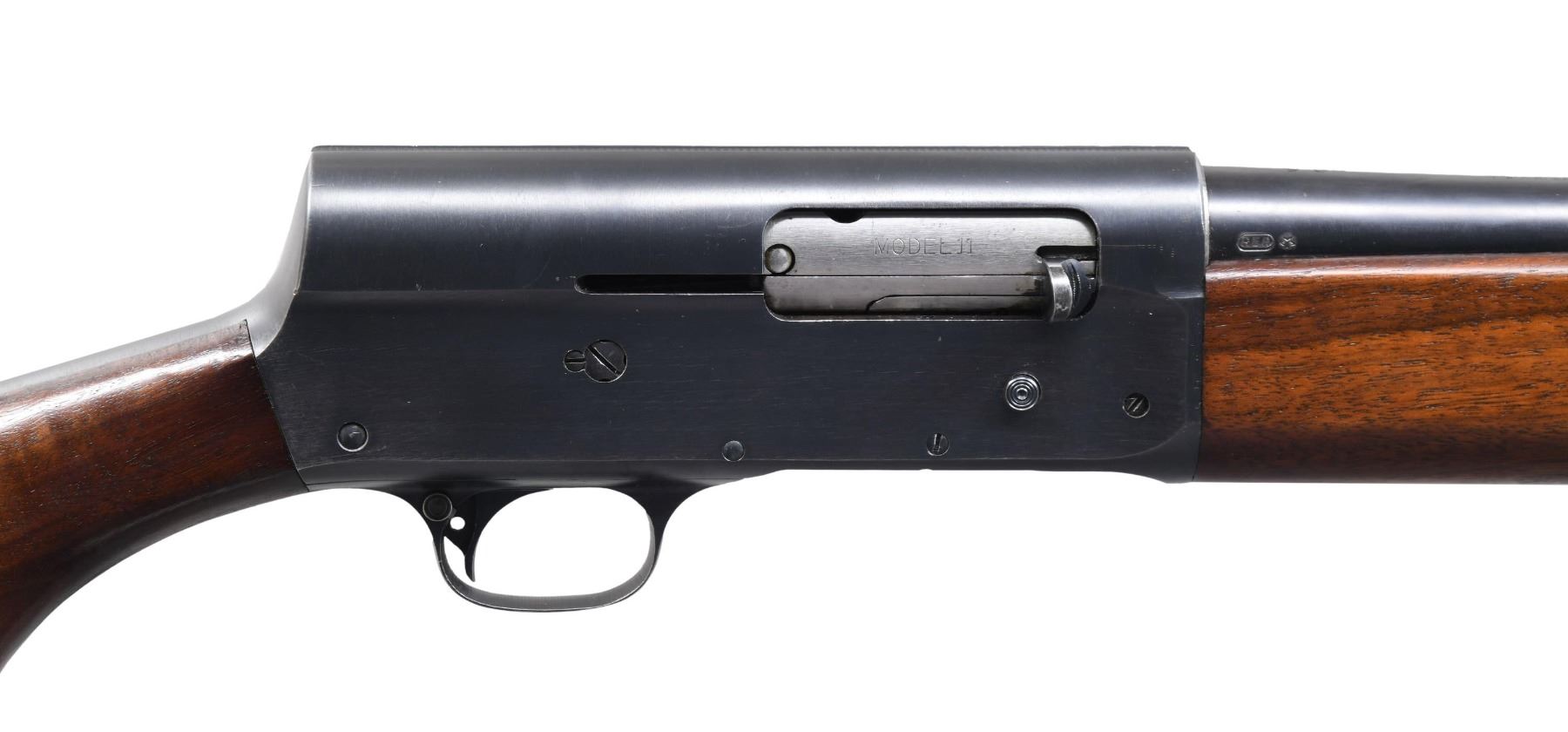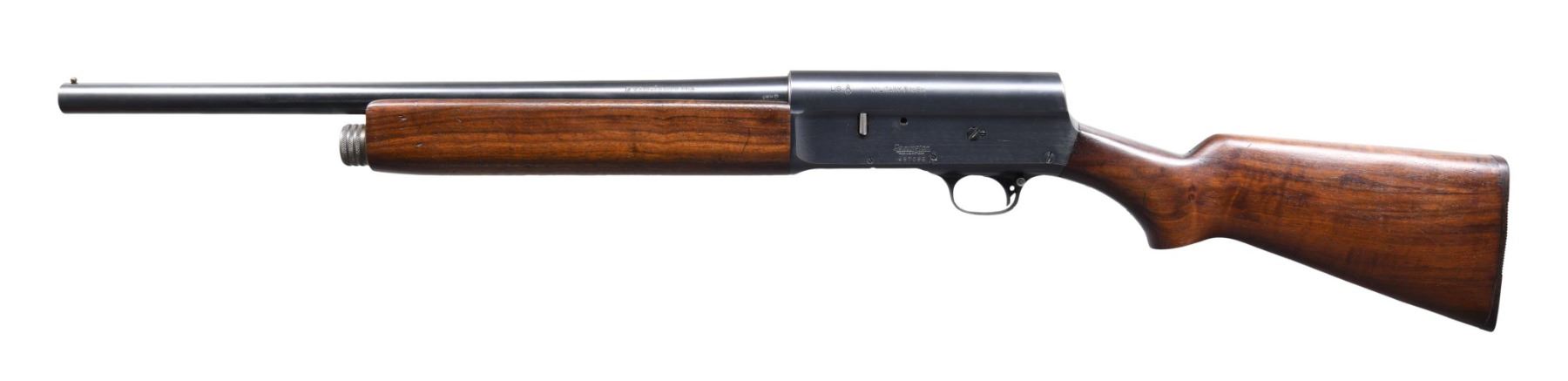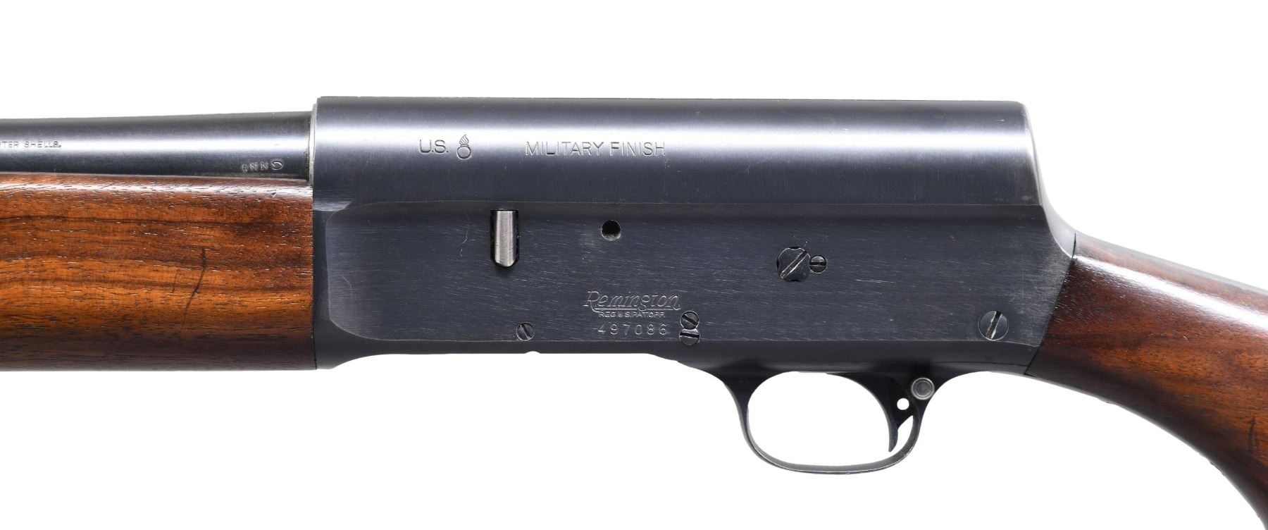 SEMI AUTO SHOTGUN. Cal. 12GA. 2 3/4". S# 497086. Bbl. 20" The US/Ordnance bomb is marked "ANN" (March 1944)-dated, with Mod choked (no choke marking) bbl with brass bead front sight. US/Ordnance bomb and "Military Finish"-marked receiver. FJA and crossed cannon cartouche is present on the left side of the stock. Remington Bakelite serrated buttplate. CONDITION: overall very fine, with 97% original factory finish, showing a few minor handling marks primarily on the lower tang. Matching serial number on the bbl. Very good stock with some minor handling marks and a fine hairline crack on the forearm. Mirror bore. A truly fine example. PROVENANCE: from the collection of Mark Ivey Godfrey. (24-5264/ZAL). CURIO. $700-1,100.